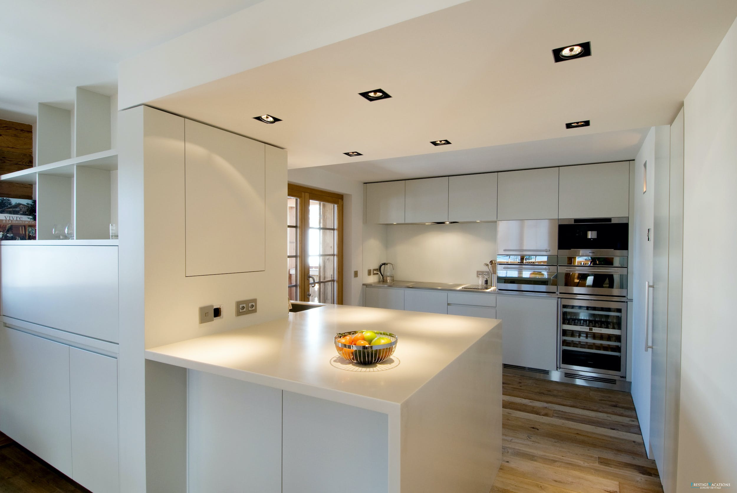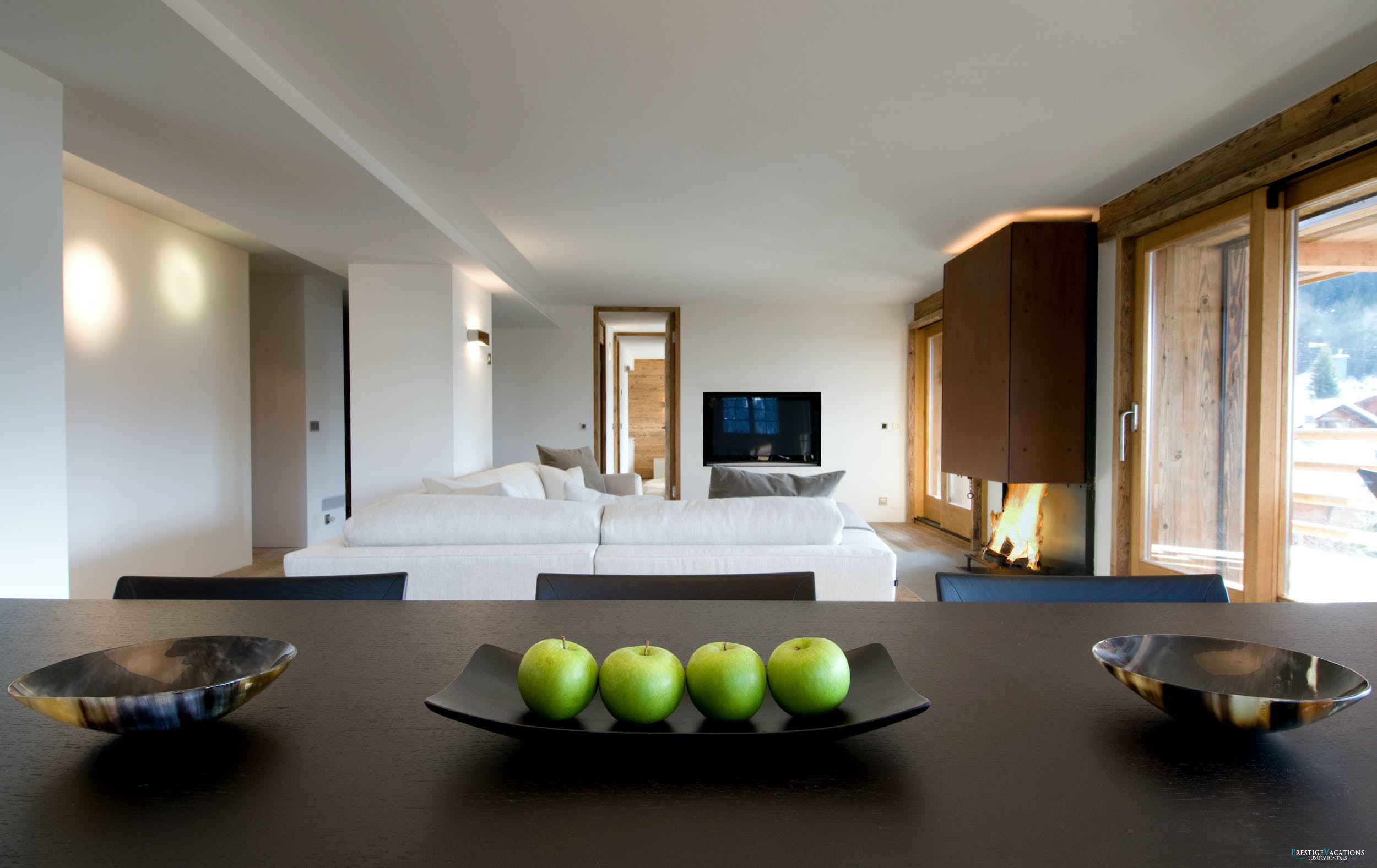 Parfait pour les familles ou les petits groupes, le chalet peut accueillir huit adultes et deux enfants dans quatre chambres généreusement dimensionnées. La cuisine ultramoderne est équipée d'appareils Miele haut de gamme, comprenant un cave à vin et une machine à café intégrée, et s'ouvre sur un espace repas et salon spacieux centré autour d'une cheminée contemporaine.