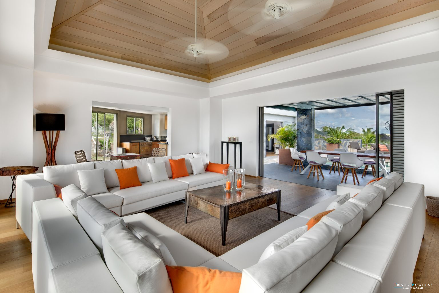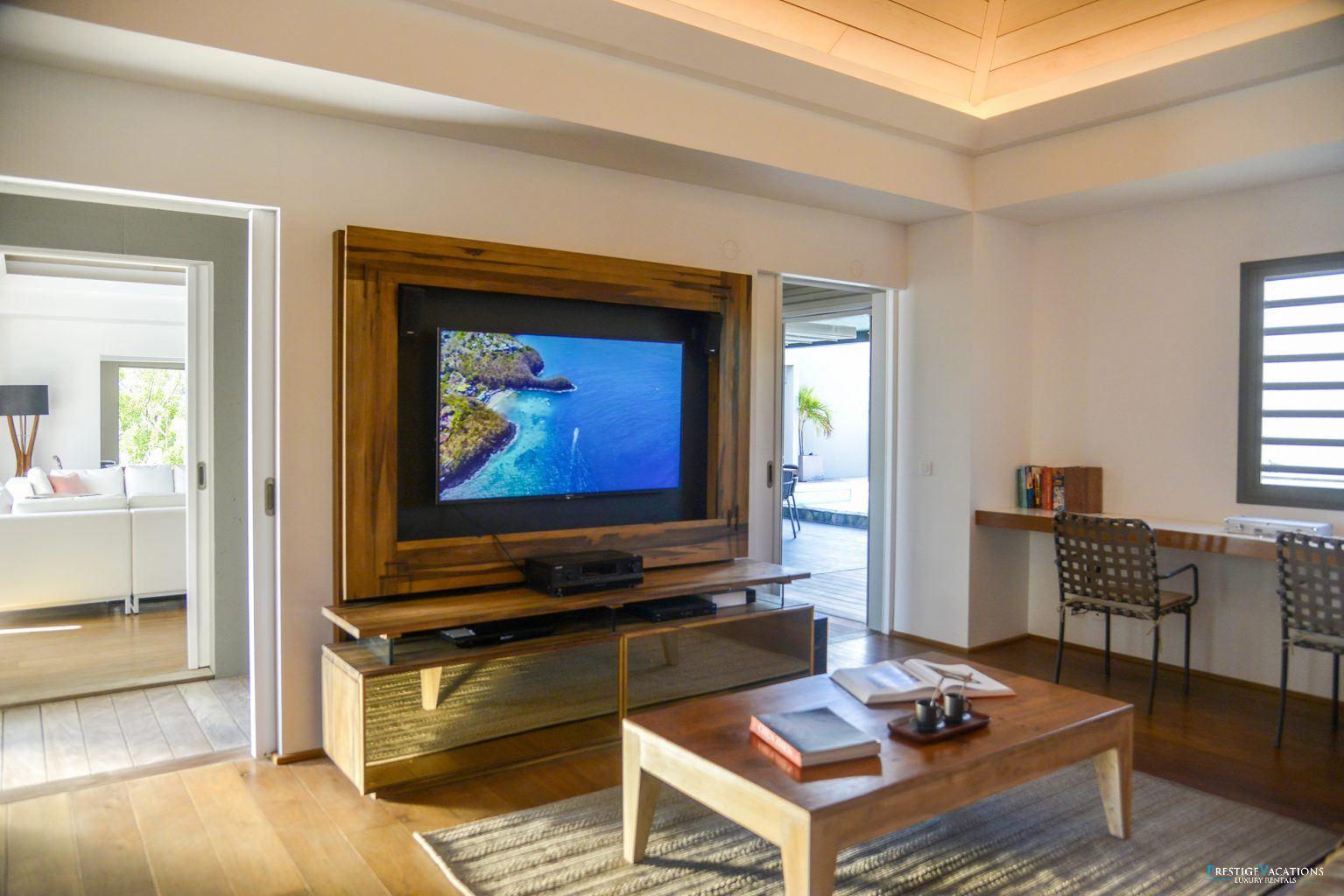Conçue pour accueillir confortablement 7 couples ou un grand groupe d’amis, la villa séduit par ses proportions généreuses et son atmosphère raffinée. Le salon spacieux et baigné de lumière invite à des moments conviviaux, tandis qu’une salle TV climatisée permet de profiter d’instants plus intimes dans un confort absolu. La cuisine moderne et l’espace repas extérieur sous terrasse couverte offrent un cadre idéal pour savourer des repas en toute convivialité, face à l’atmosphère paisible de l’île.