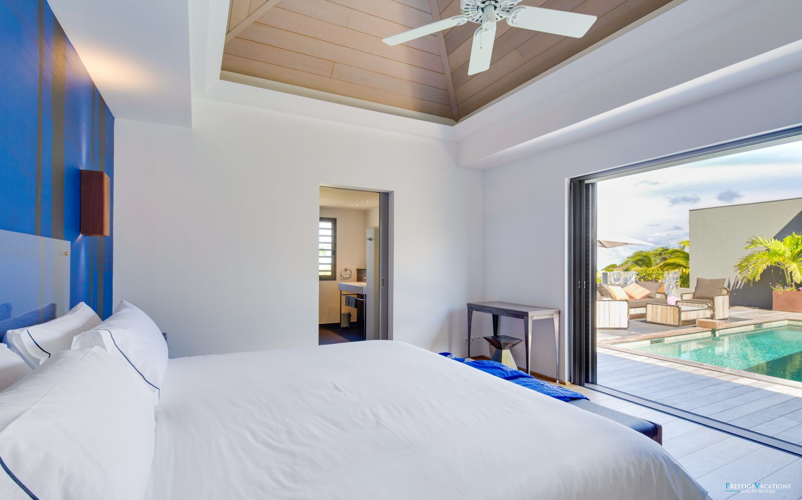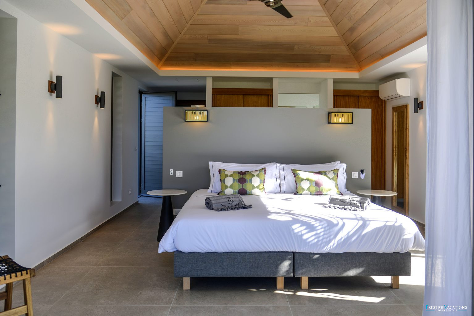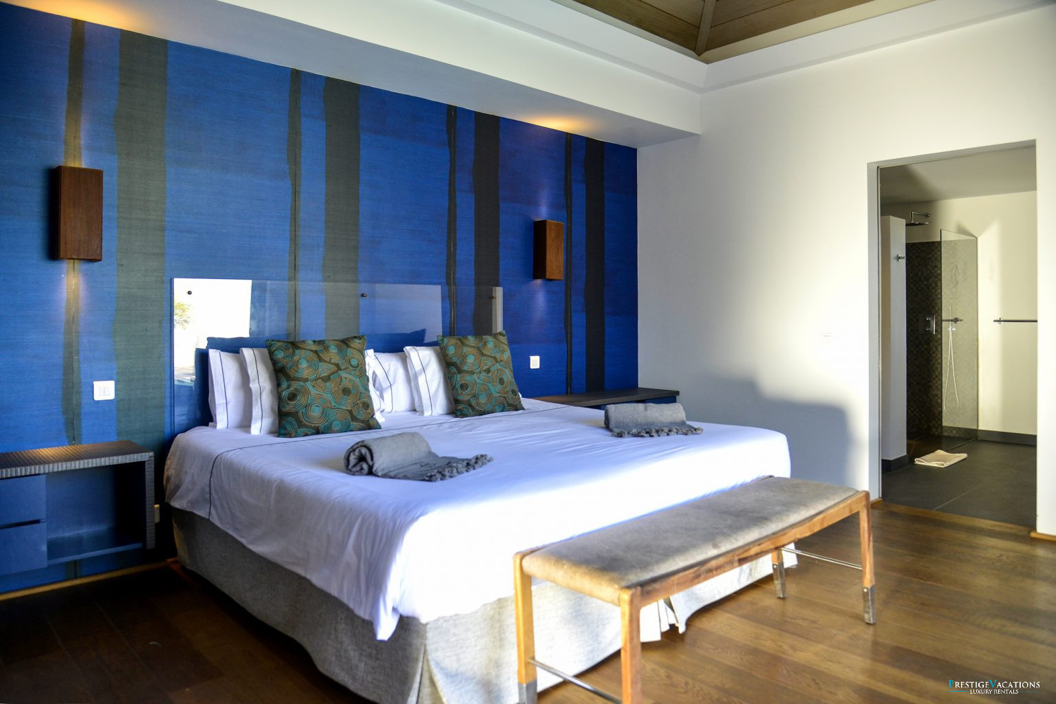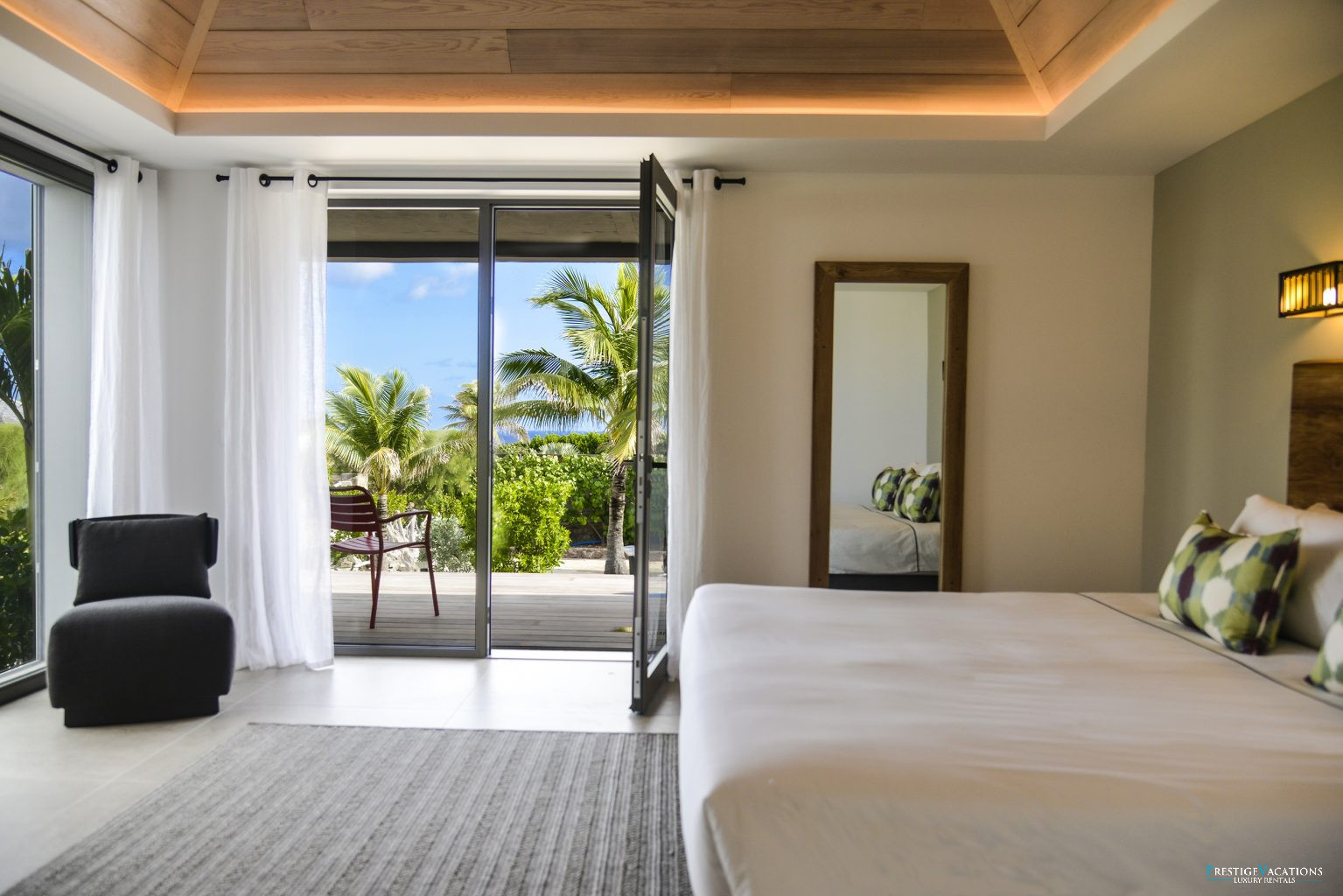 Nichée dans le prestigieux Domaine privé du Levant à Petit Cul-de-Sac, la Villa Lagon Vert illustre l’art de la location de villa luxe à Saint-Barth. Récemment rénovée, cette propriété d’exception dispose désormais de 7 suites élégantes, chacune dotée de hauts plafonds, de larges ouvertures laissant entrer une abondance de lumière naturelle, d’une salle de bain privative et de lits king-size modulables en lits jumeaux selon vos besoins.
