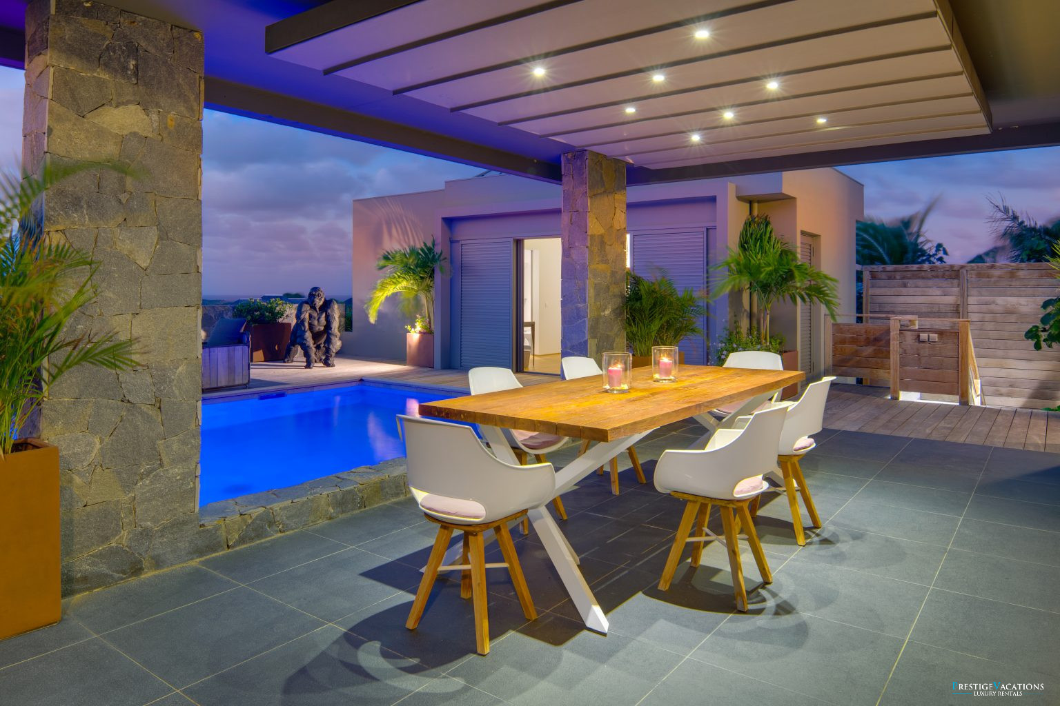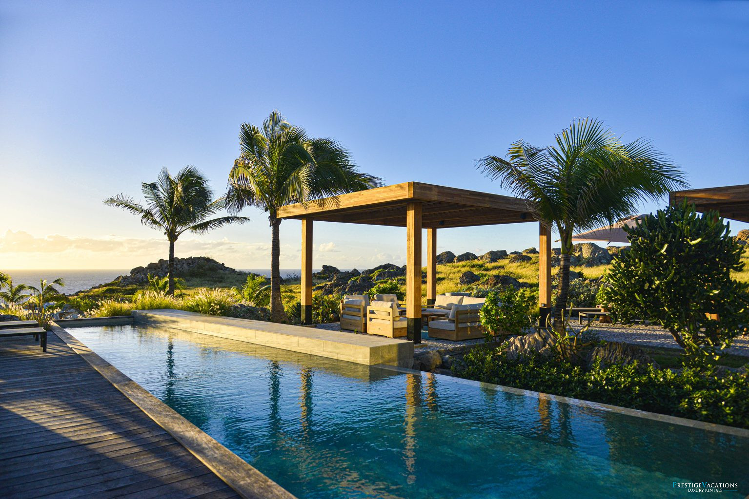 À l’extérieur, deux piscines viennent sublimer l’expérience. Entourées de terrasses en bois et de coins lounge élégants, elles invitent aussi bien au bain de soleil qu’à la détente ombragée sous les parasols. Une 8ème chambre optionnelle, située dans un bungalow indépendant, permet d’accueillir encore plus d’invités en toute intimité.