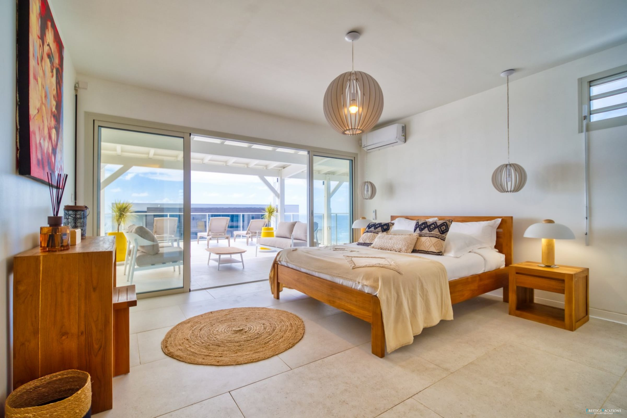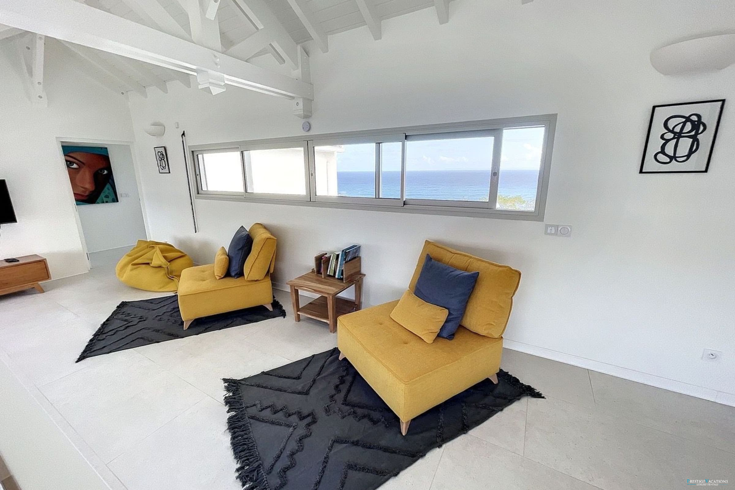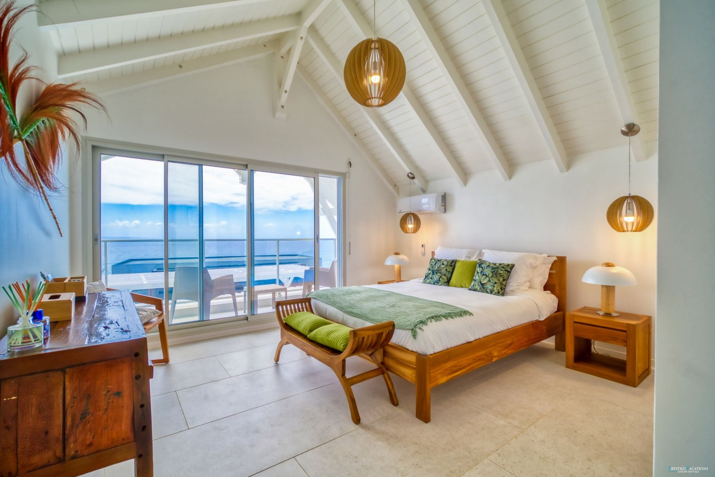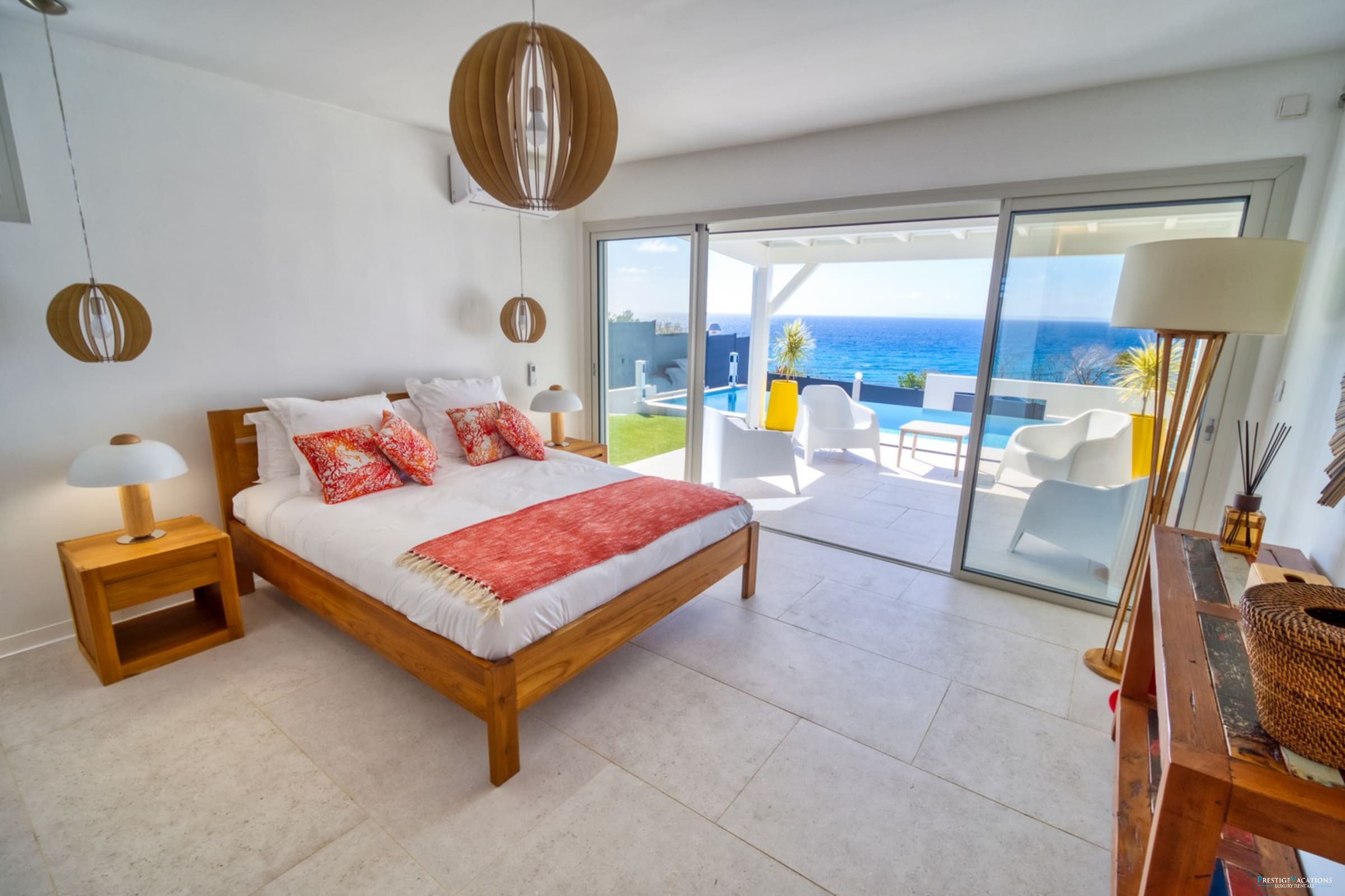 À l’étage, la villa révèle un espace dédié au repos et à la convivialité, aménagé avec de confortables canapés, une télévision câblée, des jeux de société et une sélection de livres consacrés à la Guadeloupe. Deux nouvelles suites parentales, situées de part et d’autre, disposent chacune d’un balcon privatif avec salon extérieur, offrant une vue mer encore plus saisissante depuis cette hauteur. L’ensemble de la maison a été pensé pour préserver l’intimité de chacun tout en favorisant les moments de partage.