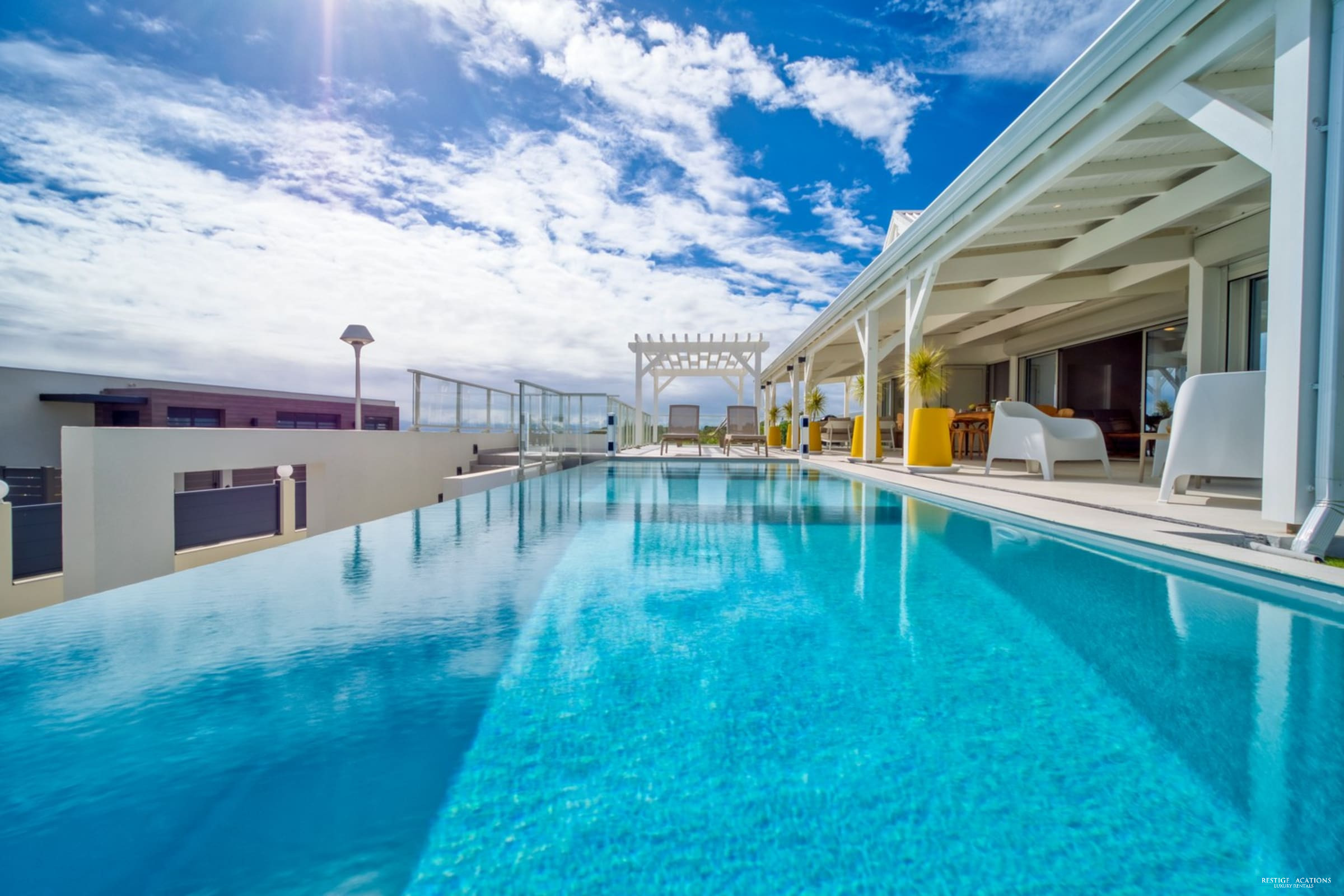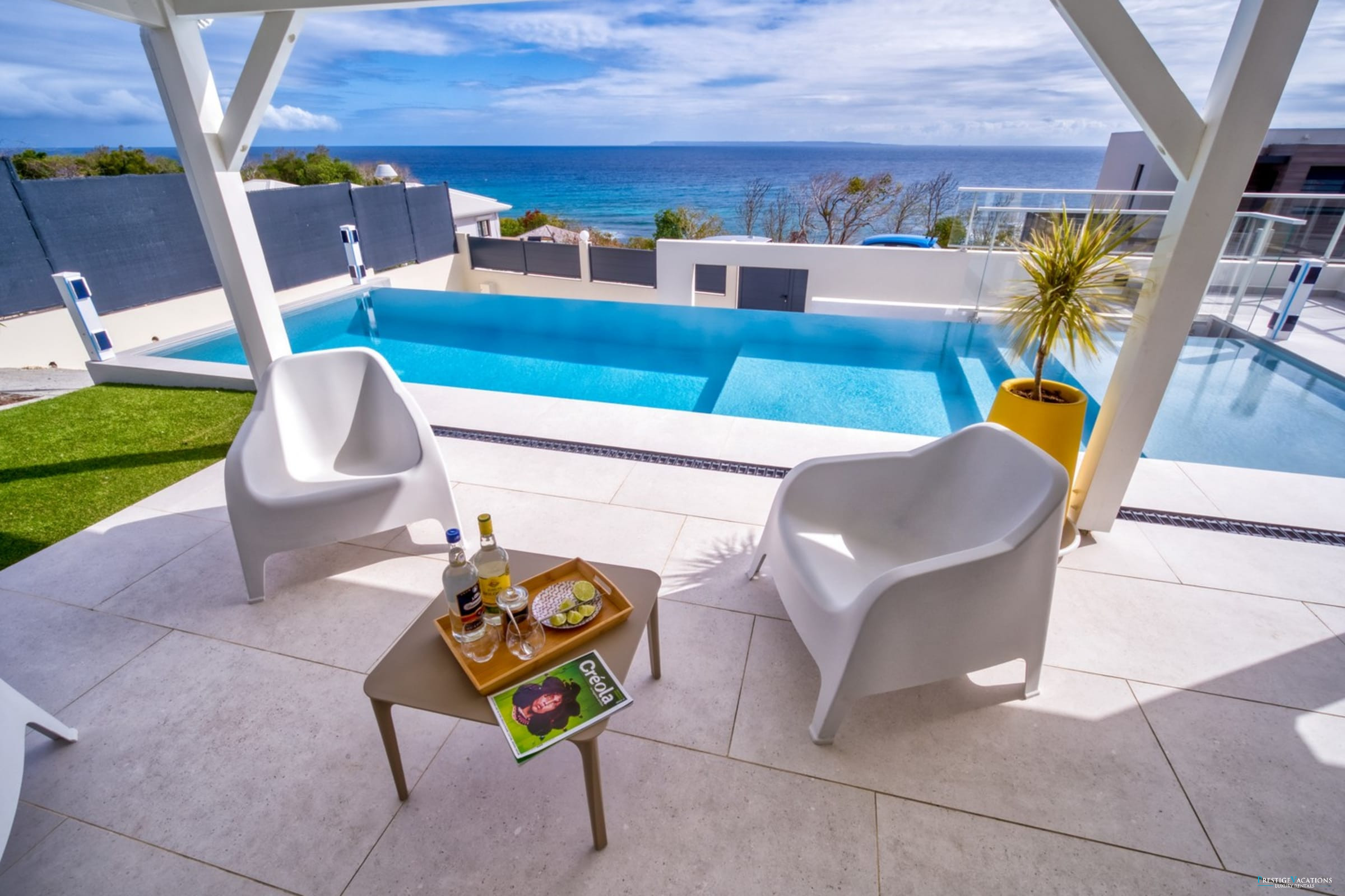 Les espaces extérieurs ont été conçus comme une véritable extension de la villa. La piscine au sel à débordement, sécurisée par une alarme périmétrique, devient un lieu central de détente, aussi apprécié par les adultes que par les plus jeunes. Transats, salons extérieurs, coin lounge, balcon avec barbecue et espaces ombragés permettent de profiter pleinement du climat tropical à toute heure de la journée. À seulement cinquante mètres à pied, un portillon privé donne accès à un sentier côtier longeant le littoral et menant directement à la plage de l’Anse des Rochers, offrant une expérience rare de bord de mer accessible à pied.