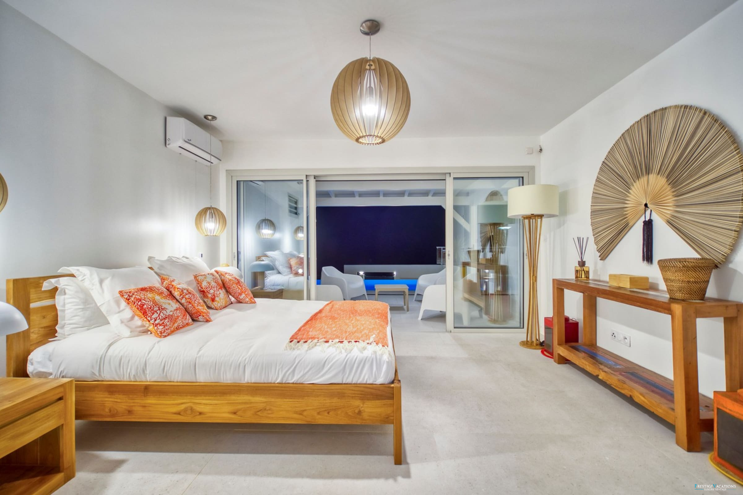 Dès l’arrivée, la Villa Sand Blue séduit par son élégance contemporaine et la qualité de ses aménagements. Pensée pour accueillir jusqu’à huit adultes et un enfant, elle propose quatre suites parentales climatisées, toutes orientées vers la mer, garantissant à chaque hôte un confort optimal et une parfaite intimité. Chaque suite dispose d’un bureau, d’un dressing individuel, d’une salle de bain moderne avec douche à l’italienne et de toilettes privatives, dans une ambiance lumineuse et apaisante où le bleu de l’océan accompagne chaque réveil.