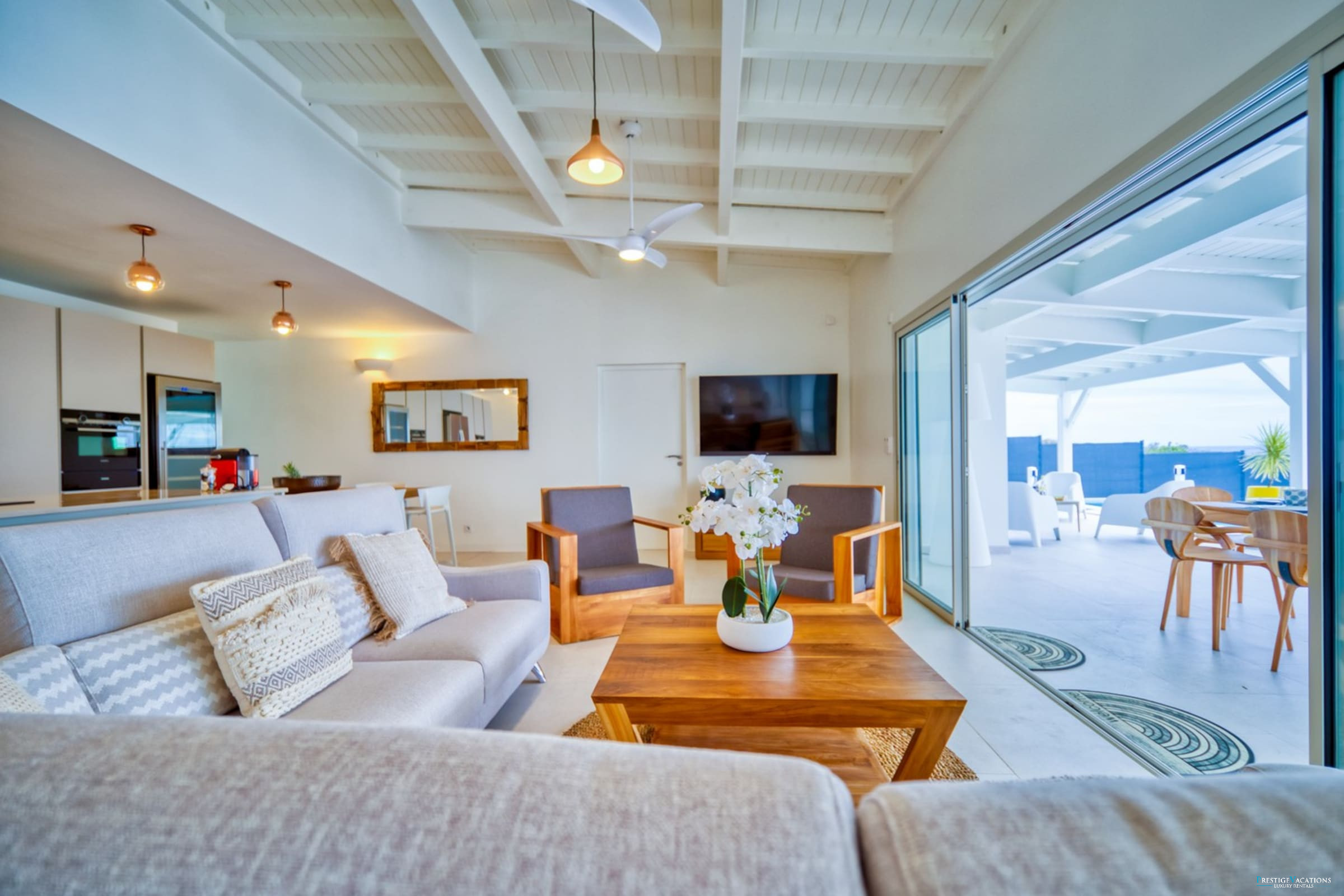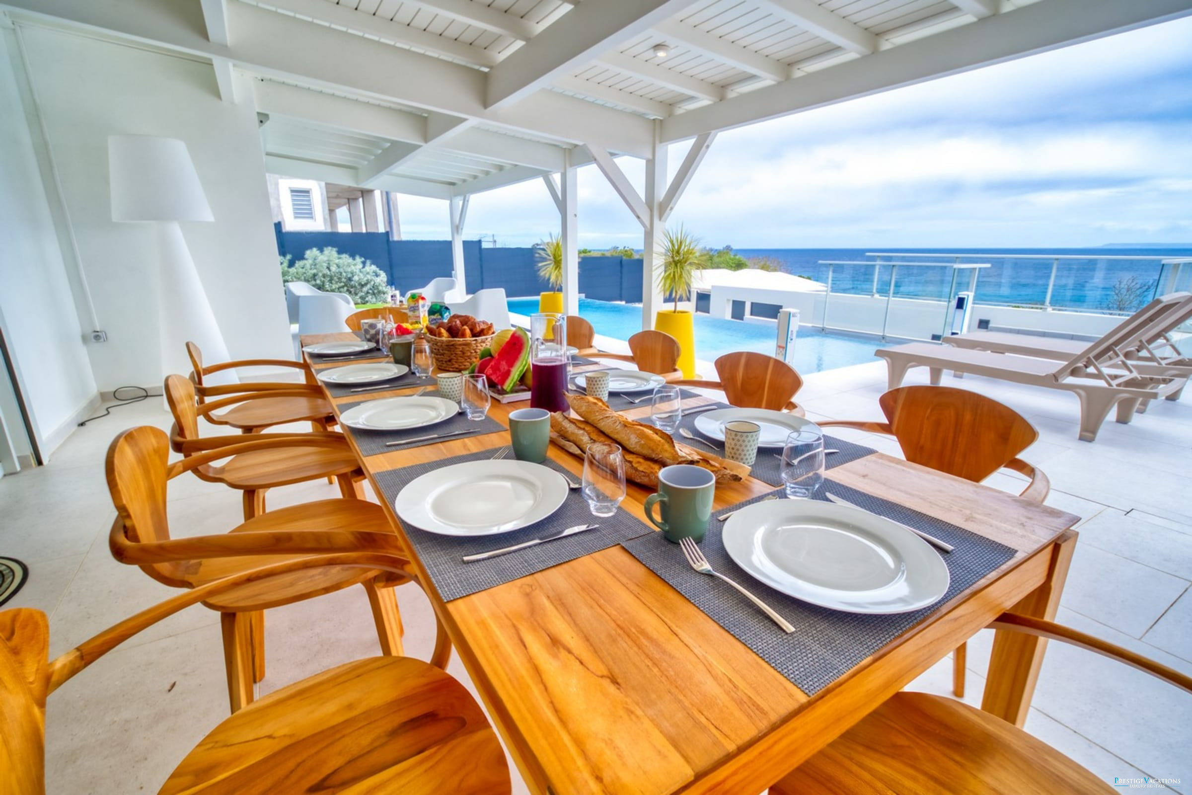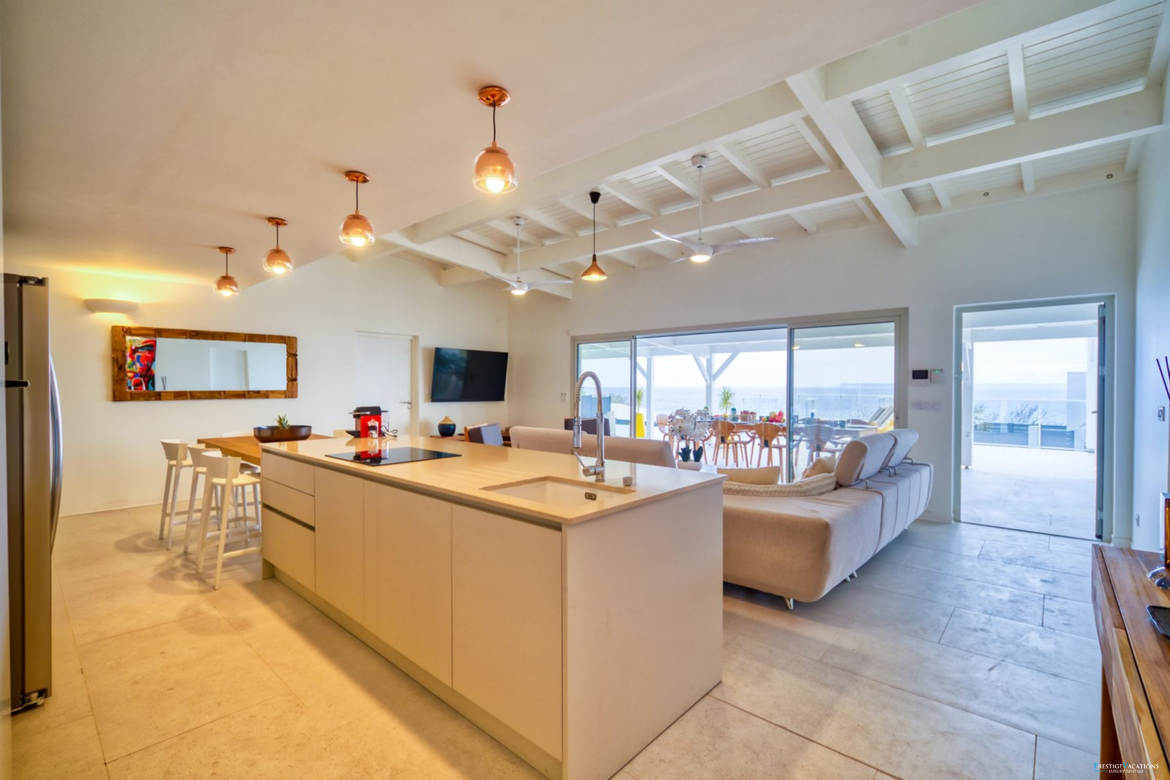 Le cœur de la villa s’organise autour d’un vaste espace de vie ouvert, convivial et baigné de lumière. La cuisine sur mesure, entièrement équipée avec électroménager haut de gamme, cave à vin, réfrigérateur américain, cafetière Nespresso, doubles fours et lave-vaisselle, invite aussi bien à la préparation de repas en famille qu’à l’organisation d’un cours de cuisine créole privé. Elle s’ouvre naturellement sur le salon et la terrasse, où une grande table permet d’accueillir confortablement jusqu’à dix convives face à la mer et à l’horizon guadeloupéen.