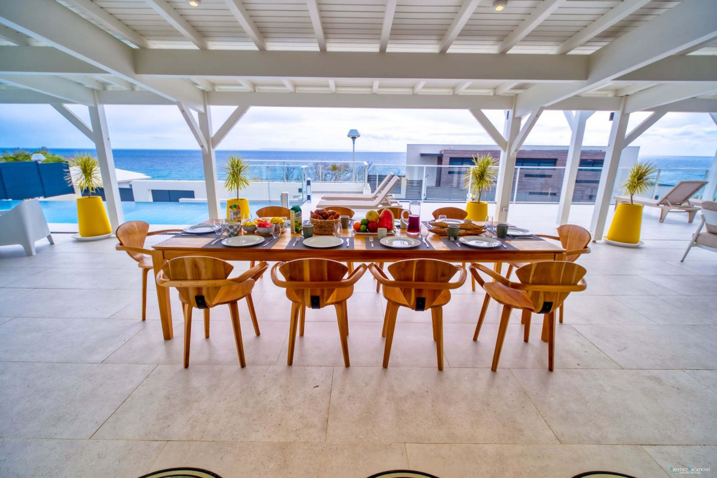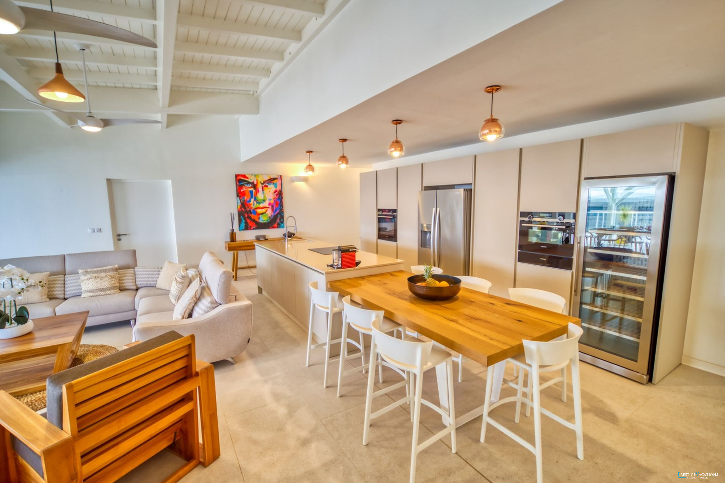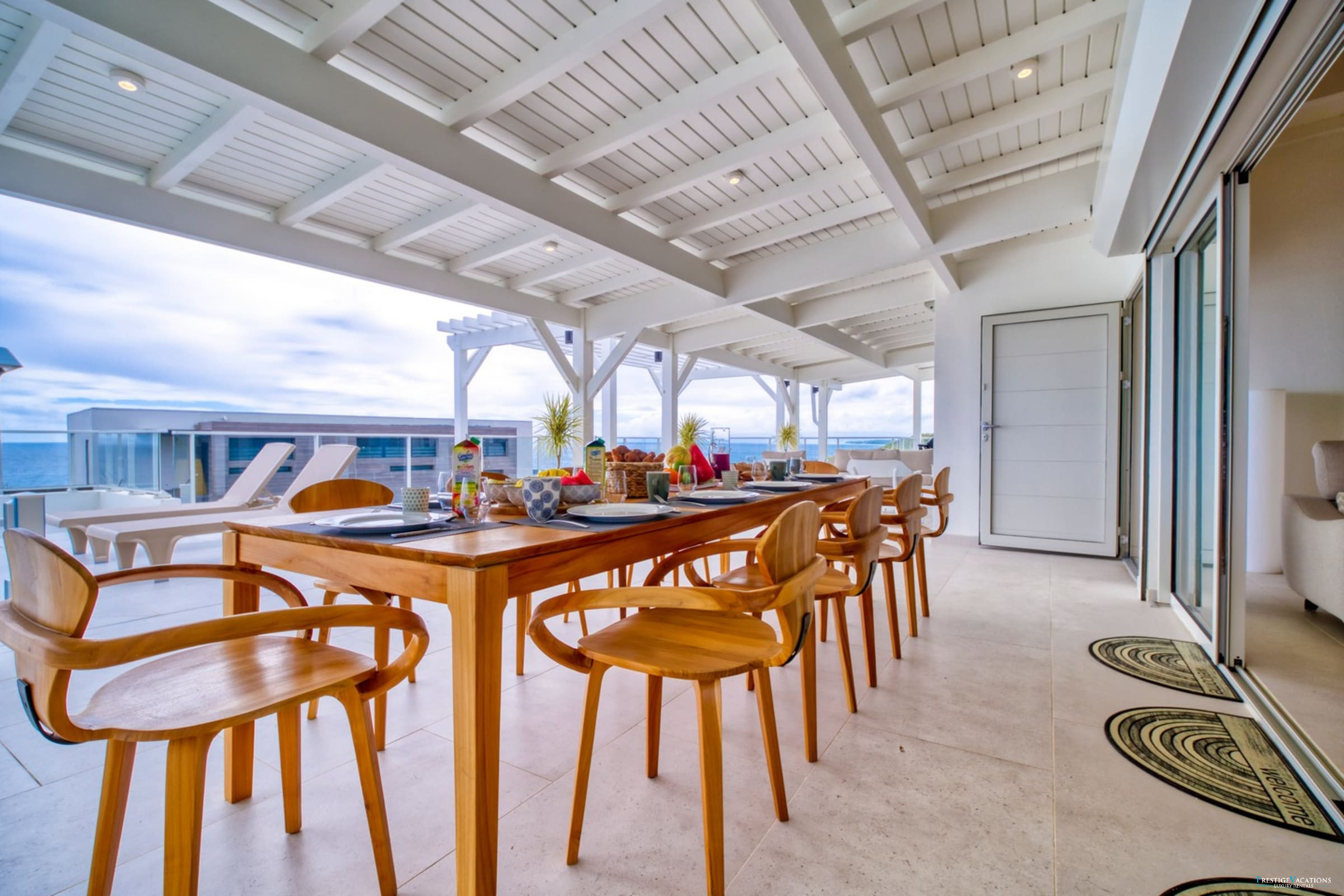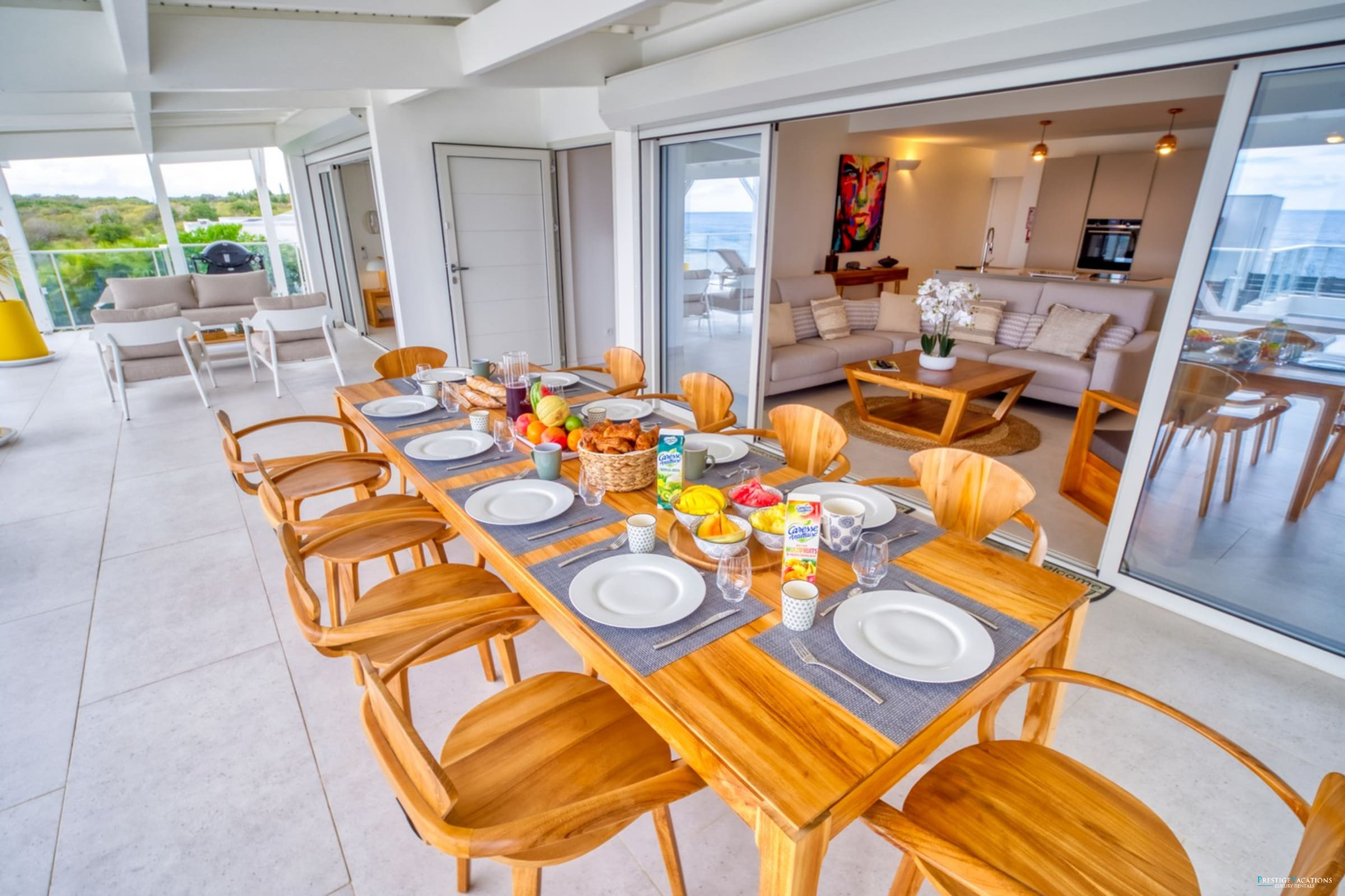 Le cœur de la villa s’organise autour d’un vaste espace de vie ouvert, convivial et baigné de lumière. La cuisine sur mesure, entièrement équipée avec électroménager haut de gamme, cave à vin, réfrigérateur américain, cafetière Nespresso, doubles fours et lave-vaisselle, invite aussi bien à la préparation de repas en famille qu’à l’organisation d’un cours de cuisine créole privé. Elle s’ouvre naturellement sur le salon et la terrasse, où une grande table permet d’accueillir confortablement jusqu’à dix convives face à la mer et à l’horizon guadeloupéen.