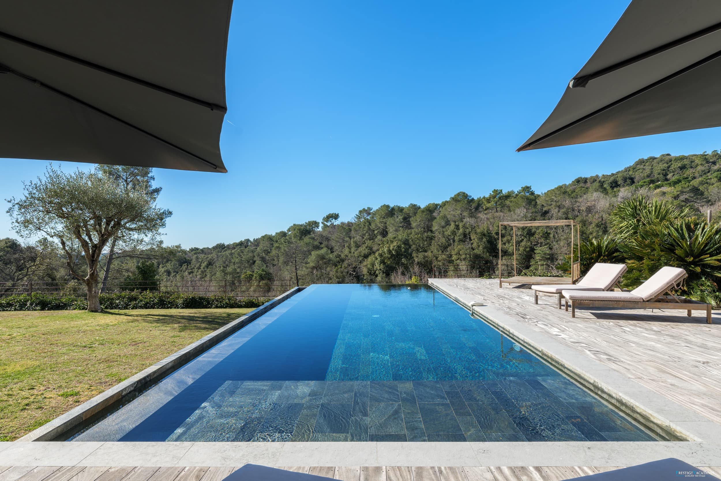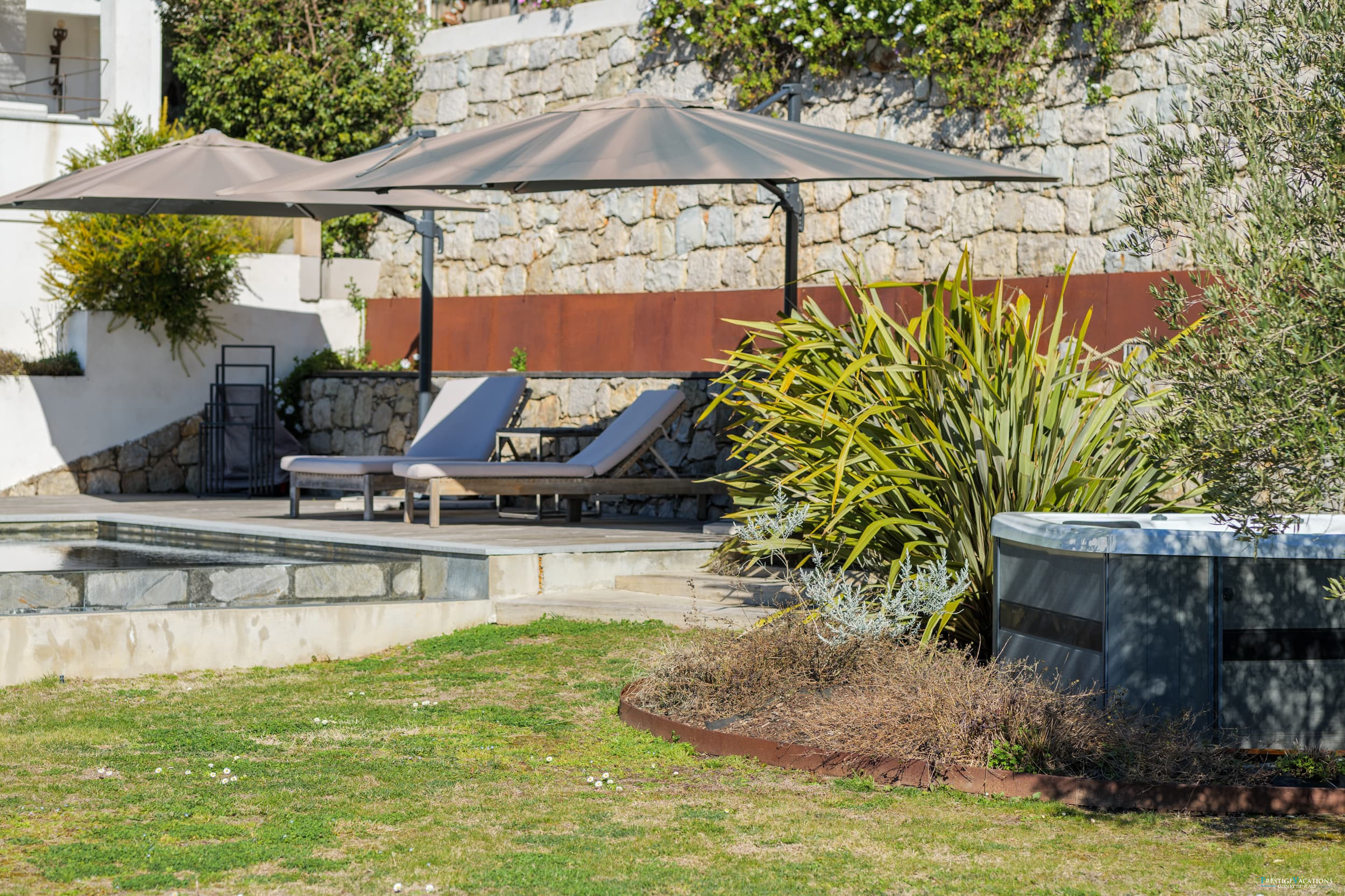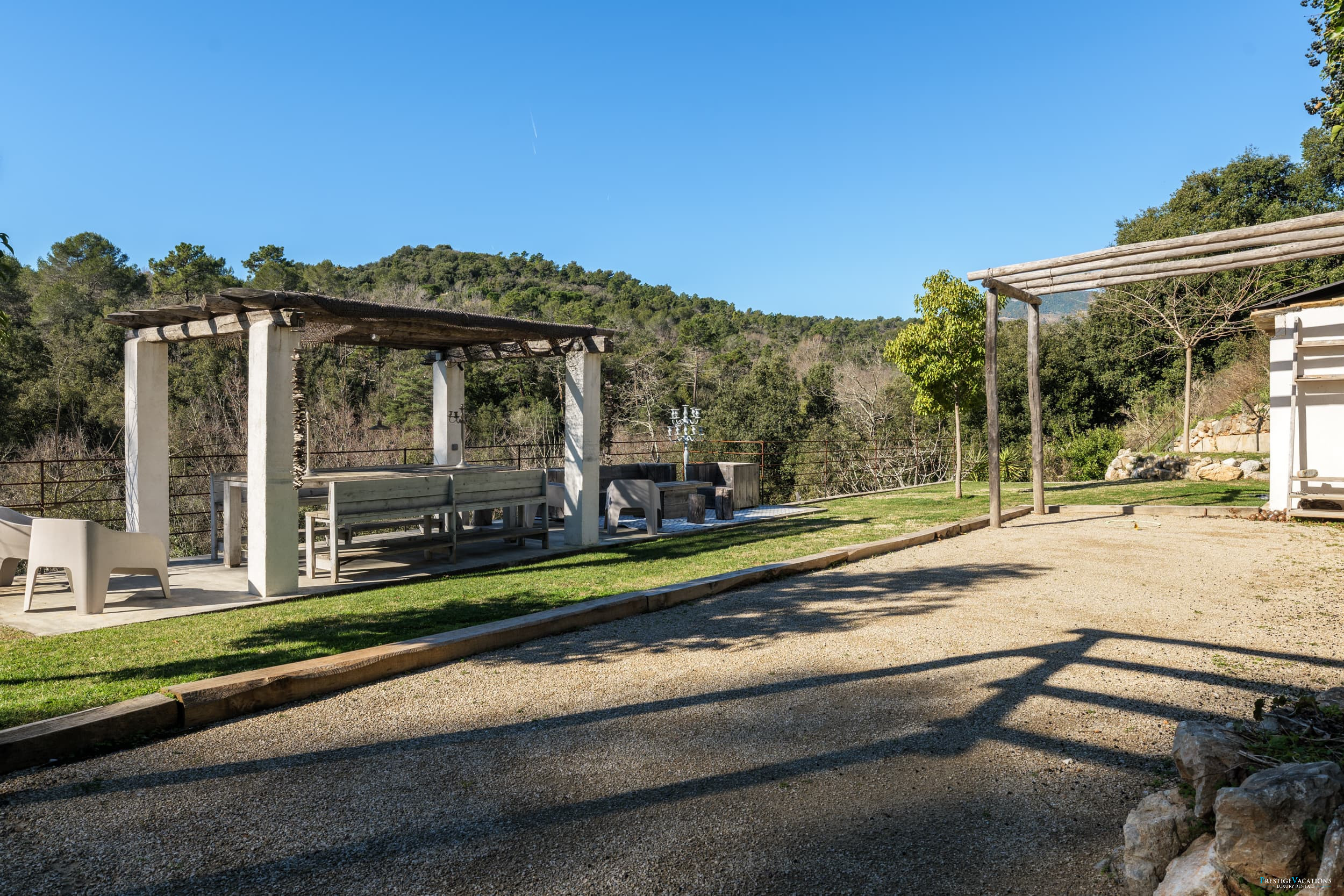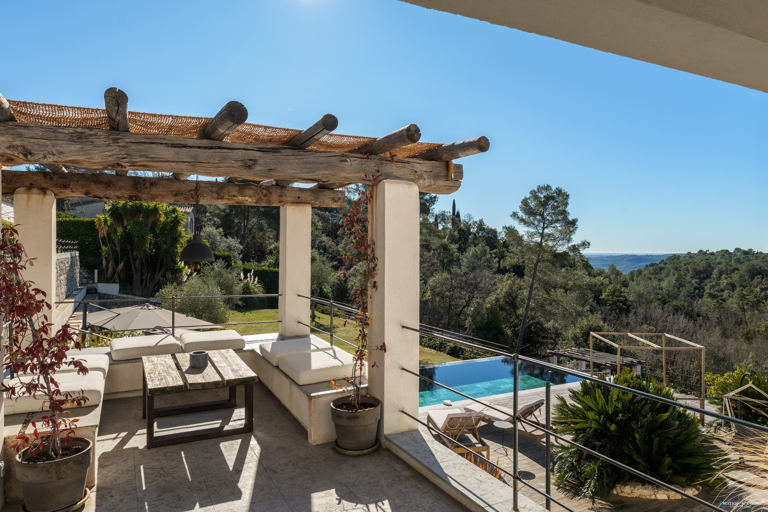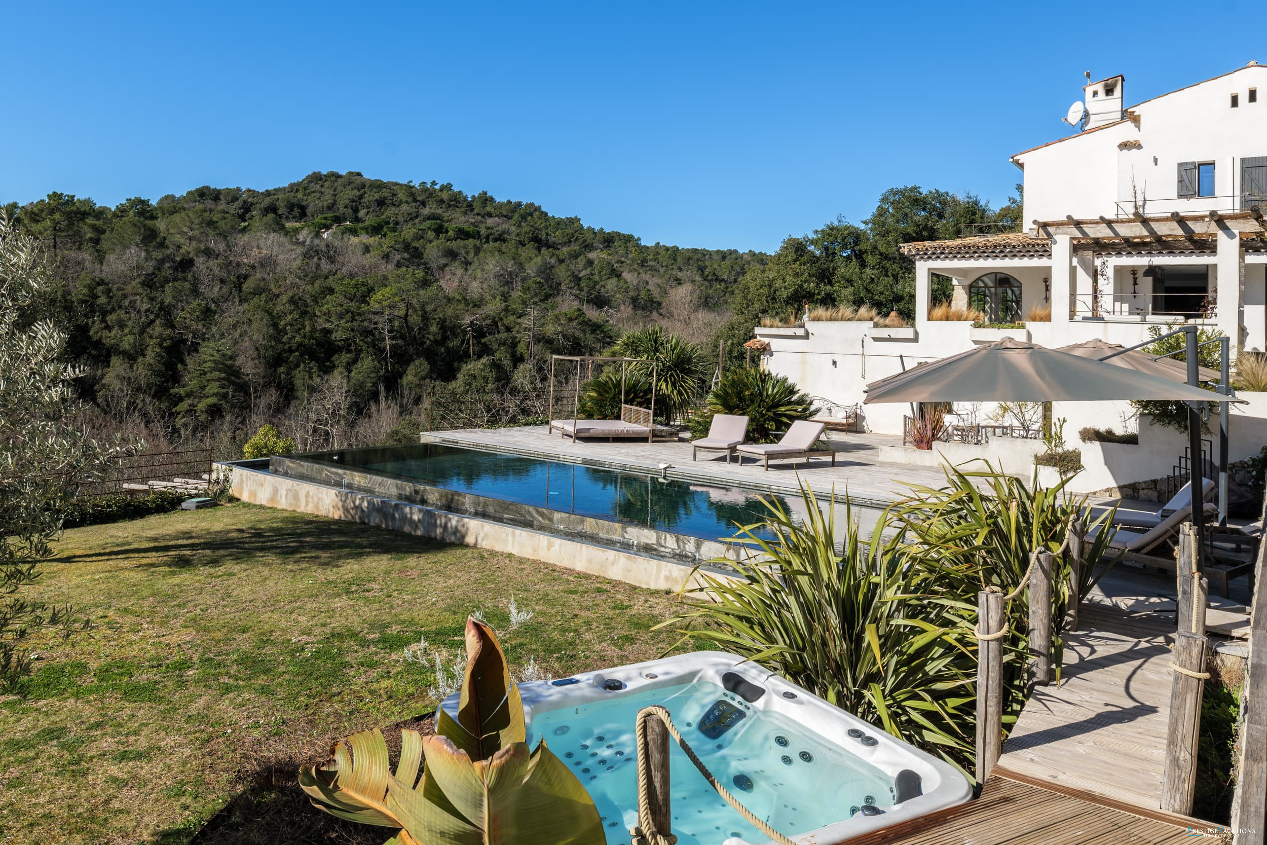 Ce domaine privé comprend également une piscine à débordement, un jacuzzi, un sauna infrarouge, plusieurs restanques, un terrain de pétanque et un parking pour 5 voitures équipé de prises pour véhicules électriques. À noter que le niveau de la maison n'est pas adapté pour les personnes à mobilité réduite.