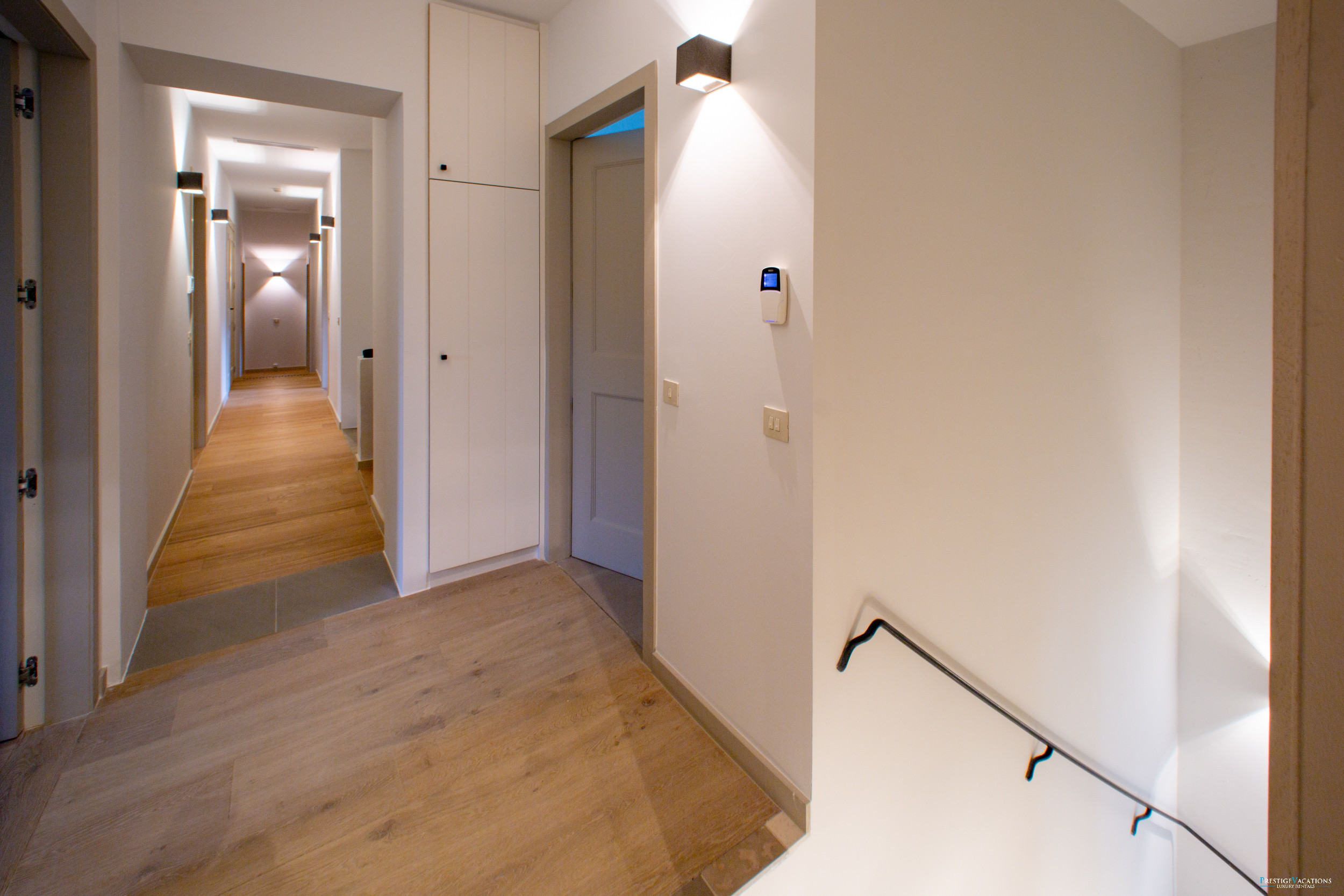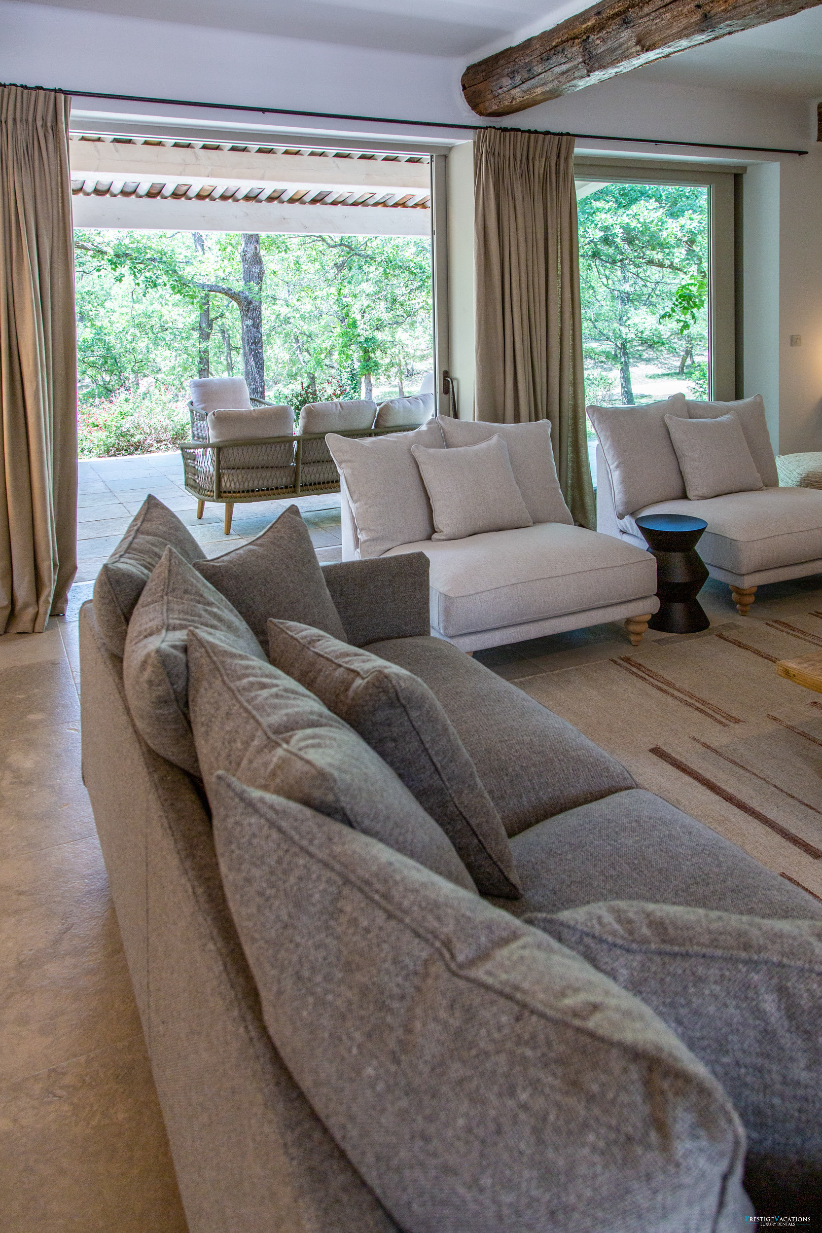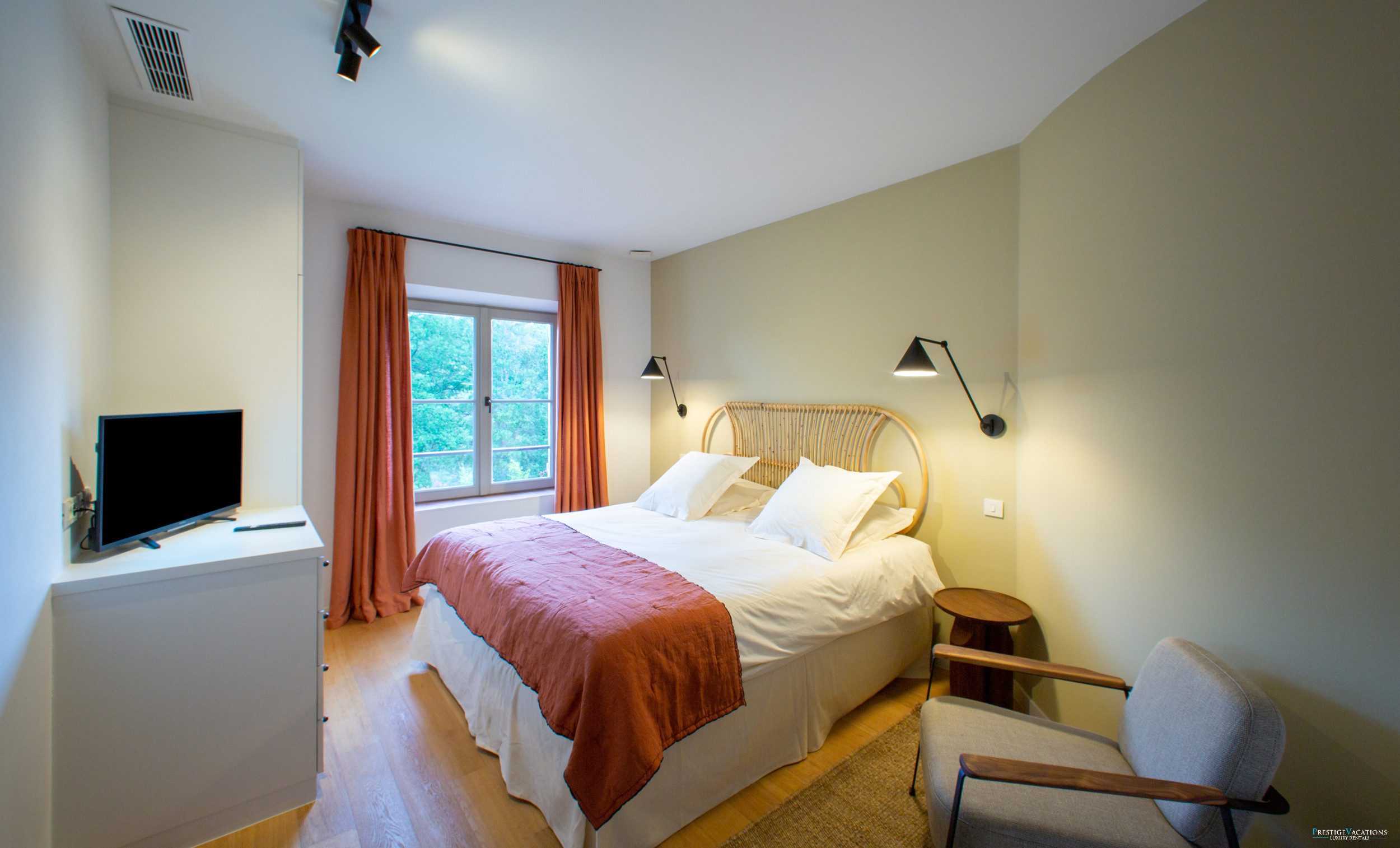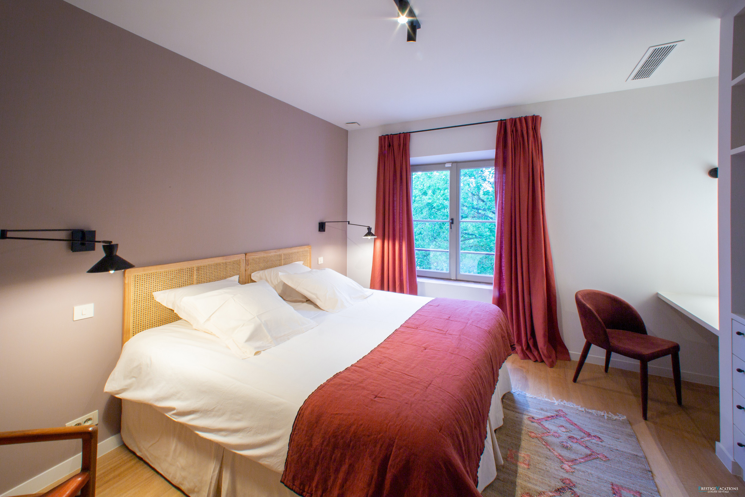 La villa accueille les invités dans des chambres magnifiquement aménagées, chacune offrant intimité et vue sur le bois environnant ou la piscine. La suite principale spacieuse dispose d'un grand dressing et d'une salle de bain attenante avec baignoire et douche, et est complétée par une chambre d'enfants adjacente. Quatre chambres supplémentaires généreusement dimensionnées comprennent chacune la climatisation, une télévision, une salle de douche et des toilettes privatives, garantissant le confort et l'indépendance de chaque invité.