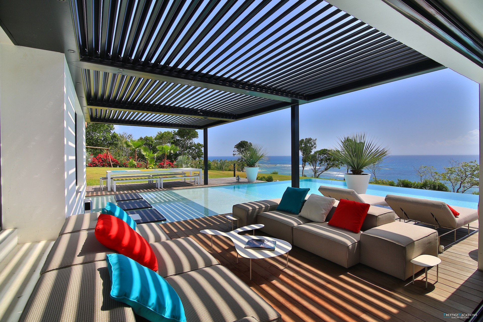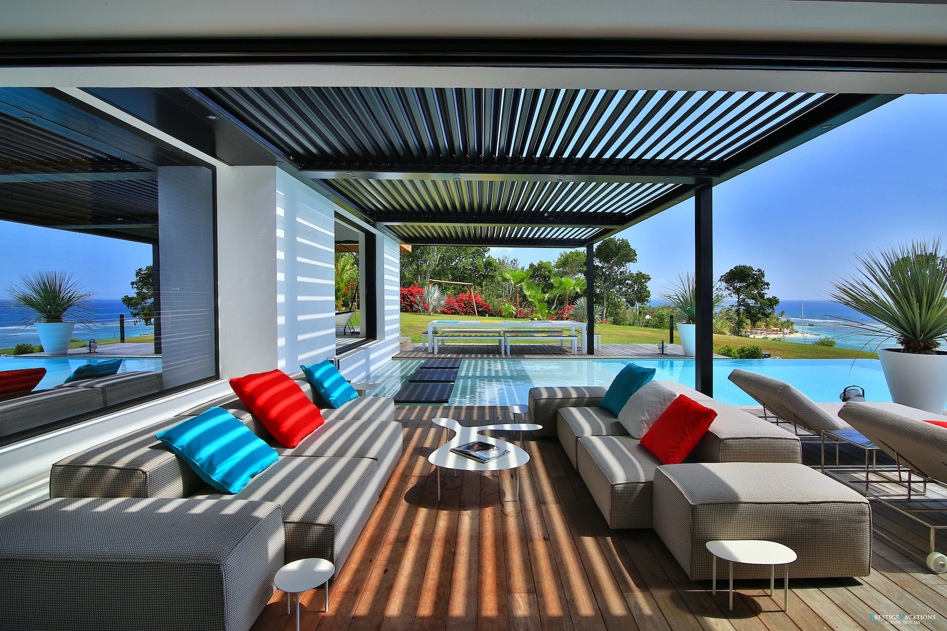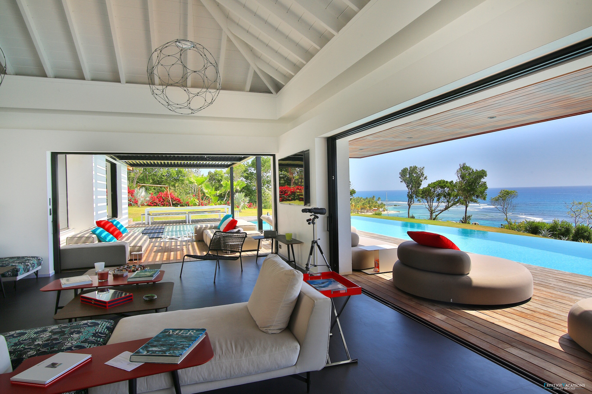 Le vaste séjour et la salle à manger s’ouvrent sur une grande terrasse panoramique où l’on peut savourer des repas face à la mer ou simplement profiter du spectacle des couchers de soleil sur la côte de Grande-Terre. La cuisine entièrement équipée permet de recevoir confortablement, tandis que les espaces extérieurs invitent à la détente autour de la piscine à débordement et du salon extérieur.