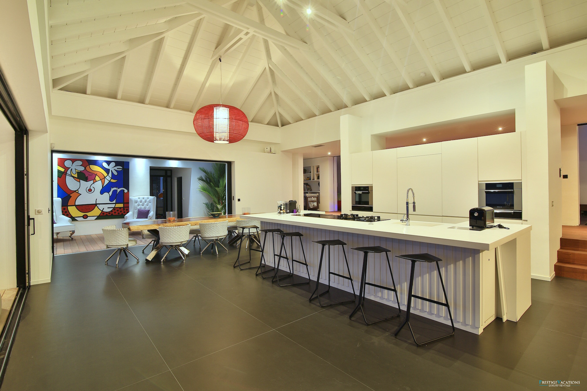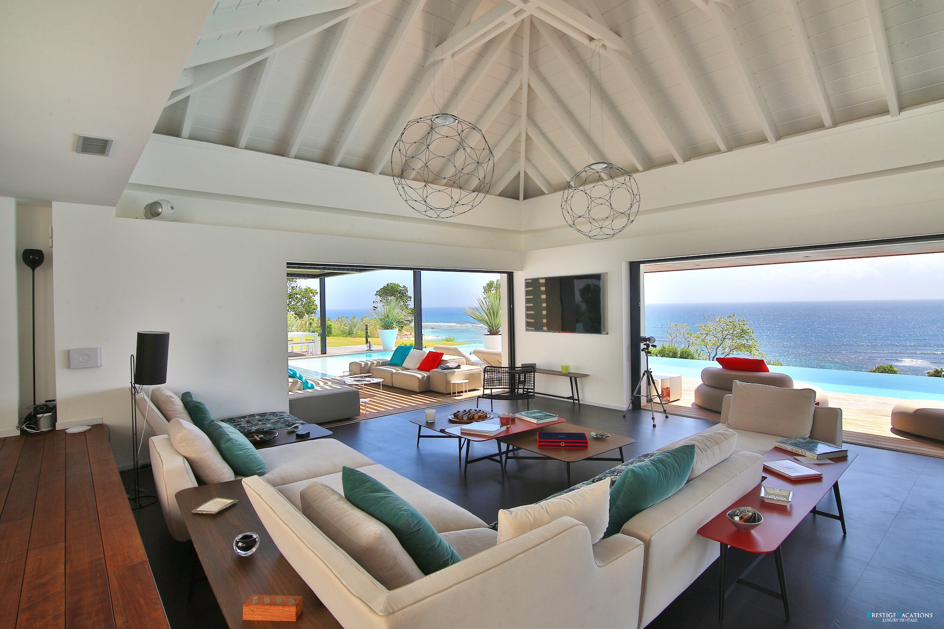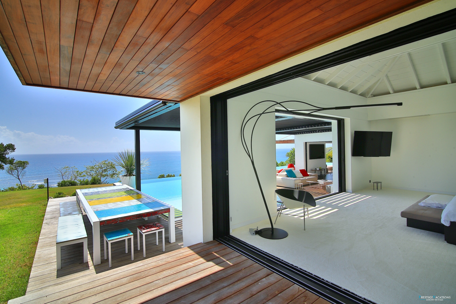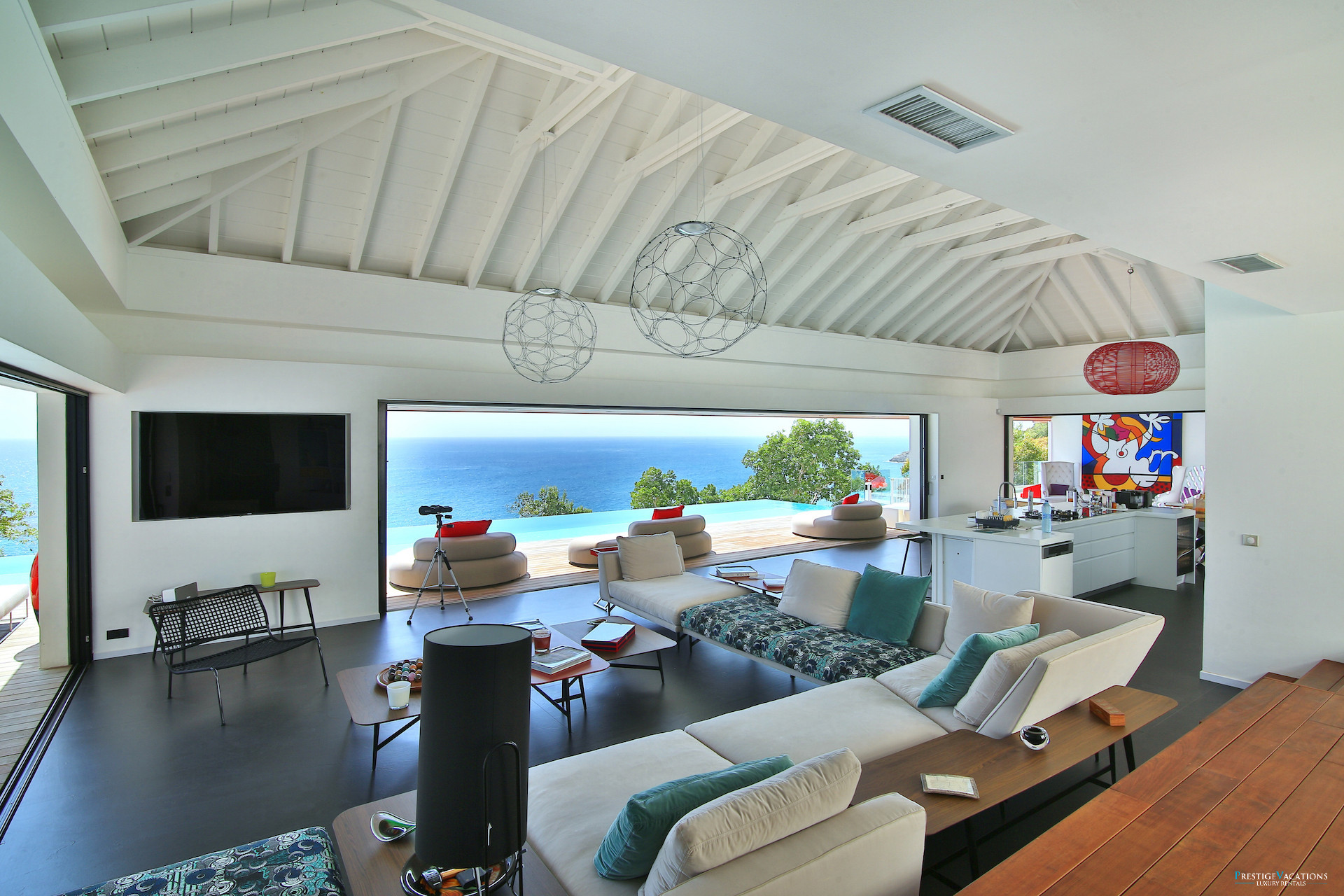 Le vaste séjour et la salle à manger s’ouvrent sur une grande terrasse panoramique où l’on peut savourer des repas face à la mer ou simplement profiter du spectacle des couchers de soleil sur la côte de Grande-Terre. La cuisine entièrement équipée permet de recevoir confortablement, tandis que les espaces extérieurs invitent à la détente autour de la piscine à débordement et du salon extérieur.