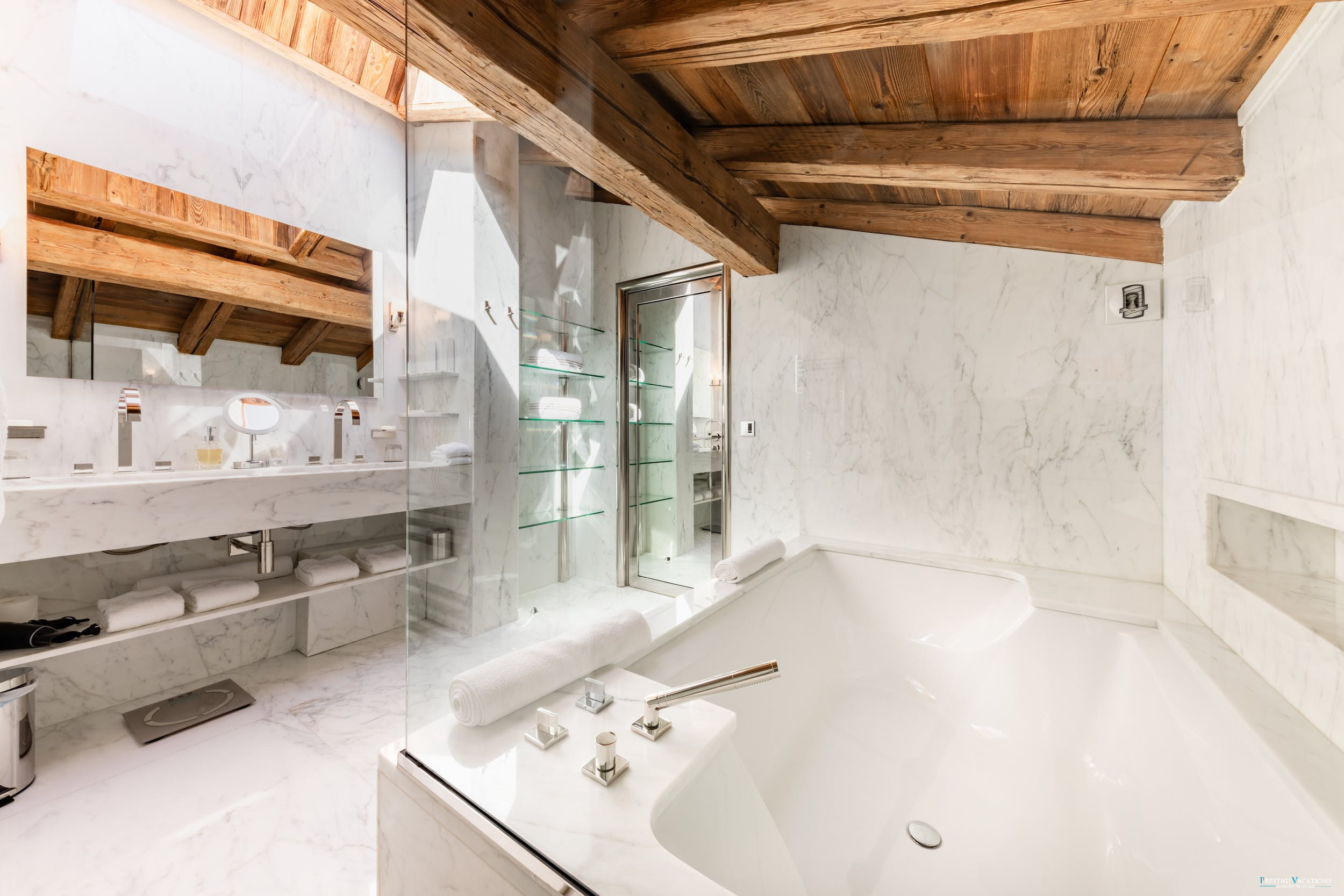 The main house at Chalet Royal offers light-filled open-plan living spaces where contemporary design meets alpine charm. Glass, polished marble and pale timbers create an atmosphere of understated luxury, while vast windows ensure you are always connected to the beauty of the surrounding landscapes. Sophisticated yet inviting, these spaces are perfect for unwinding, all complemented by the attentive service of Chalet Royal’s dedicated private staff.