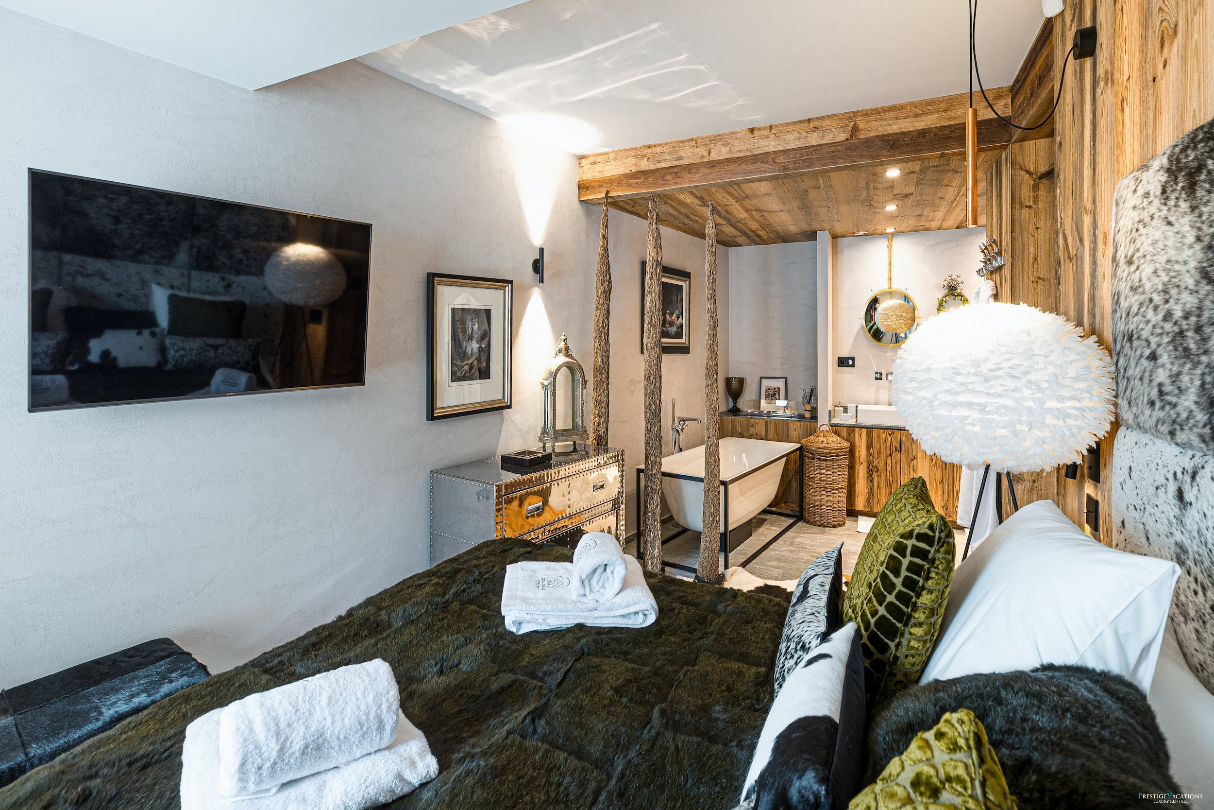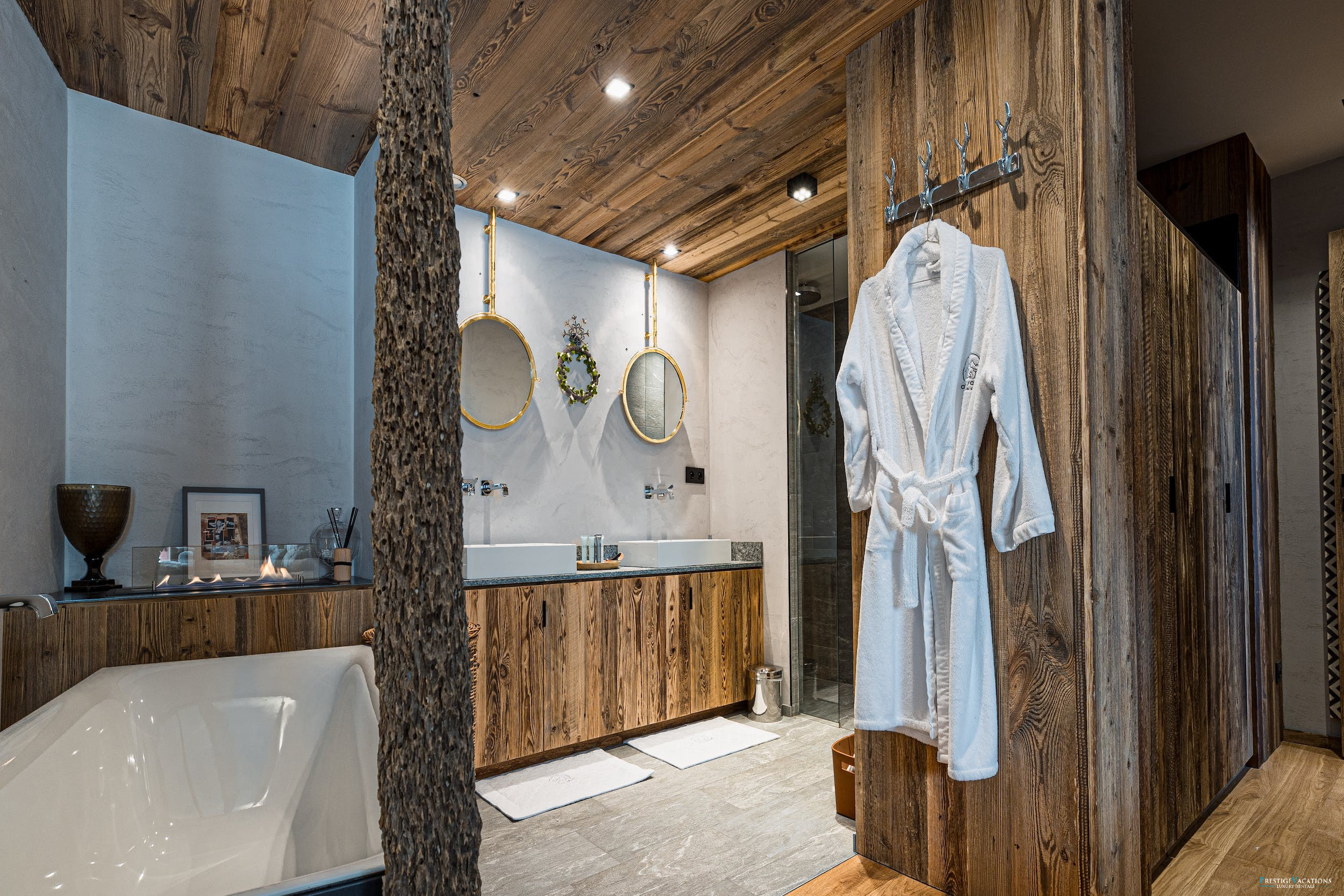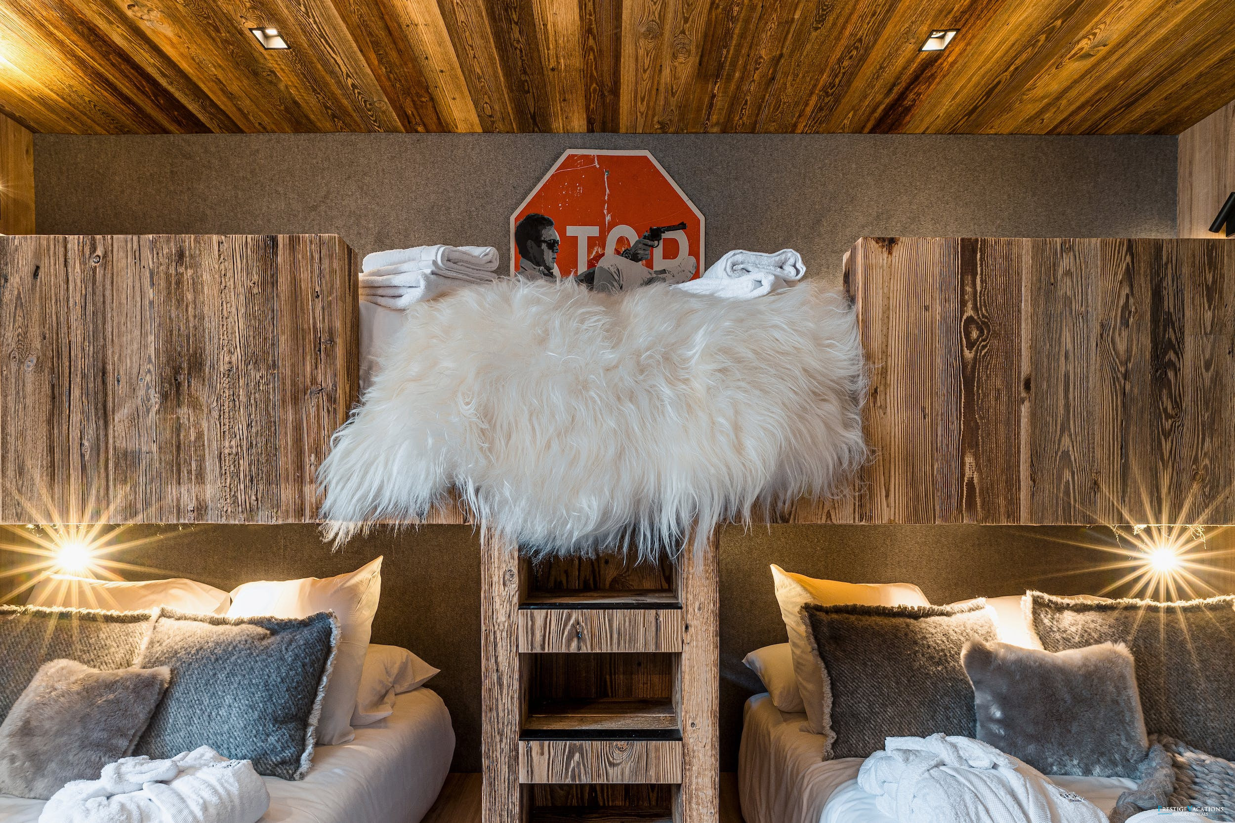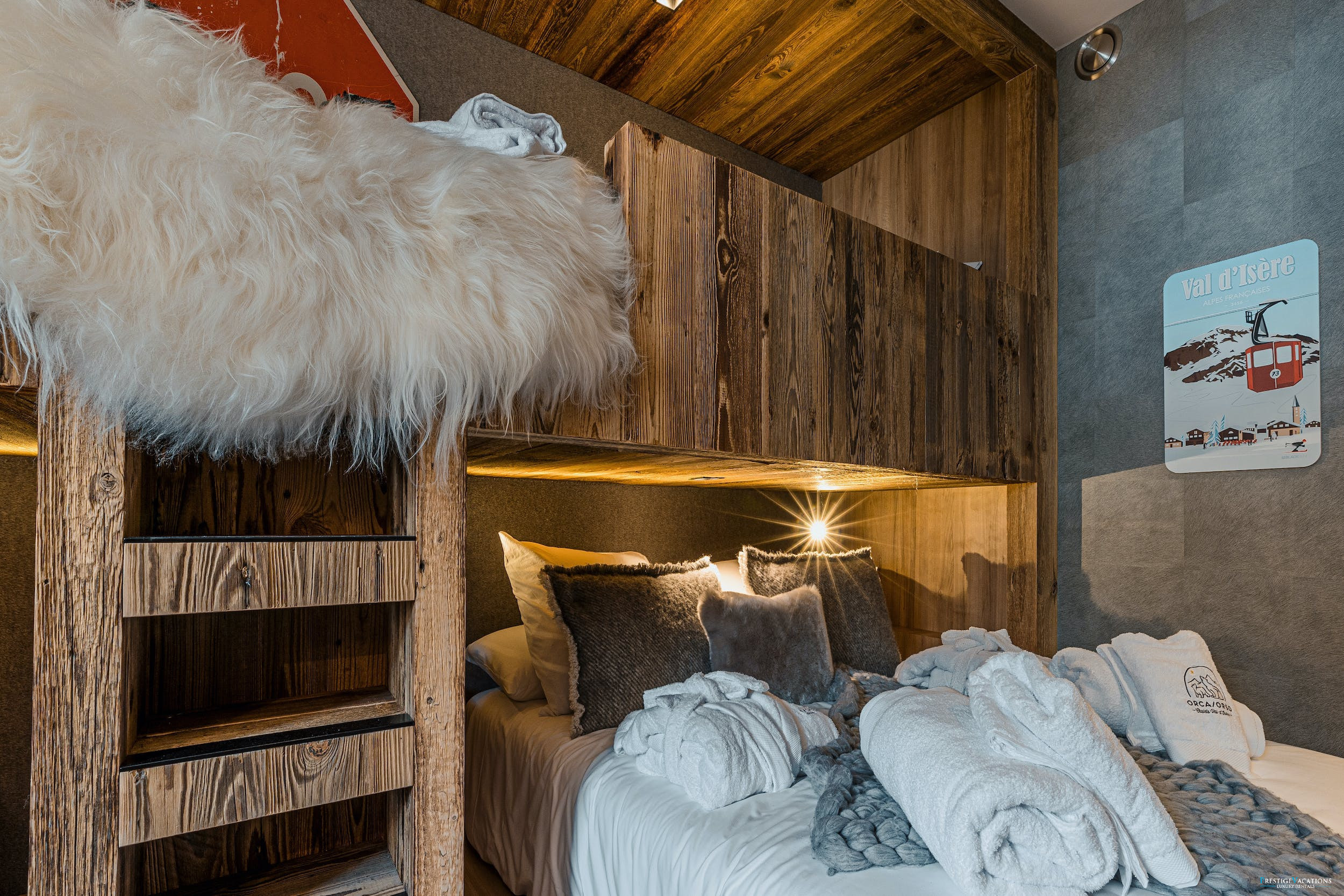 Chalet Mireille’s five luxurious bedrooms ensure comfort and privacy for every guest. Four double bedrooms, three of which can be configured as twins, each feature en-suite bathrooms, private WCs and televisions for added convenience. The spacious master bedroom offers an additional ethanol fireplace and a private terrace for moments of quiet retreat. The dedicated children’s bedroom includes two double beds and two single bunk beds, perfectly arranged for younger guests to enjoy their own space.