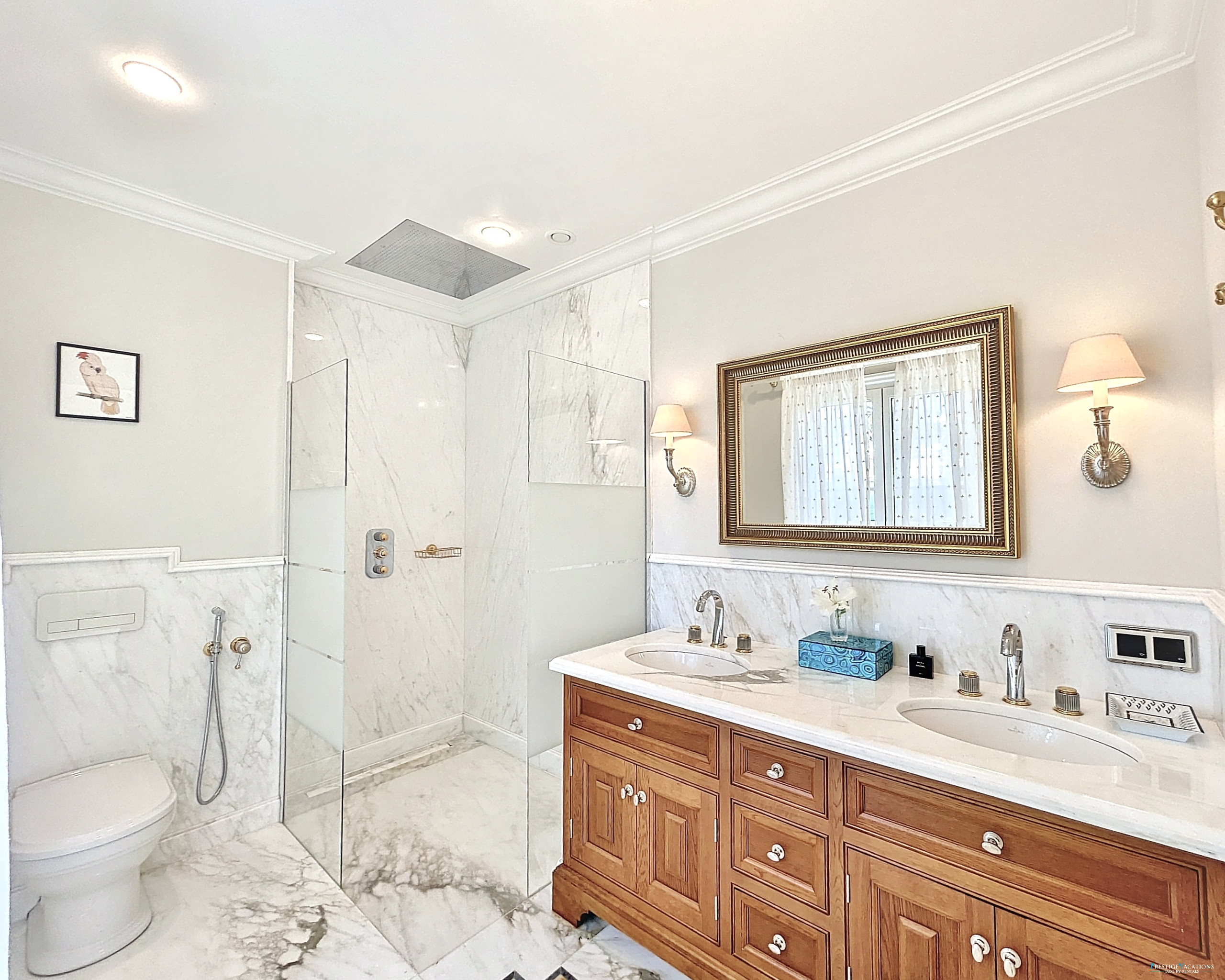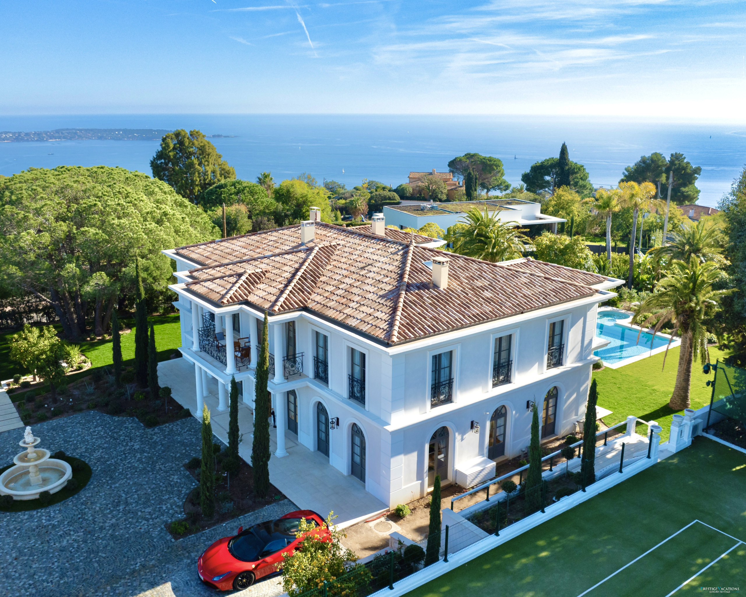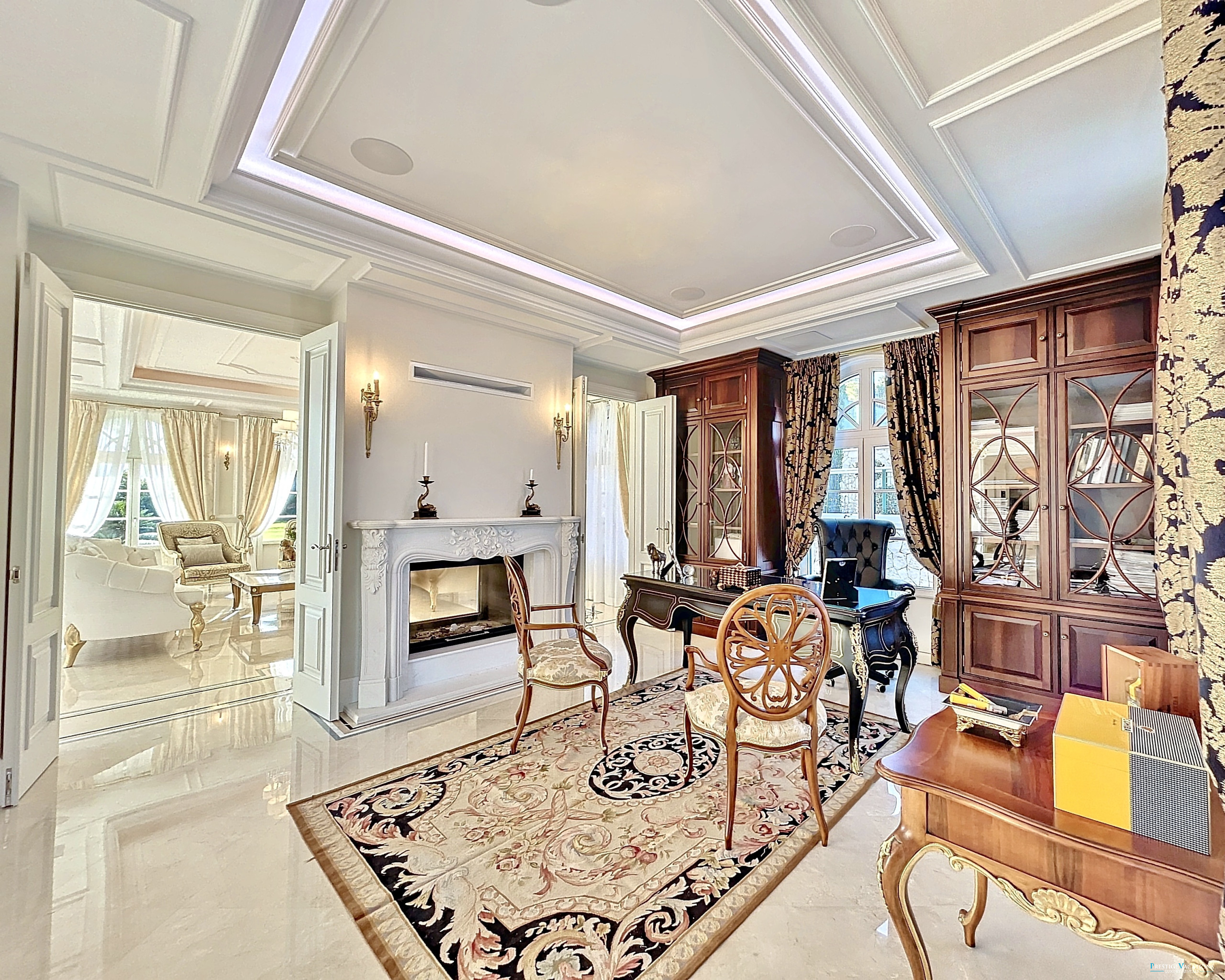 Designed for entertainment and well-being, the villa houses a true private cinema, a perfectly equipped gym, a sauna, a hammam, and a lounge area with a bar for exclusive moments of relaxation. Outside, the vast heated pool with jacuzzi overlooks carefully landscaped Mediterranean gardens, offering shaded corners to lounge in, as well as wide terraces for organizing cocktails or dinners under the stars.