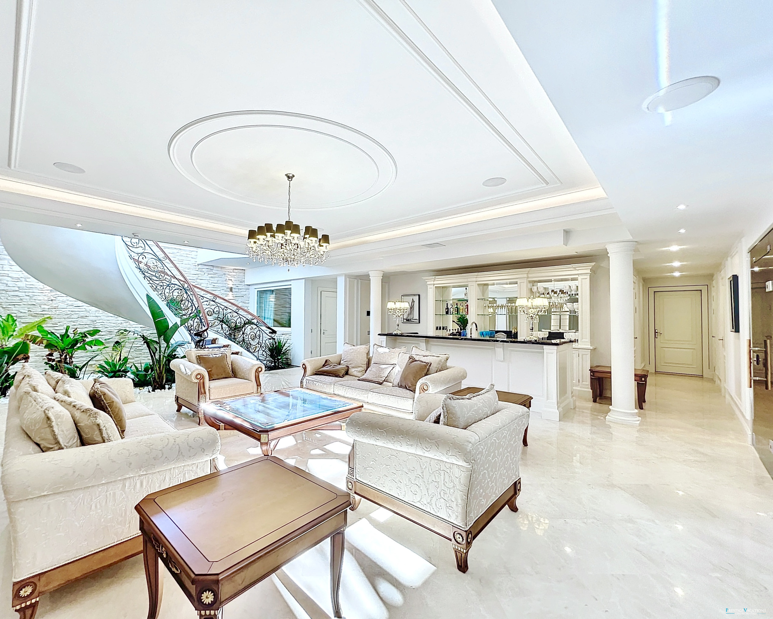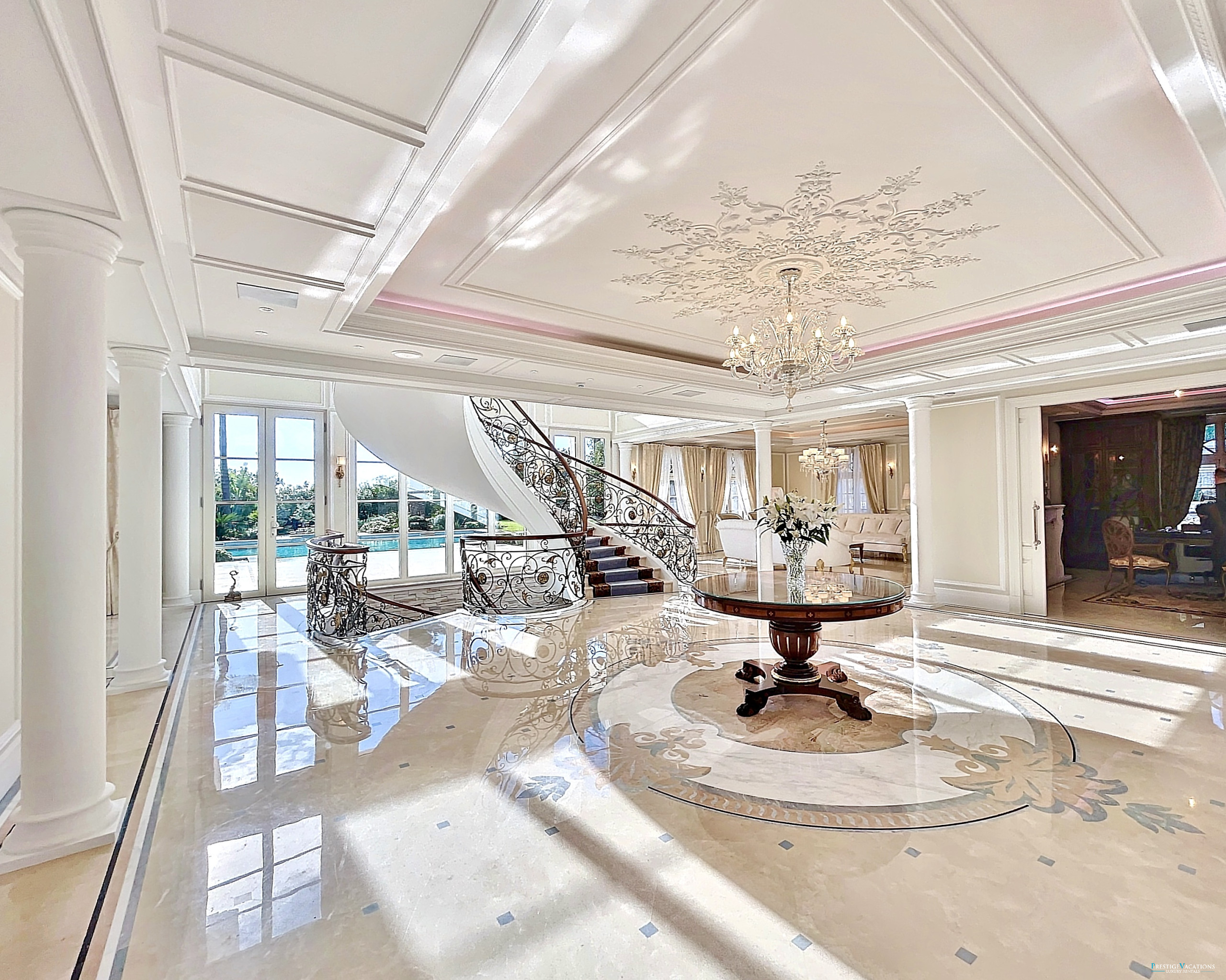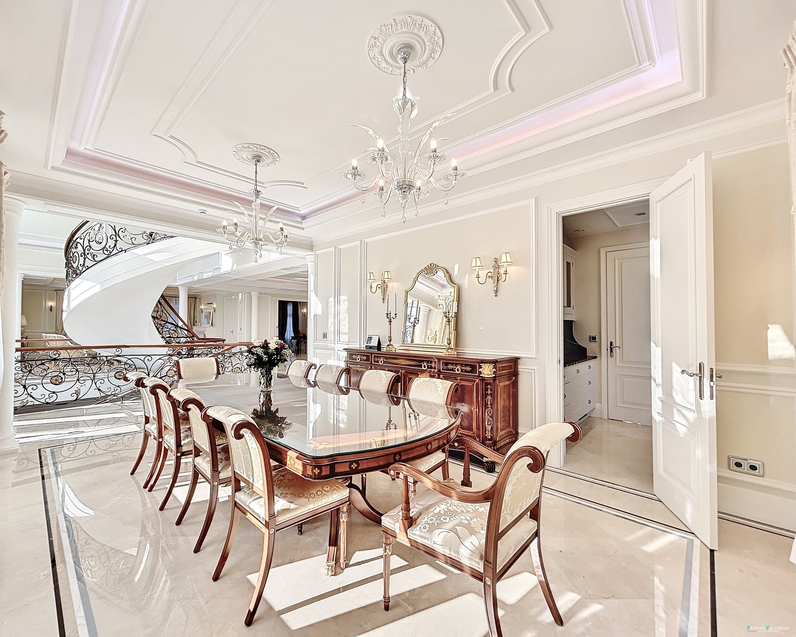 The majestic entrance of the villa, enhanced by a spectacular hall, leads to a vast luminous living room adorned with a fireplace, an elegant lounge area, and a refined dining room capable of hosting numerous guests. The main kitchen, ultra-modern and perfectly equipped to accommodate a private chef, is accompanied by a discreet kitchenette intended for staff.