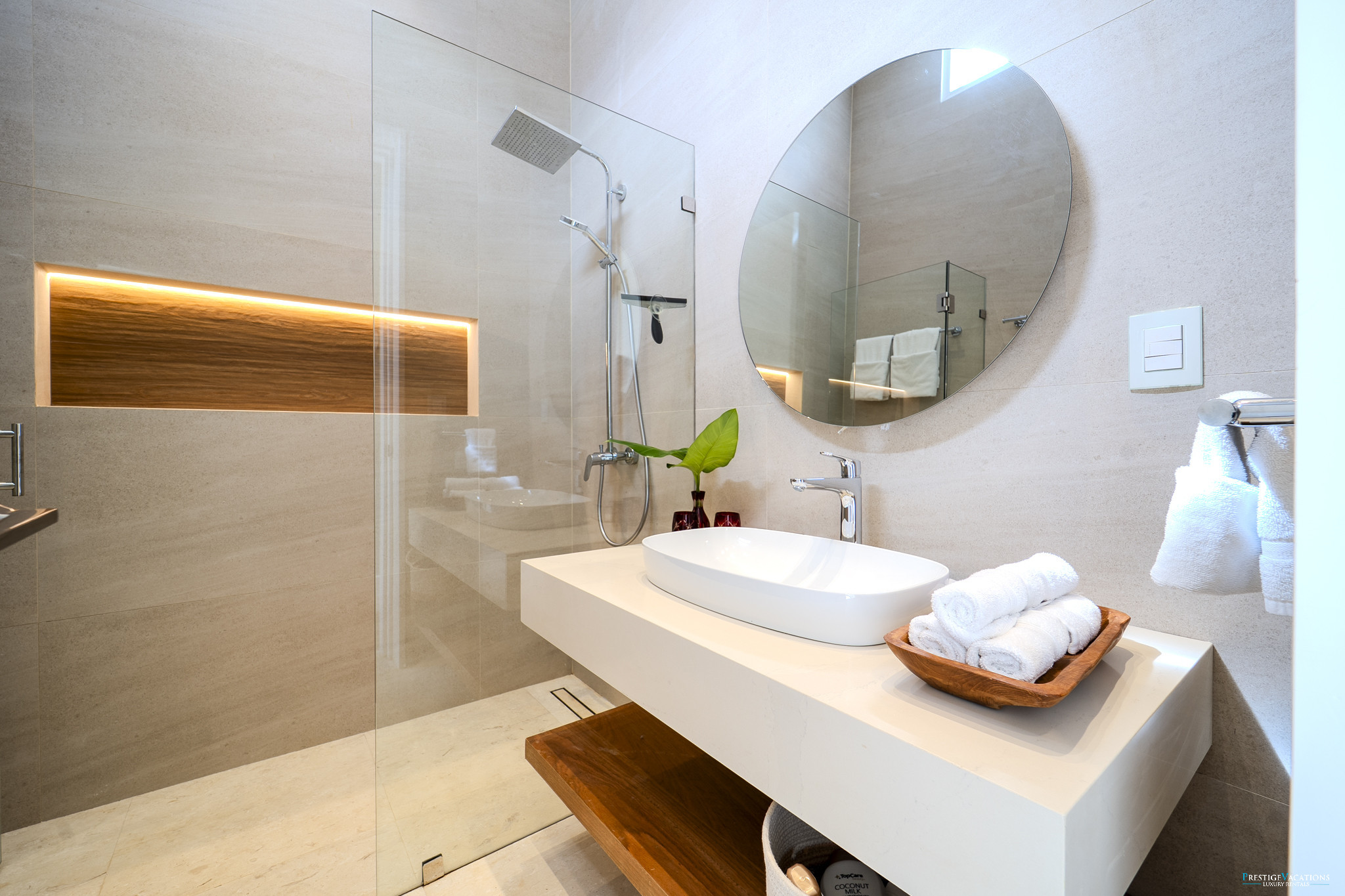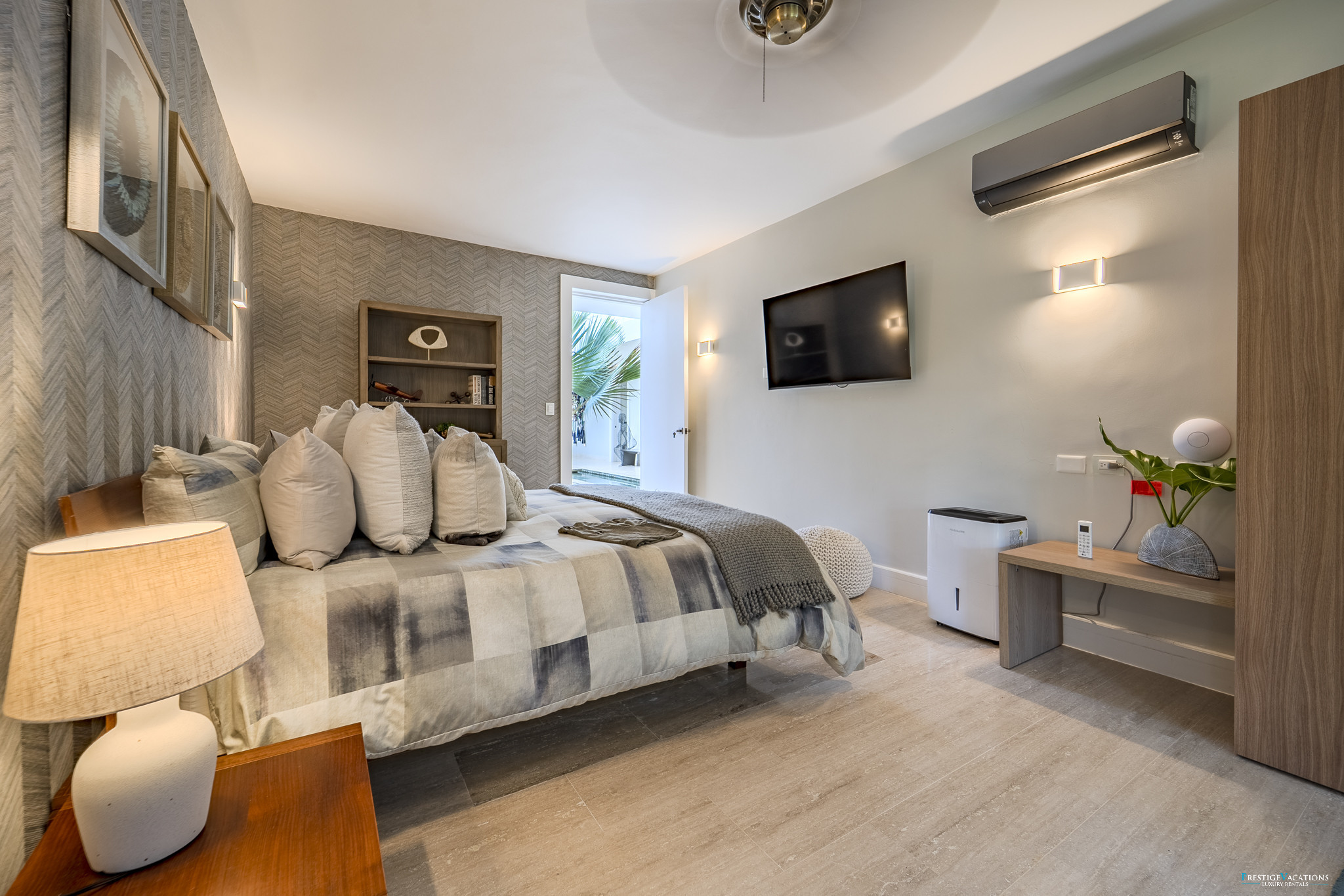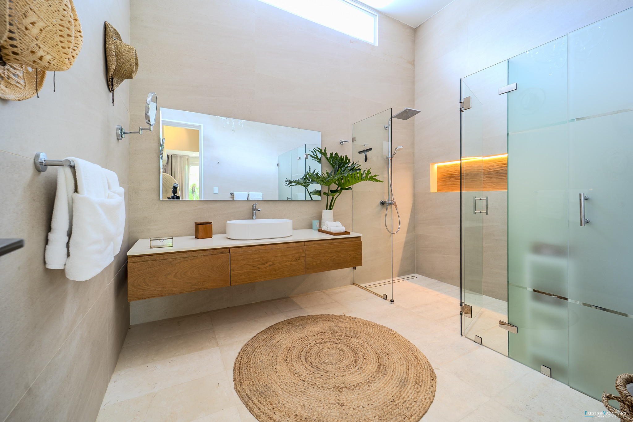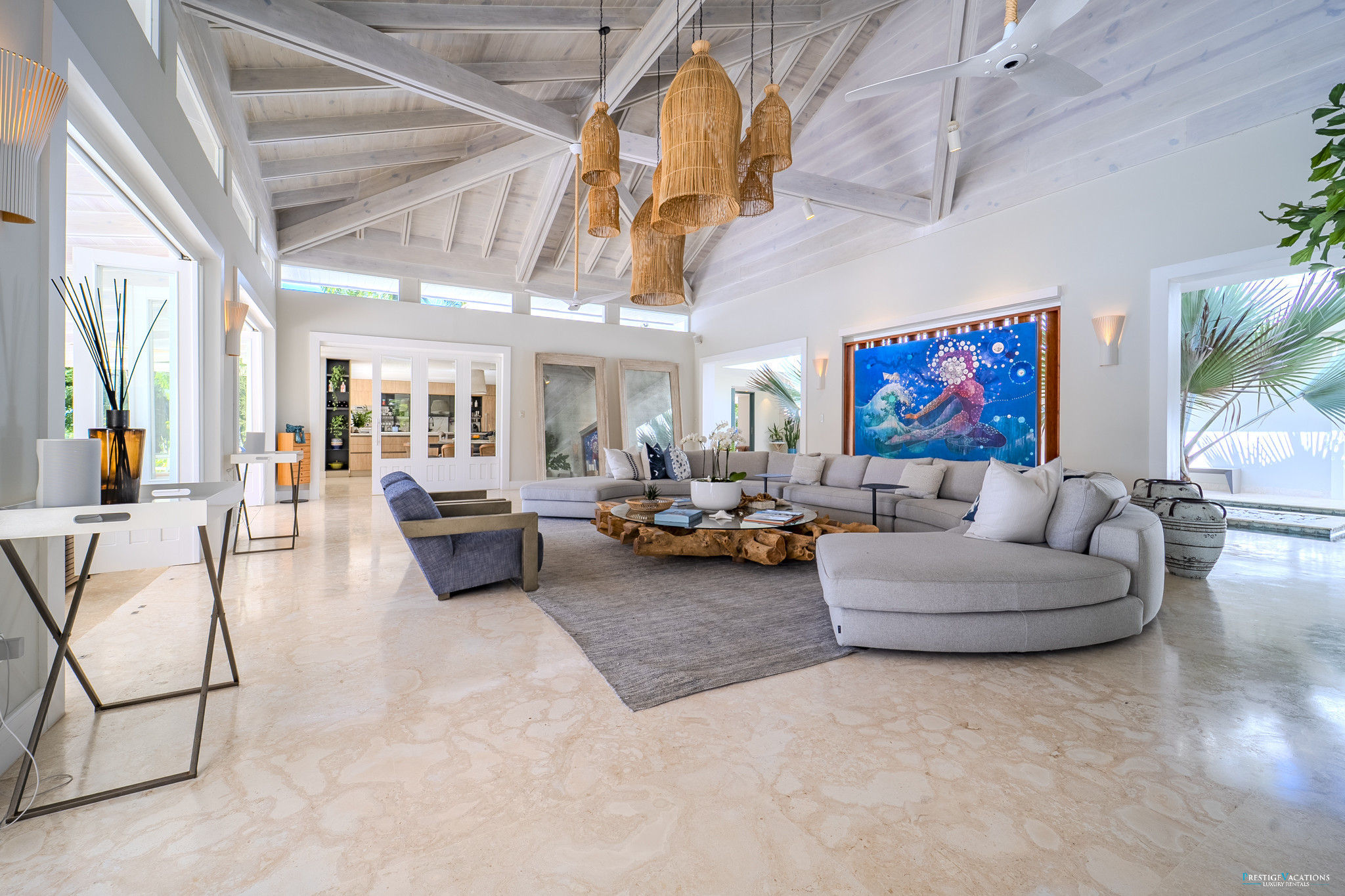 Outside, sweeping golf course views frame a tranquil pool and jacuzzi, inviting slow, sun-filled days in complete privacy. The expansive outdoor sitting and dining area, complemented by a BBQ and outdoor bathroom, is perfectly suited for long alfresco lunches, sunset cocktails, and memorable evenings beneath the Caribbean sky. Carefully curated lighting throughout the residence highlights architectural details and textures from day through night, enhancing the welcoming ambiance and refined personality of the home.