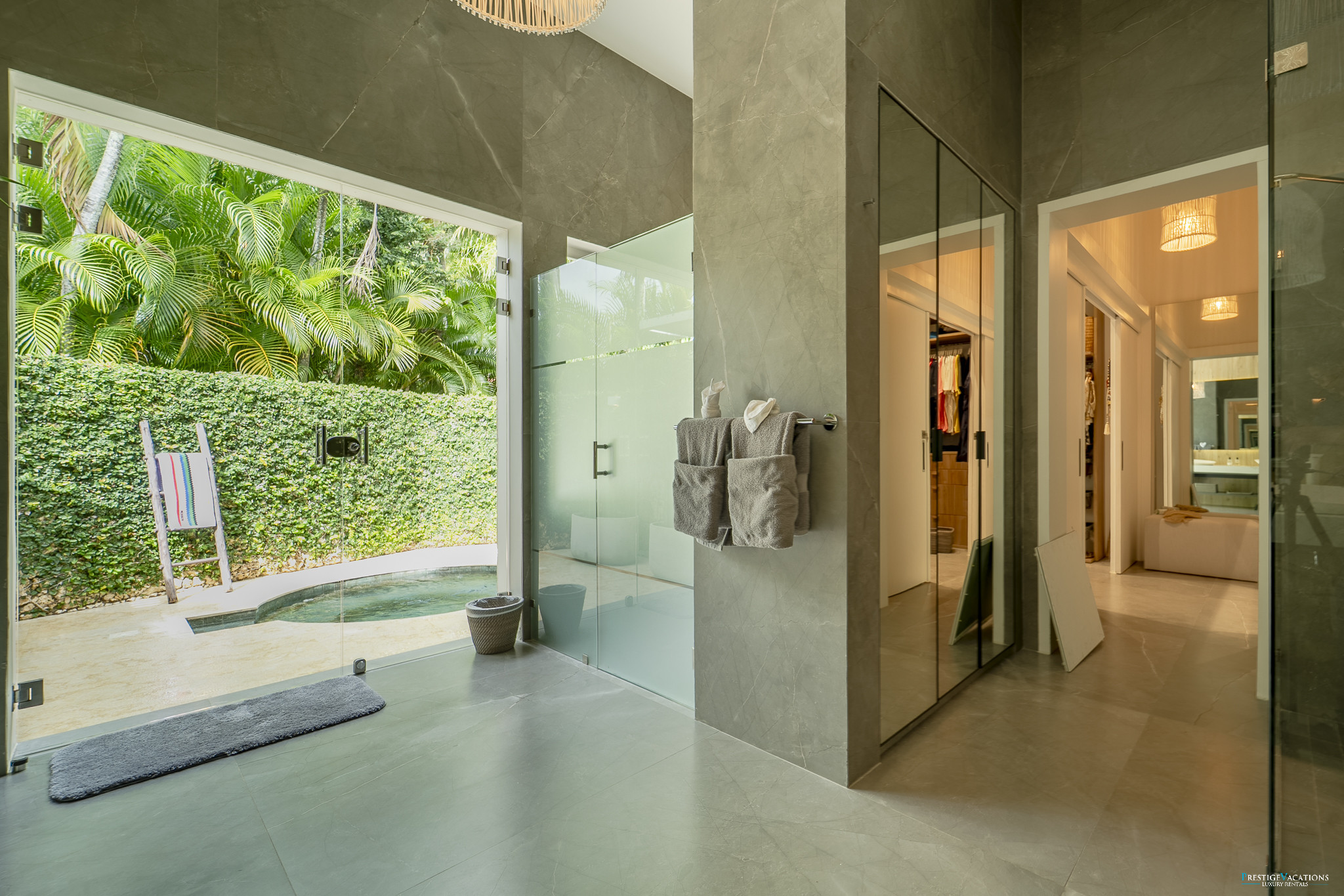 The villa offers five beautifully appointed bedrooms, including a serene master suite featuring its own enclosed terrace and a private office, creating a secluded retreat for reading, working, or simply enjoying quiet moments away from the main social spaces. A comfortable air-conditioned family TV room provides the perfect setting for relaxed movie nights, and the open family kitchen is fully equipped and thoughtfully arranged to keep everyone connected, whether preparing meals together or enjoying dishes prepared by staff.