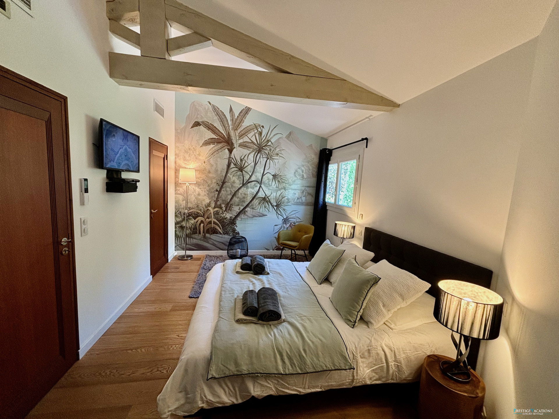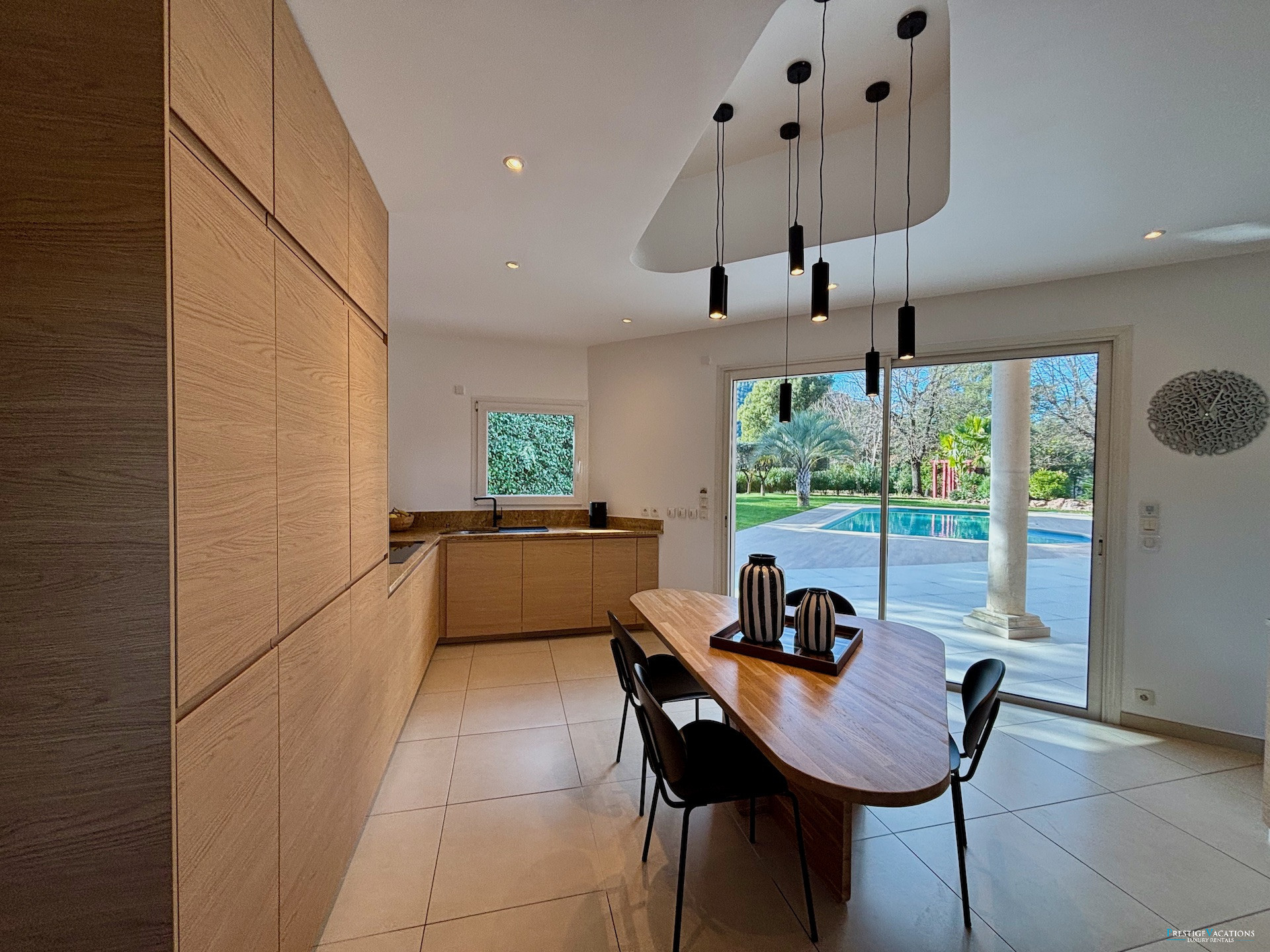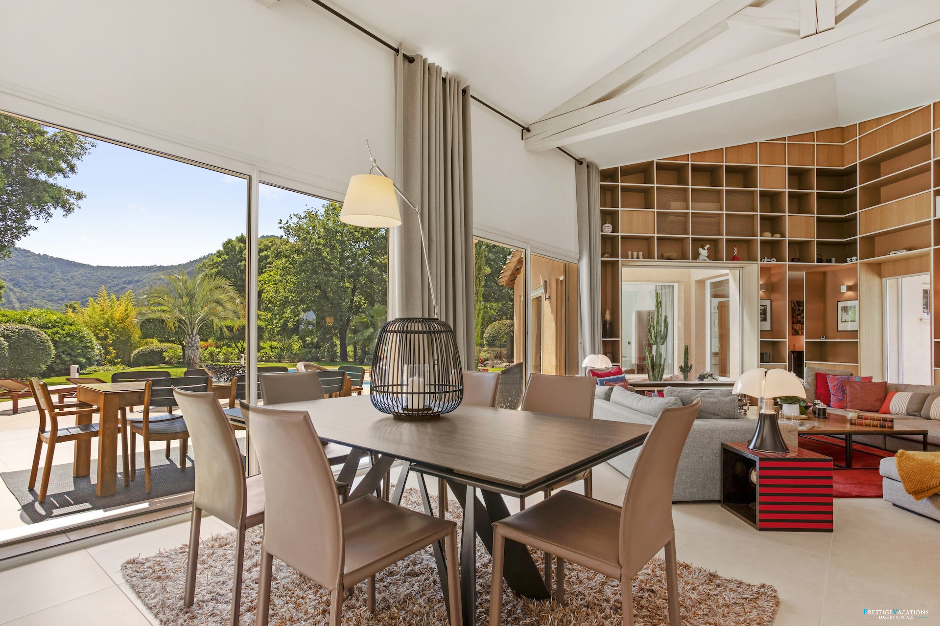 Designed for a discerning clientele seeking space and serenity, Villa Estérel develops approximately 300 m² of habitable space, fully air-conditioned, and offers services worthy of the finest luxury villa rentals on the French Riviera. The volumes are generous, the circulation fluid, and each space has been designed to combine high-end comfort and art de vivre. The vast living area with lounge and dining room opens widely onto the terraces and park, while offering complete equipment with satellite television, centralised SONOS audio system, high-speed internet, and multimedia equipment.