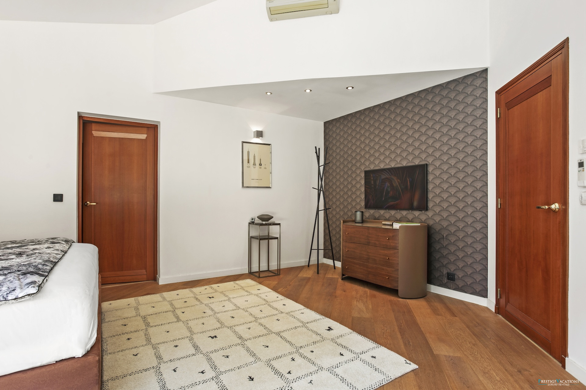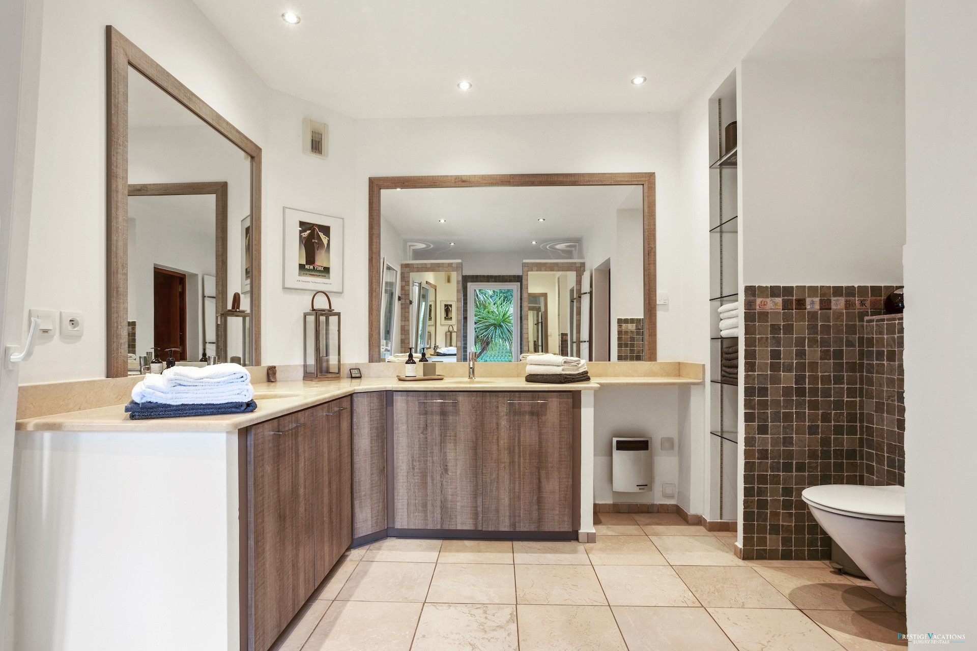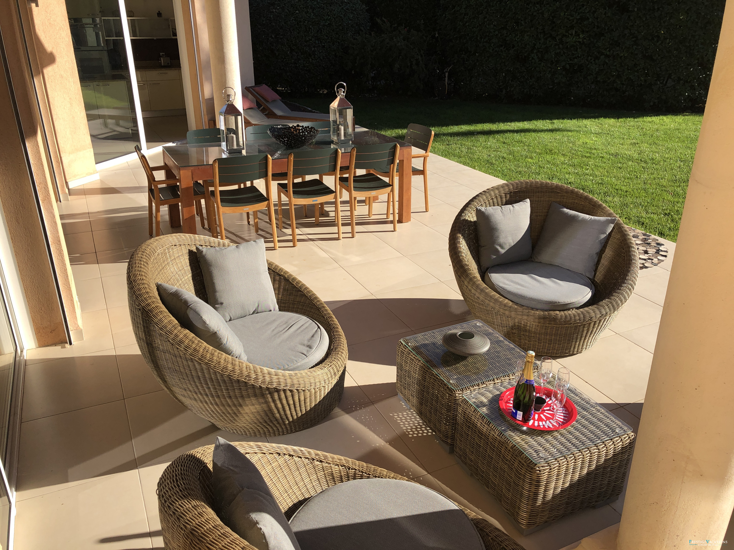 Designed for a discerning clientele seeking space and serenity, Villa Estérel develops approximately 300 m² of habitable space, fully air-conditioned, and offers services worthy of the finest luxury villa rentals on the French Riviera. The volumes are generous, the circulation fluid, and each space has been designed to combine high-end comfort and art de vivre. The vast living area with lounge and dining room opens widely onto the terraces and park, while offering complete equipment with satellite television, centralised SONOS audio system, high-speed internet, and multimedia equipment.