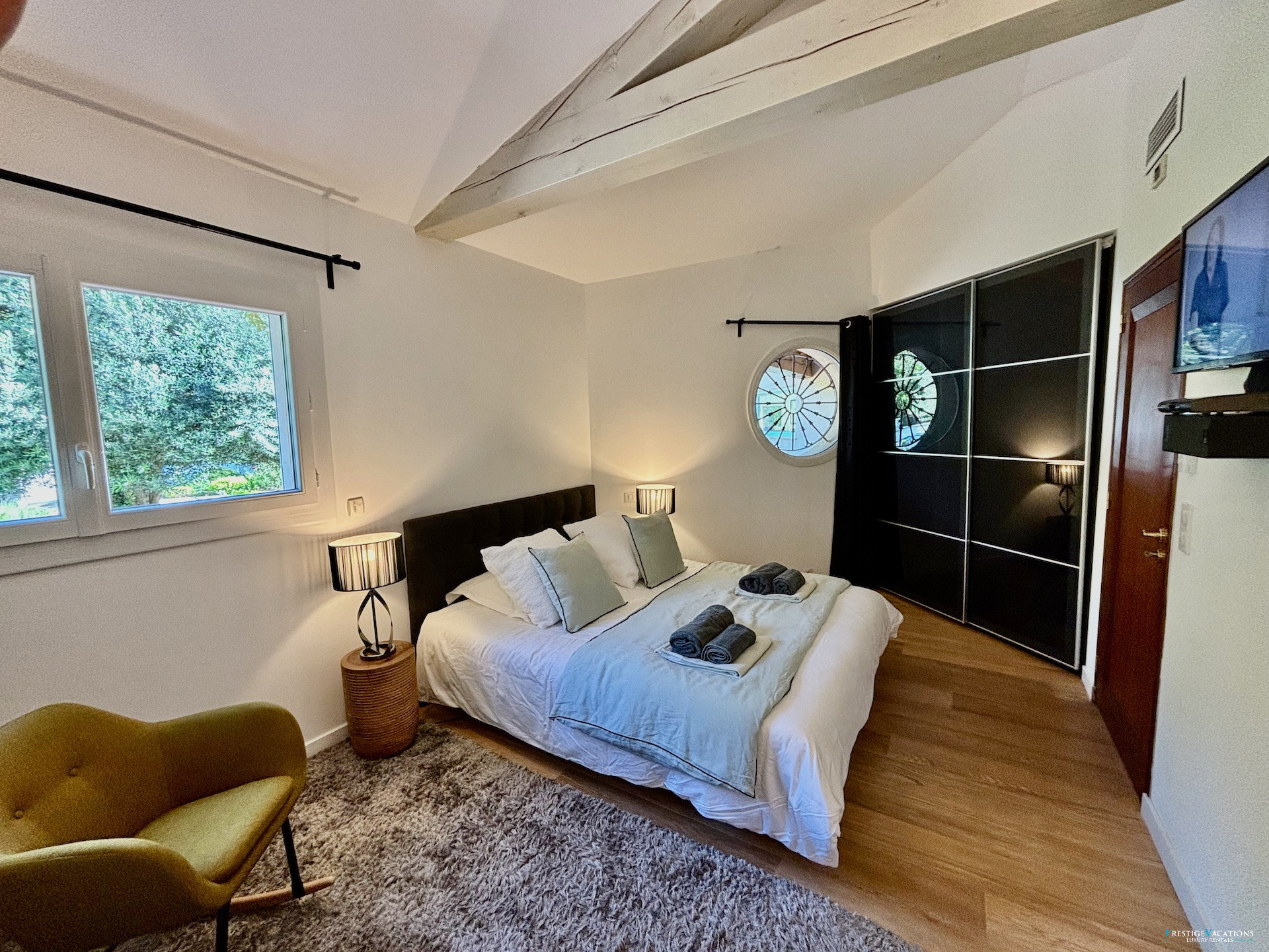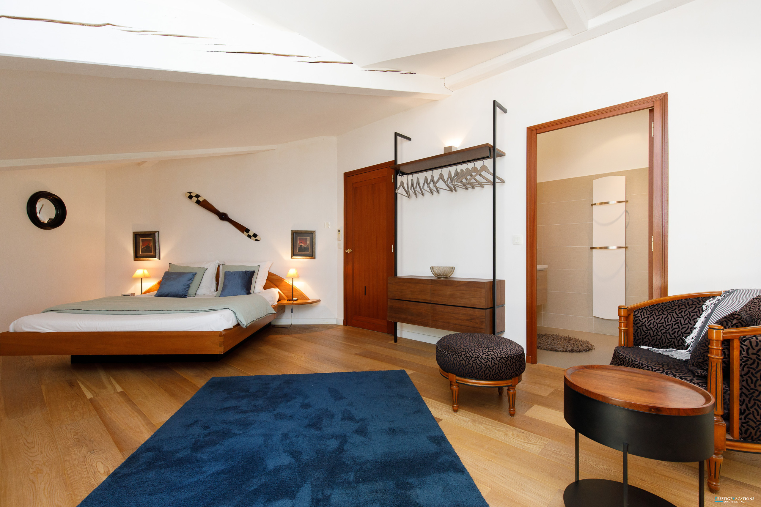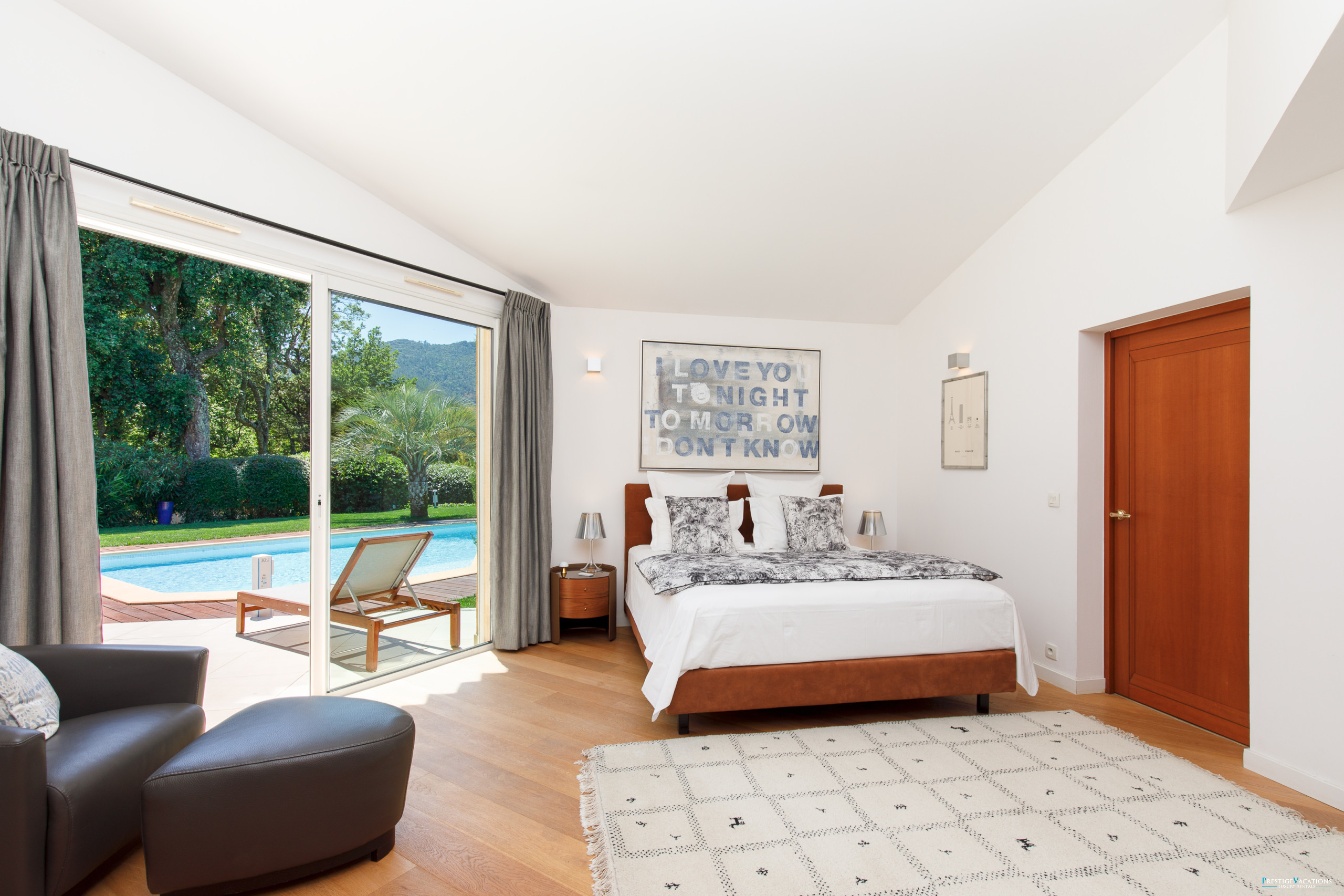 The open kitchen, perfectly equipped, allows for entertaining and cooking in a friendly atmosphere, ideal for a family stay or with friends. The four bedrooms, all elegantly furnished, have their own bathroom or shower room, walk-in wardrobes and some with direct access to the pool, ensuring privacy and comfort for each occupant. The master suite, with a king-size bed, walk-in wardrobe and double shower, offers an experience worthy of a true luxury villa rental in the Estérel.