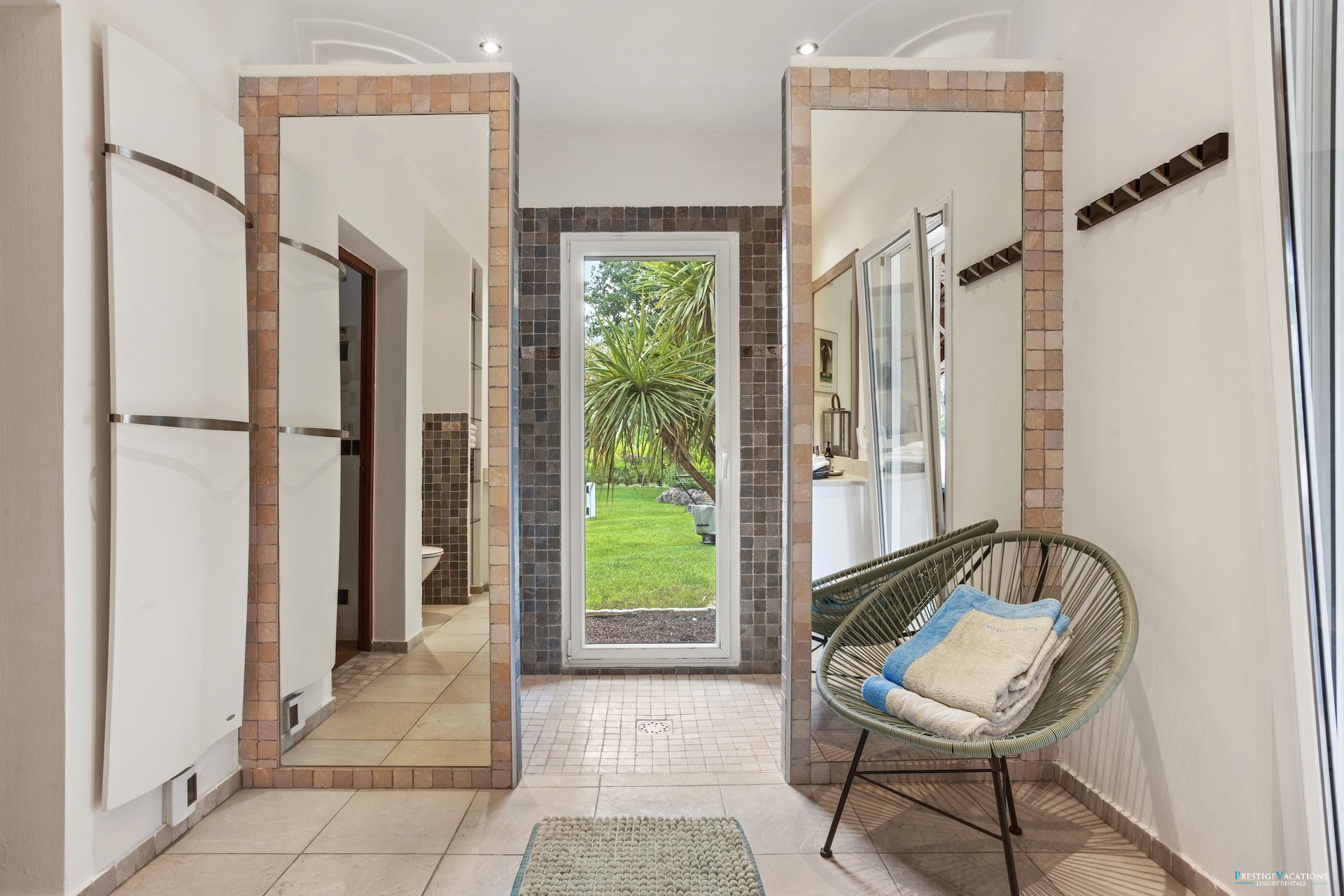 Outside, the landscaped park and partially covered terraces of over 100 m² create a privileged setting to enjoy the Azurean climate. The salt-heated swimming pool, available on request, is appealing with its child-friendly submerged beach, generous dimensions and unobstructed view of the surrounding greenery. Sunbeds, garden lounges, barbecue and relaxation areas invite you to savour every moment, between idleness and conviviality.