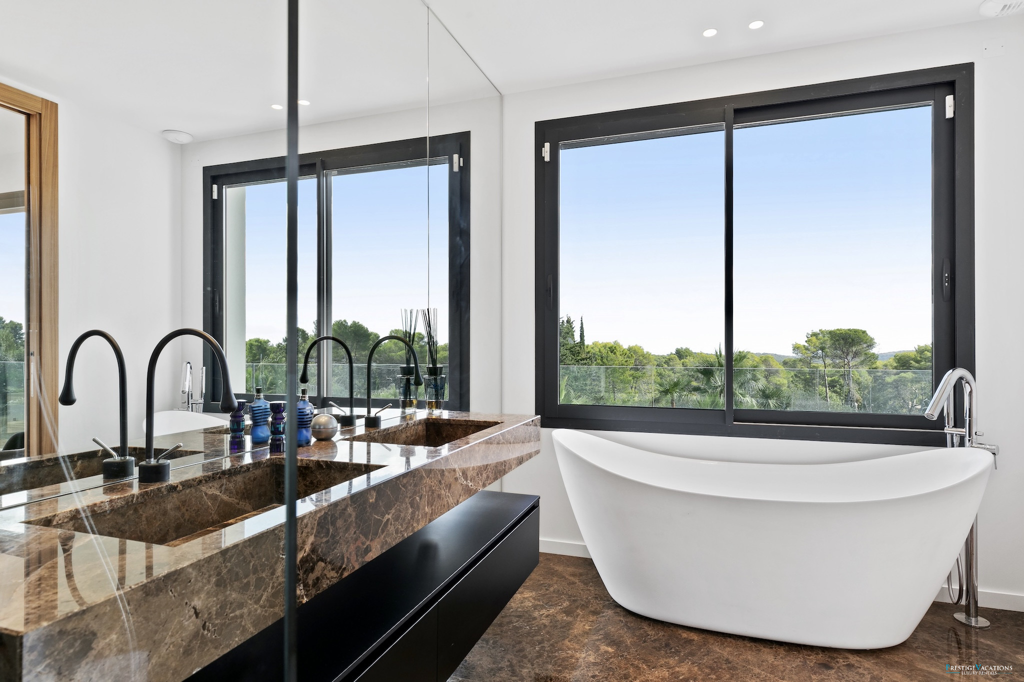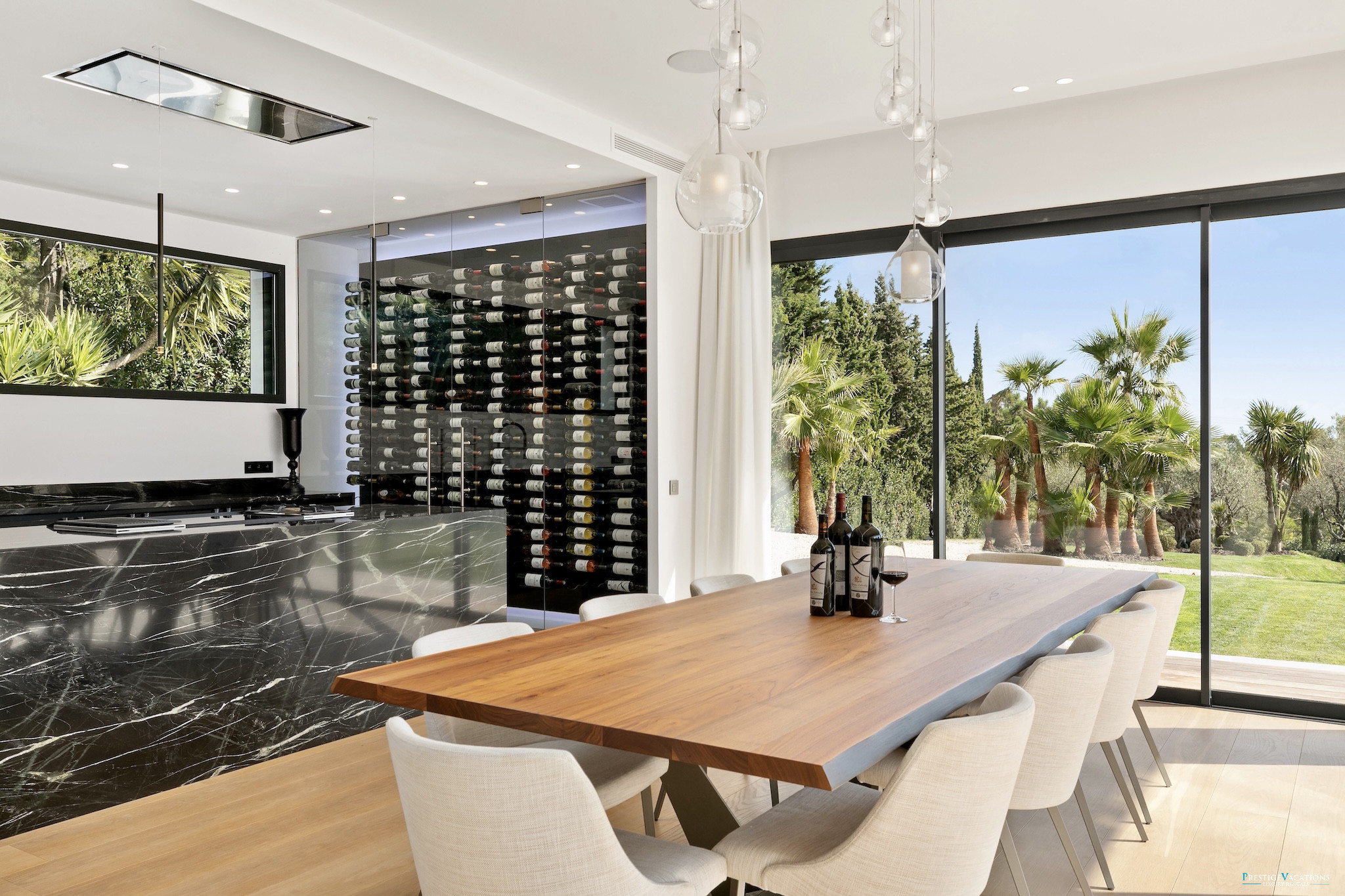 Designed for a discerning clientele seeking a luxury villa rental near Cannes, Villa Mila embodies contemporary elegance in a privileged natural setting. Noble materials such as marble, granite, and solid hardwood floors confer a sophisticated and warm atmosphere to the entire space. Generous volumes and large openings allow for a perfect continuity between interior and exterior spaces, offering exceptional luminosity throughout the day.