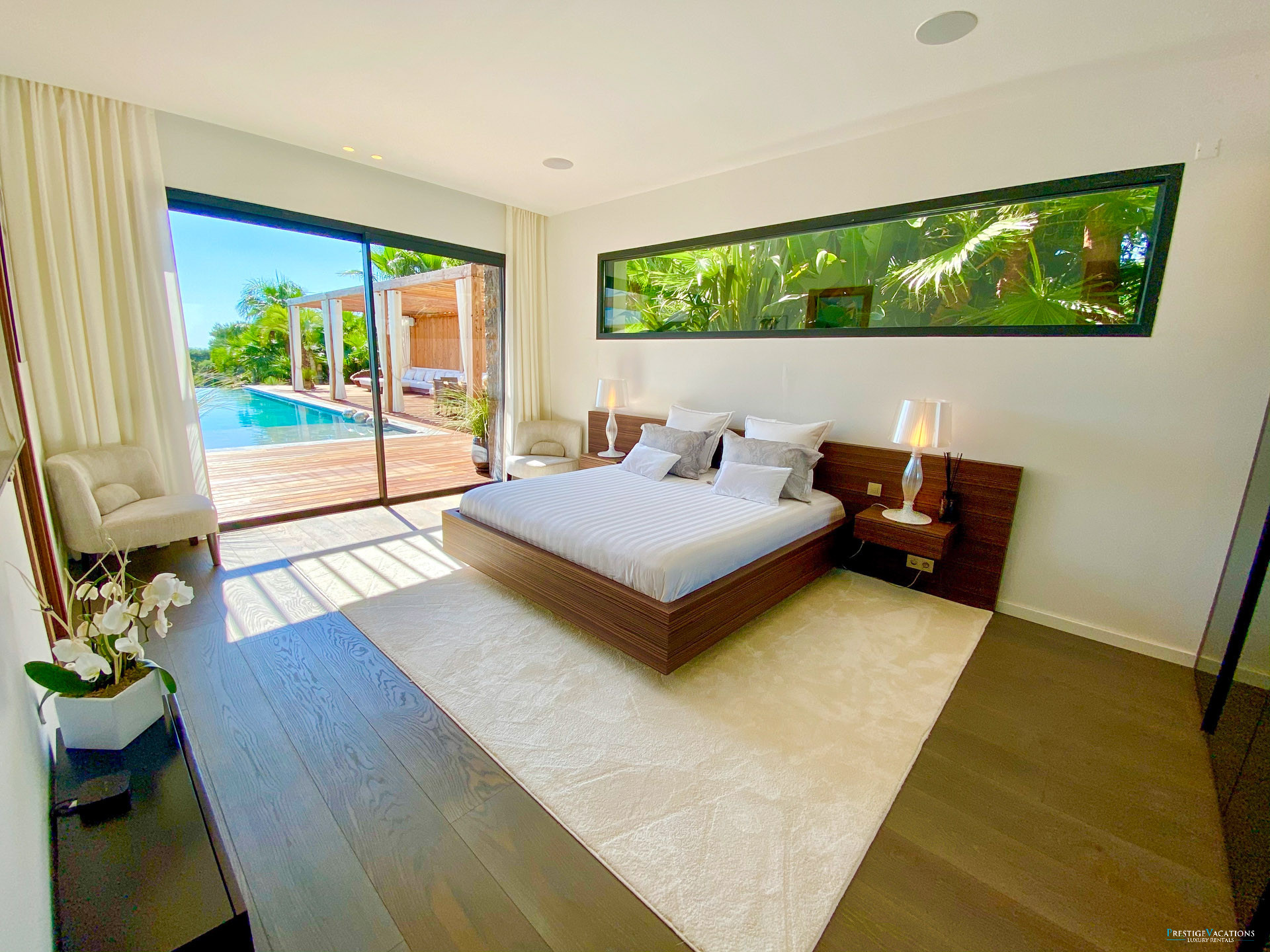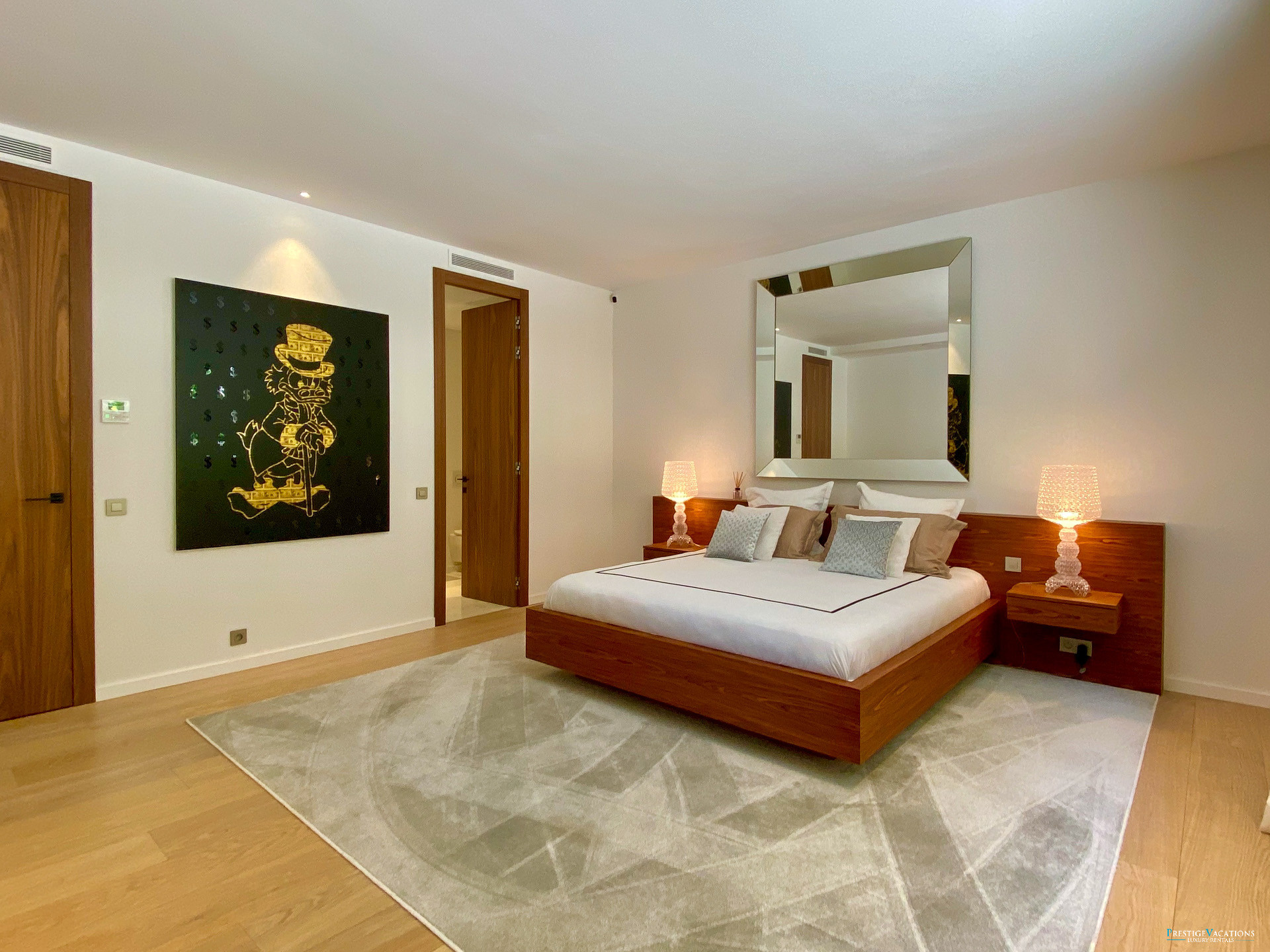 The property features six elegant rooms, each equipped with a king-size bed, a private bathroom and high-end amenities such as a connected television, minibar and safe. The master suite located upstairs benefits from a private terrace and a luxurious bathroom with double shower and island bathtub. An independent windowless apartment completes the ensemble, ideal for accommodating staff or additional guests. This configuration allows for comfortably hosting family, friends or guests in the context of a luxury villa rental in Mougins near Cannes.
