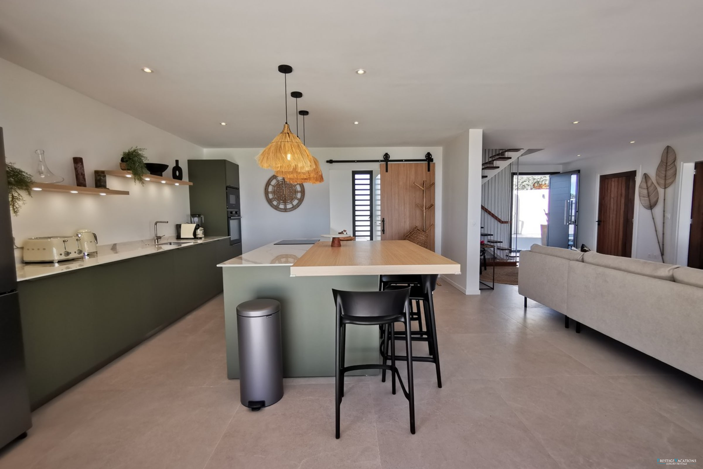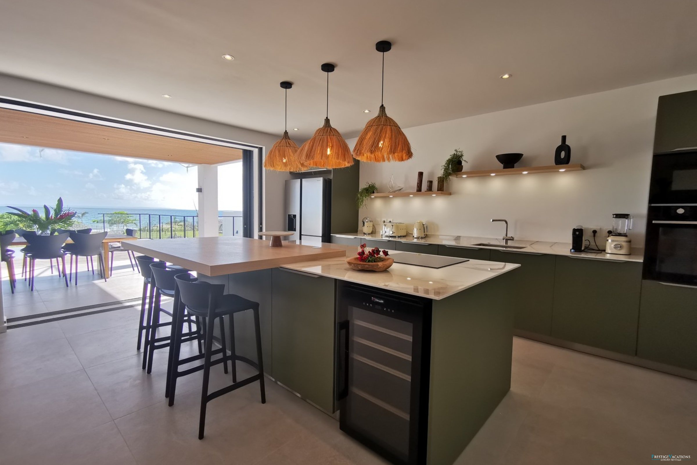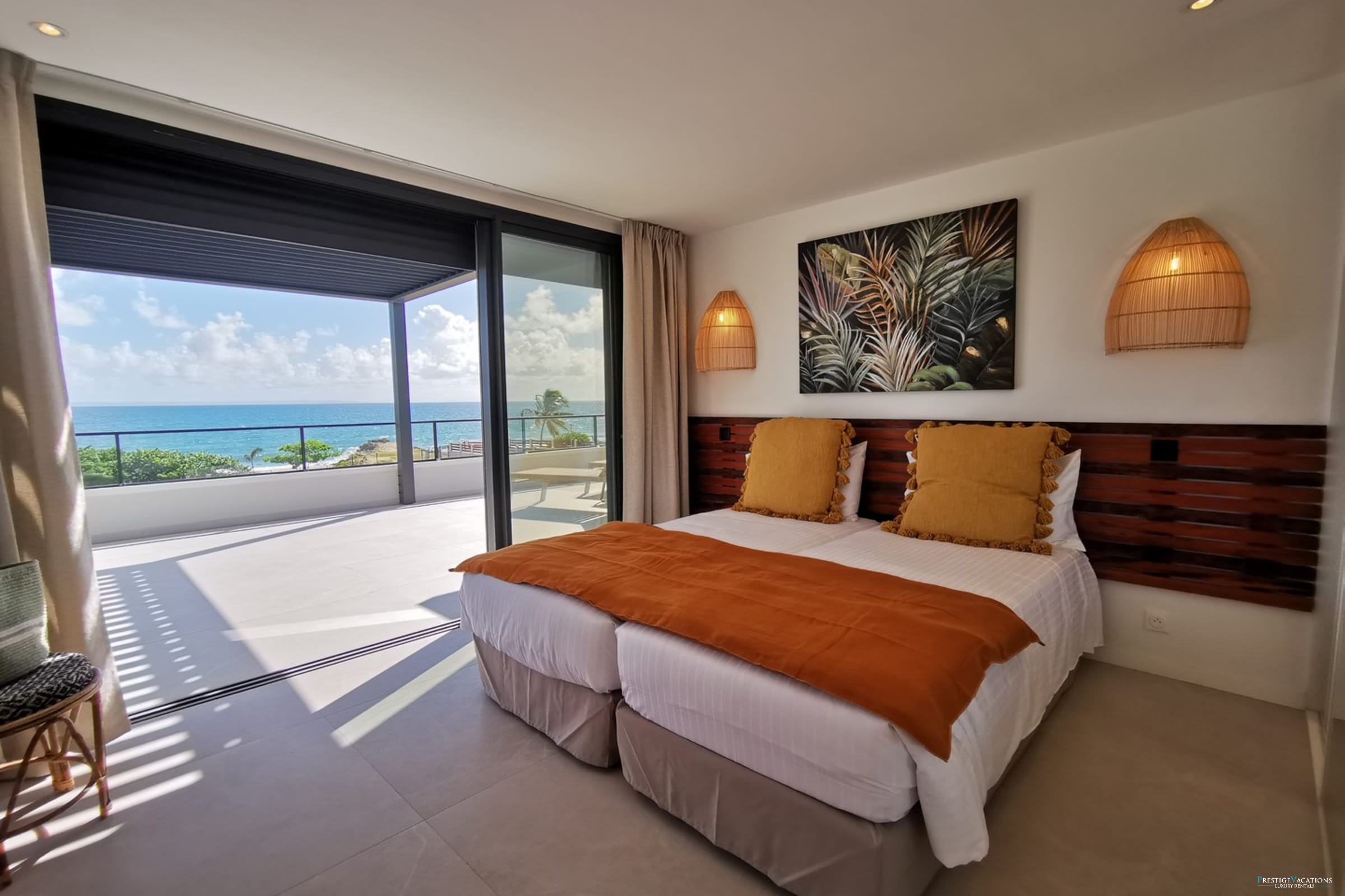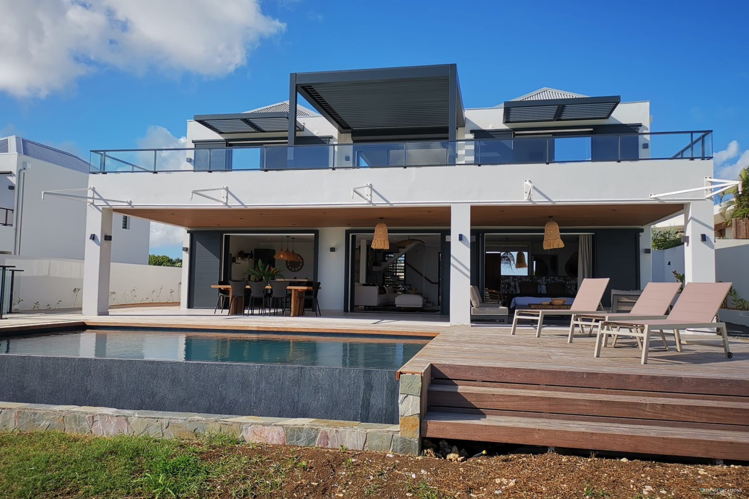 Entirely facing the sea, the villa captivates from the entrance with its luminous volumes and elegant contemporary decoration. The vast living space on the ground floor brings together a comfortable lounge and a fully equipped modern kitchen, organised around a large central island. The whole naturally opens onto the outdoor terrace, a true extension of the house, where one shares meals facing the lagoon, lulled by the trade winds. The private garden leads directly to the beach, offering a rare luxury villa rental experience in Saint-François with direct access to the sea.