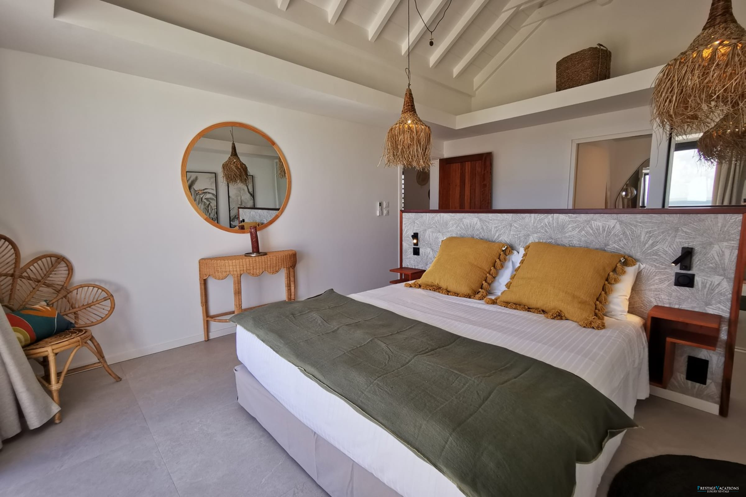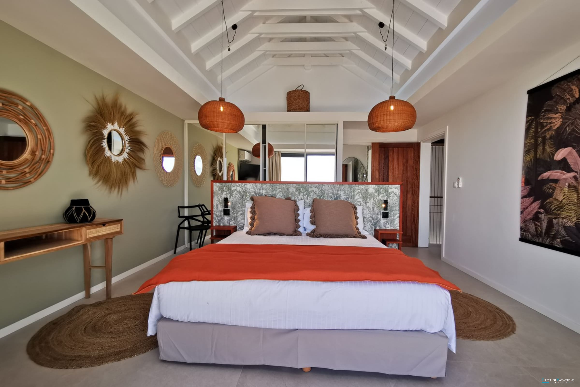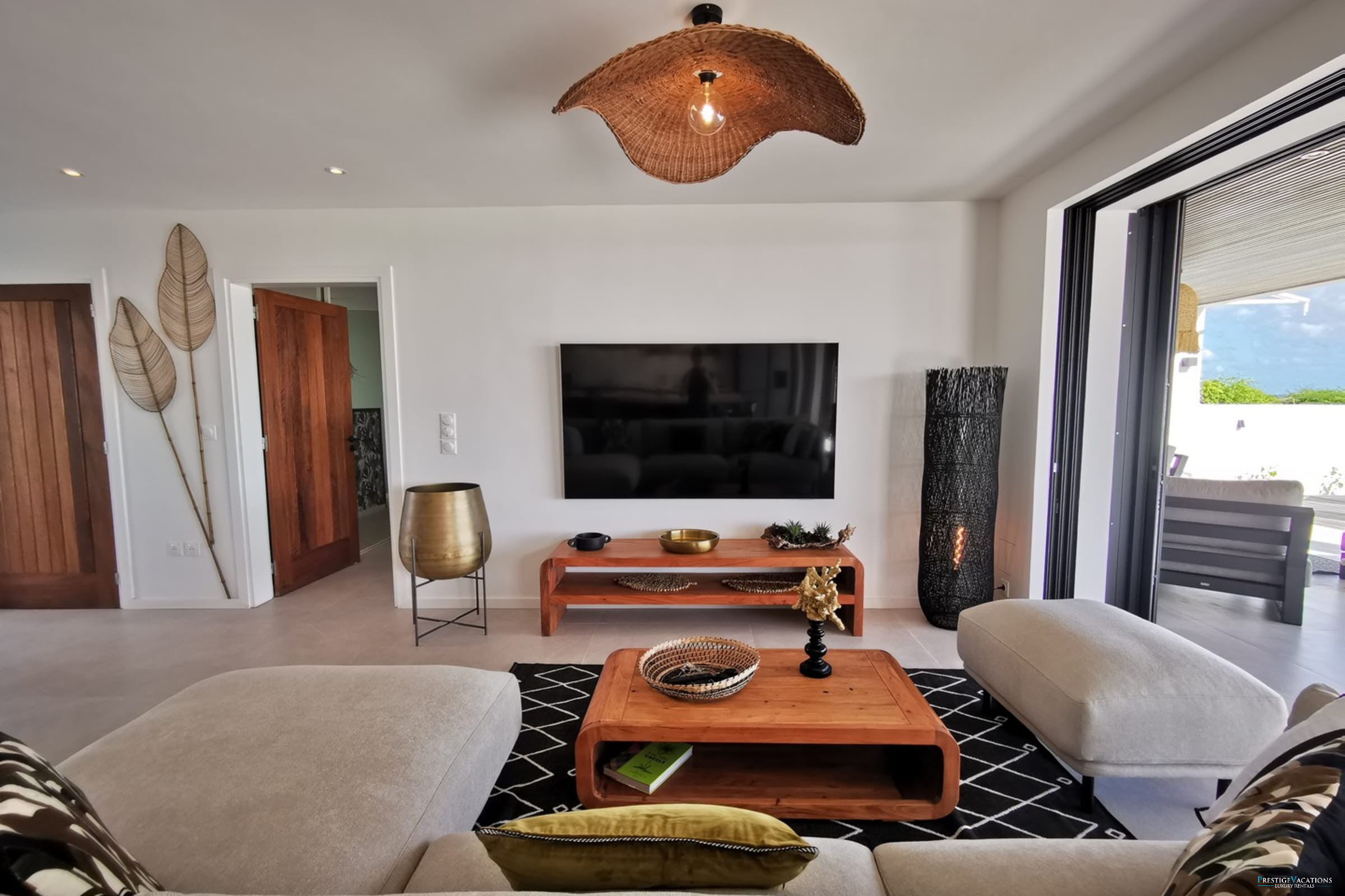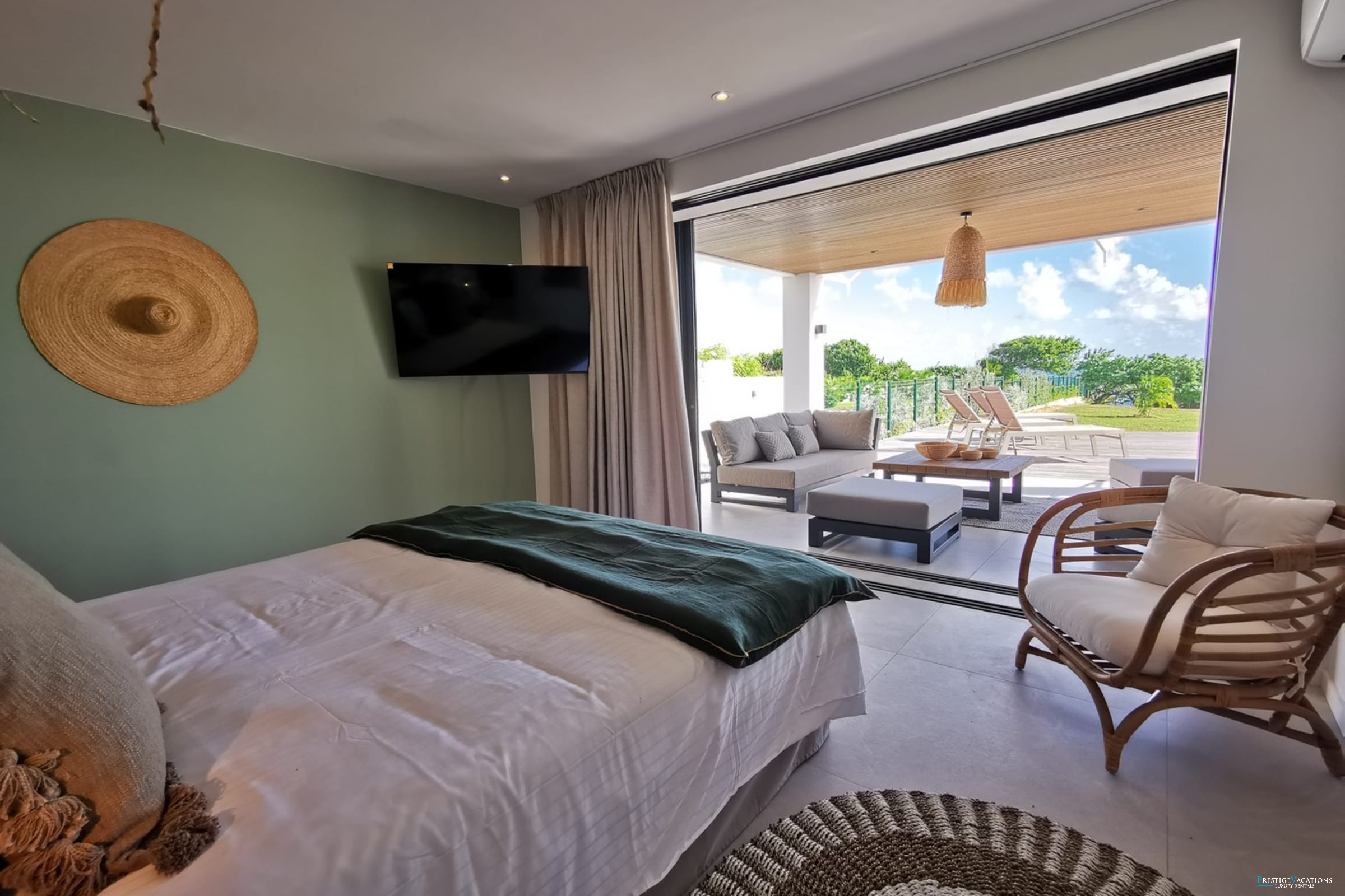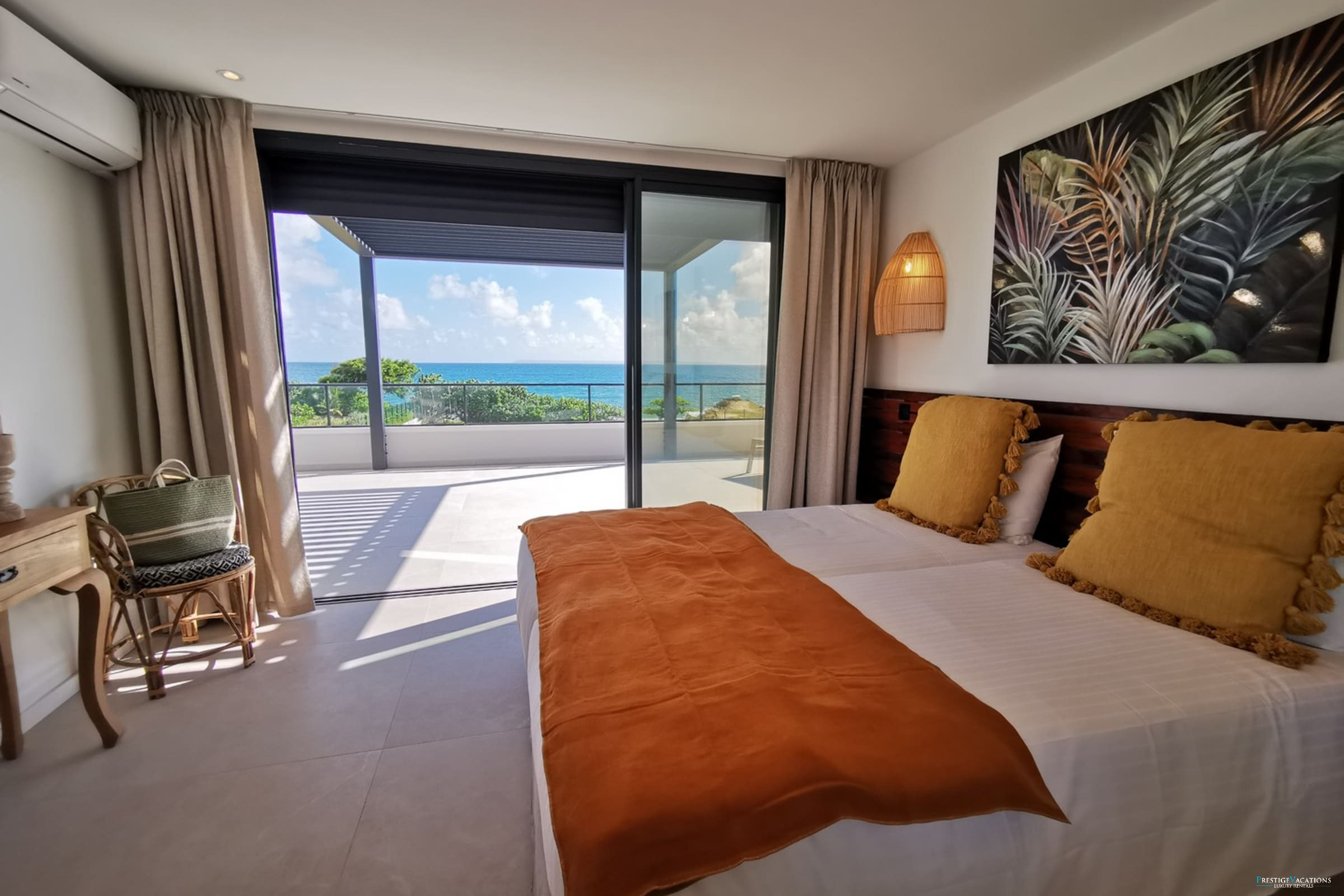 Entirely facing the sea, the villa captivates from the entrance with its luminous volumes and elegant contemporary decoration. The vast living space on the ground floor brings together a comfortable lounge and a fully equipped modern kitchen, organised around a large central island. The whole naturally opens onto the outdoor terrace, a true extension of the house, where one shares meals facing the lagoon, lulled by the trade winds. The private garden leads directly to the beach, offering a rare luxury villa rental experience in Saint-François with direct access to the sea.