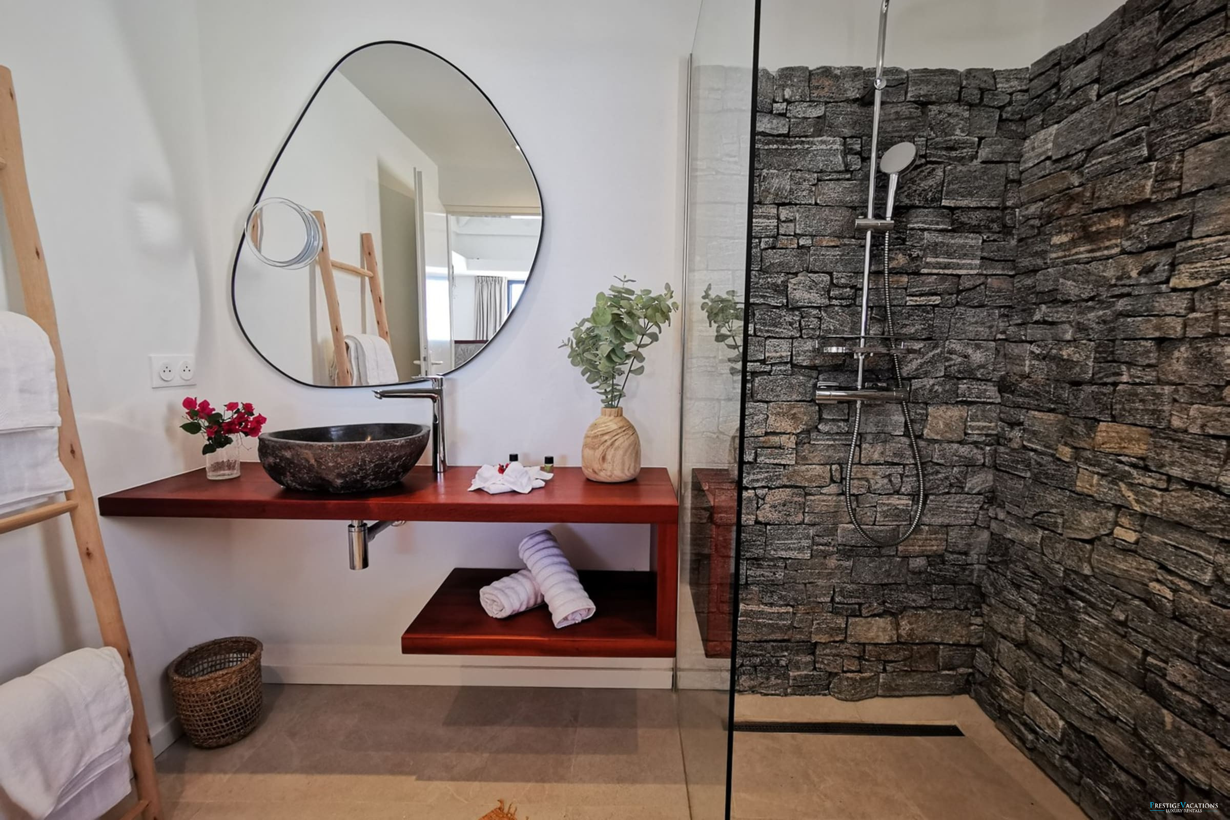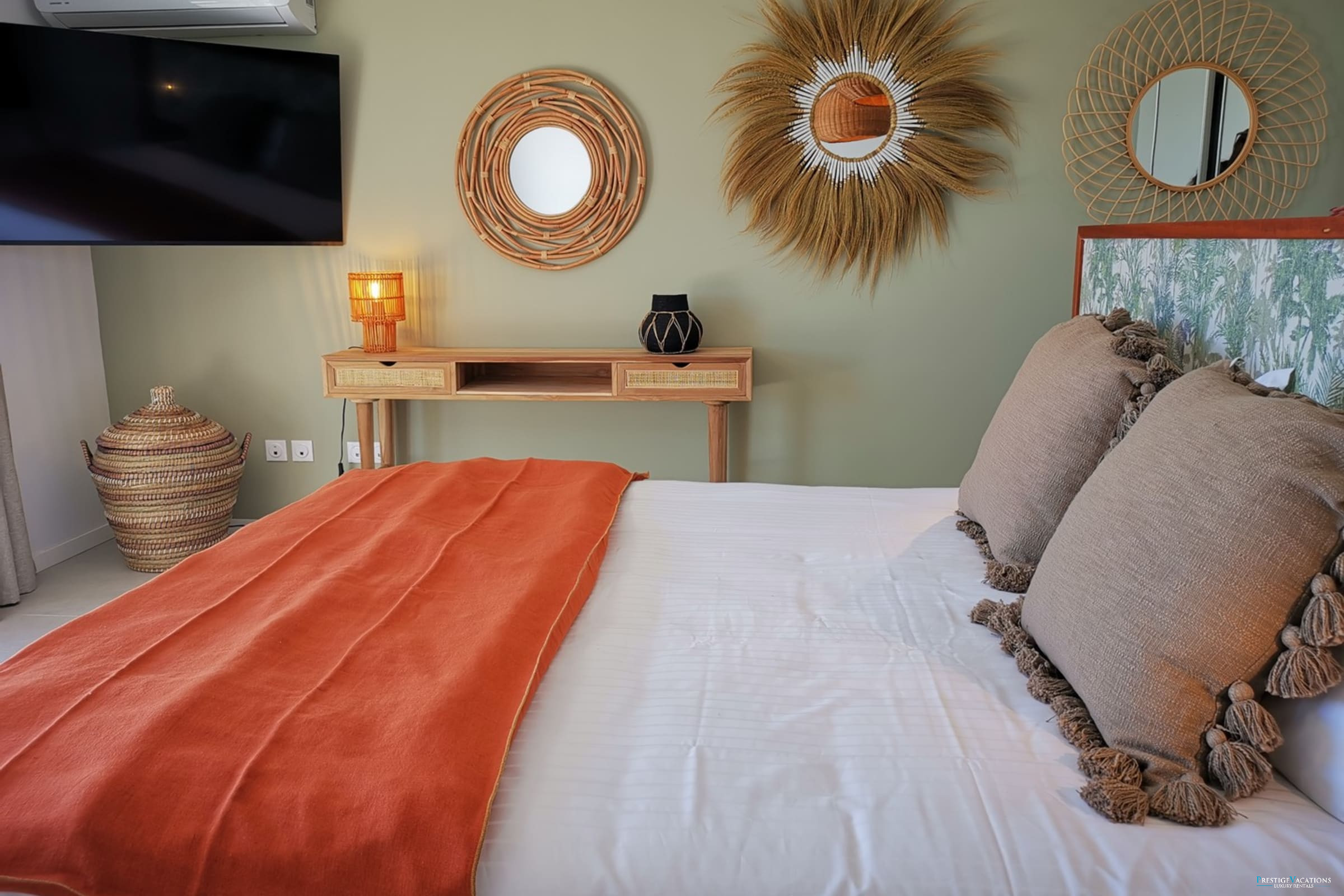 Villa Isabelle has four air-conditioned rooms, all designed to offer privacy and comfort. One room is located on the ground floor, with sea and pool views, while the other three rooms are on the upper floor and enjoy an unobstructed view of the sea and garden. Each room is equipped with its own shower room with toilet, storage space, and a television. The beds, which can be configured as twin or king-size, allow for flexible arrangements according to travellers' needs.