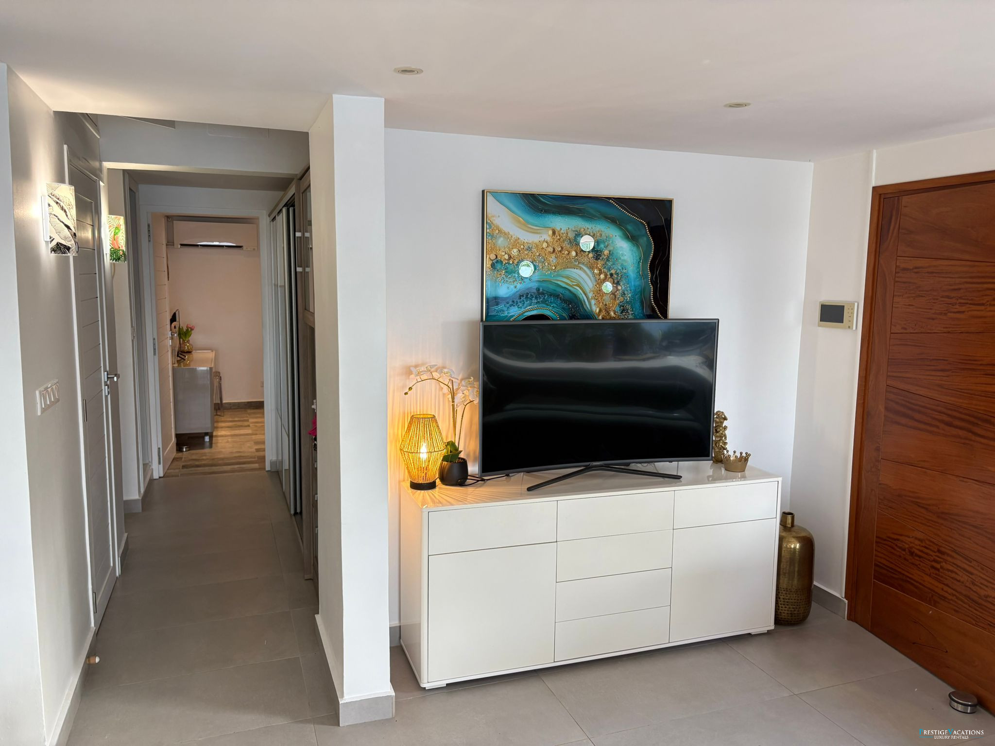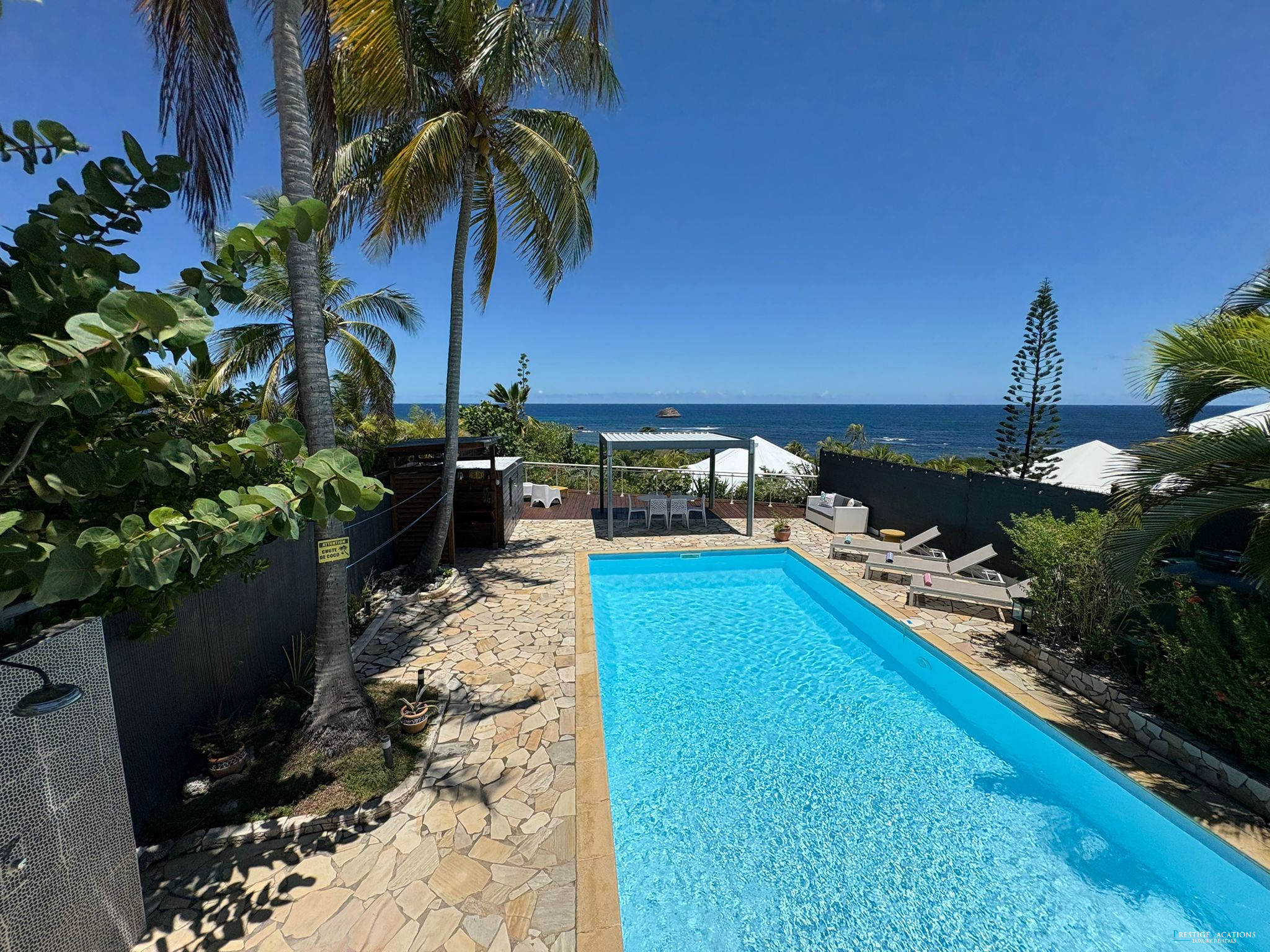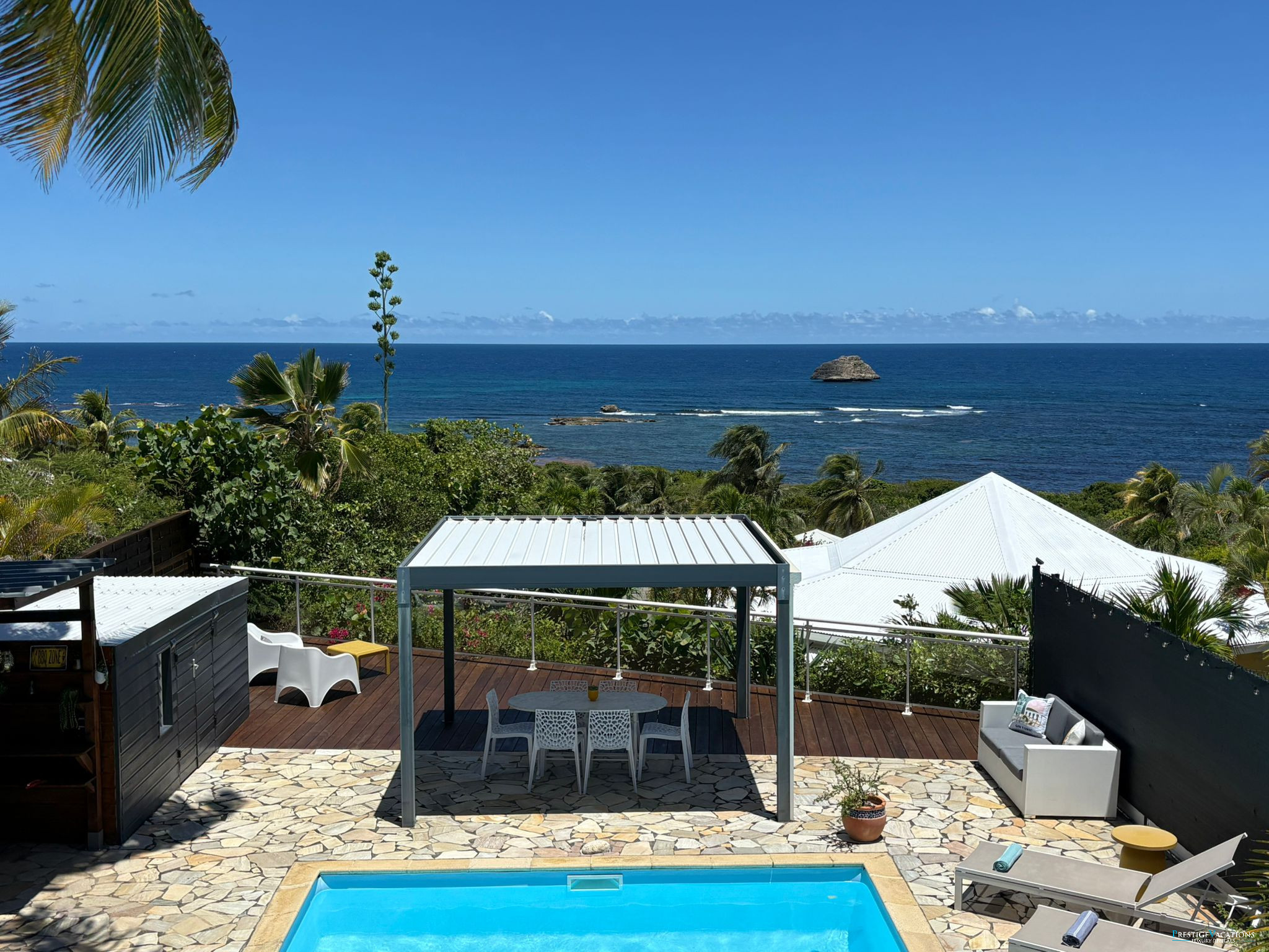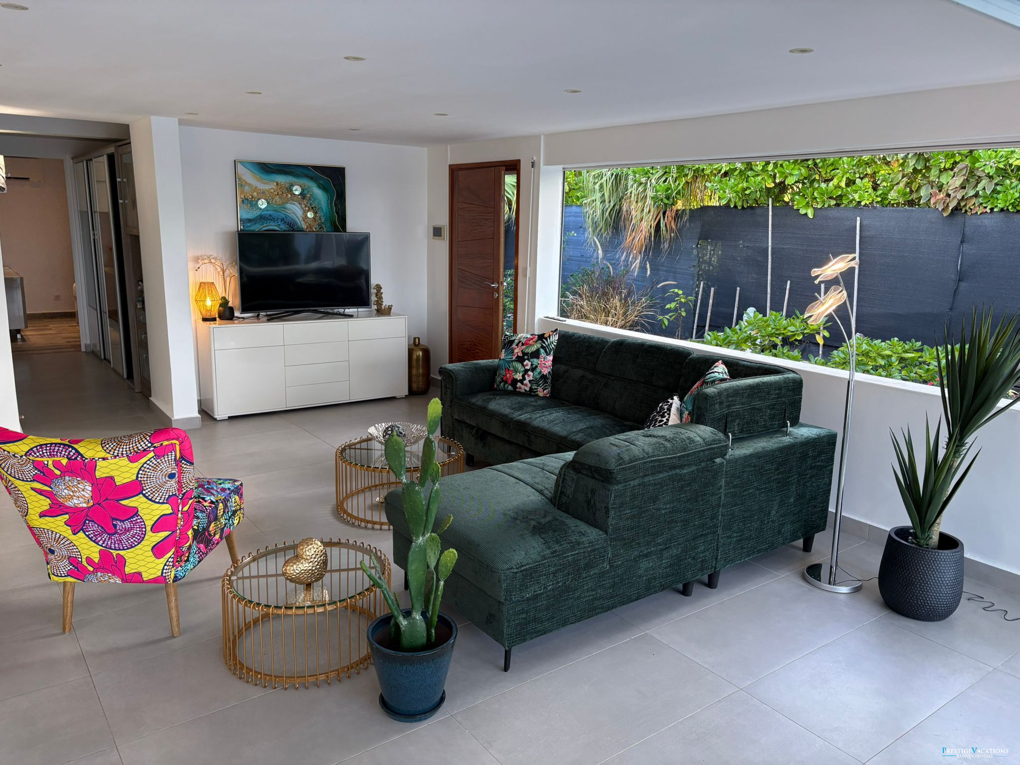 Villa Katorz is a charming villa in Guadeloupe located in Saint-François, offering a panoramic sea view and a beautiful 5x10m private salt water swimming pool. Designed for peaceful stays, this villa rental in Saint-François combines modern comfort and Creole atmosphere in a lush and intimate setting. The spacious living area opens onto a covered terrace overlooking the pool and a carbet, perfect for enjoying the softness of Guadeloupean evenings facing the sea.