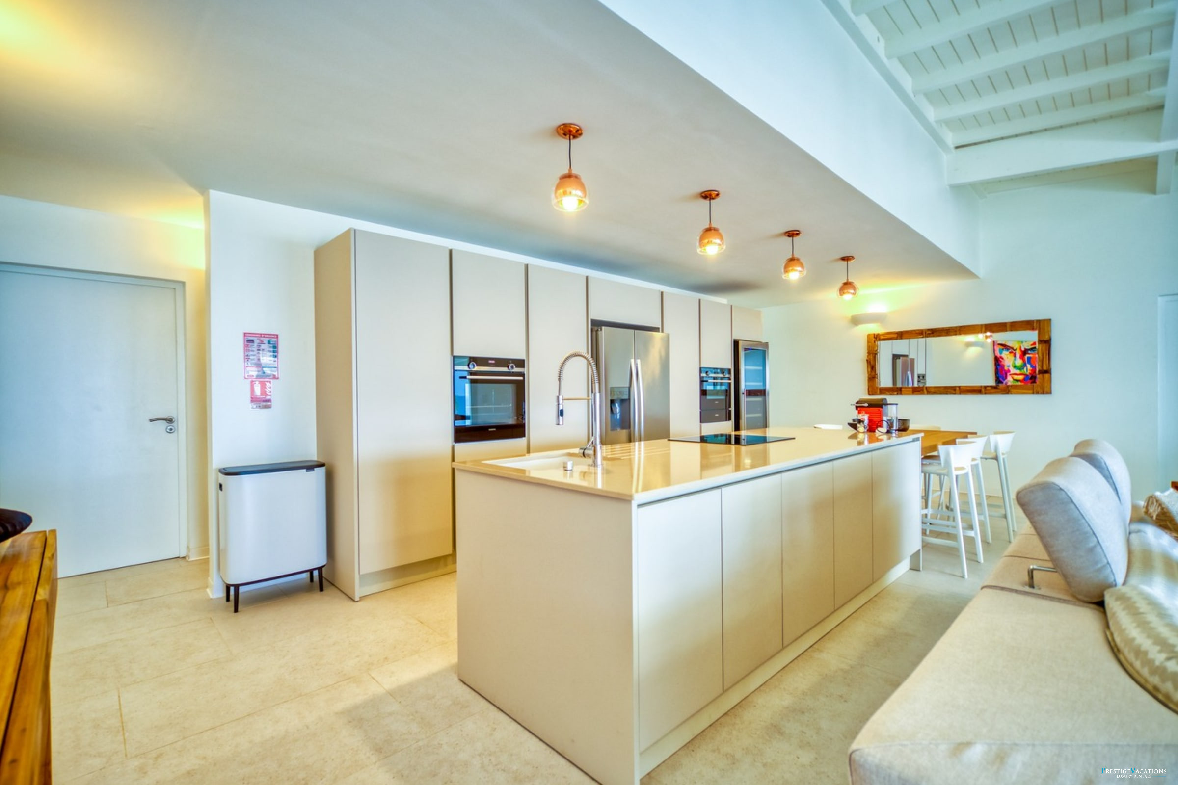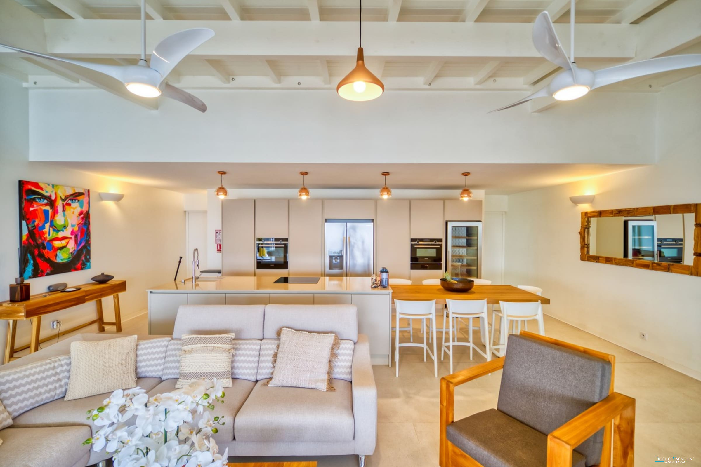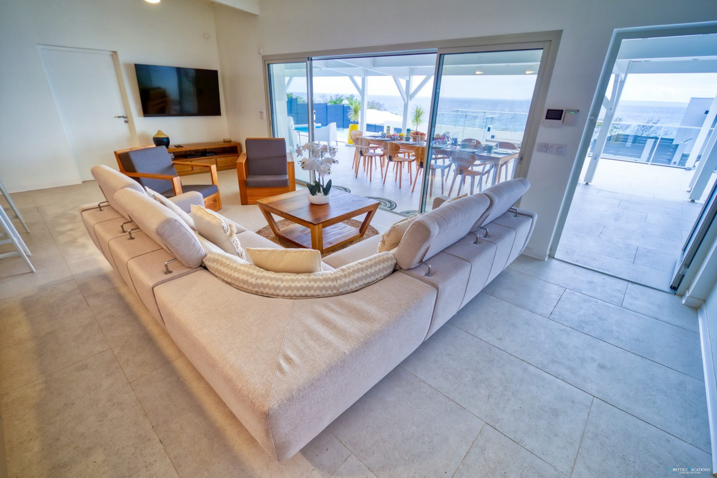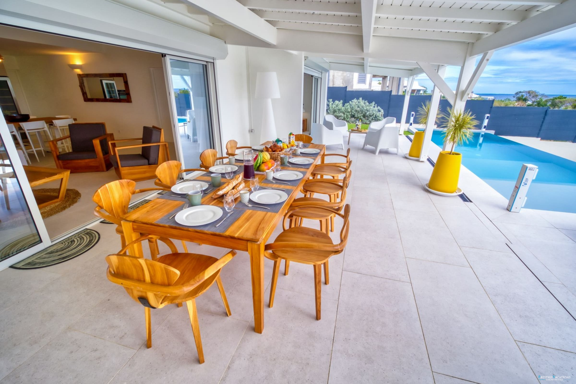 The heart of the villa is organised around a vast, convivial living space bathed in light. The custom-made kitchen, fully equipped with high-end appliances, wine cellar, American fridge, Nespresso coffee machine, double ovens and dishwasher, invites both family meal preparation and the organisation of a private Creole cooking class. It naturally opens onto the living room and terrace, where a large table comfortably accommodates up to ten guests facing the sea and the Guadeloupean horizon.