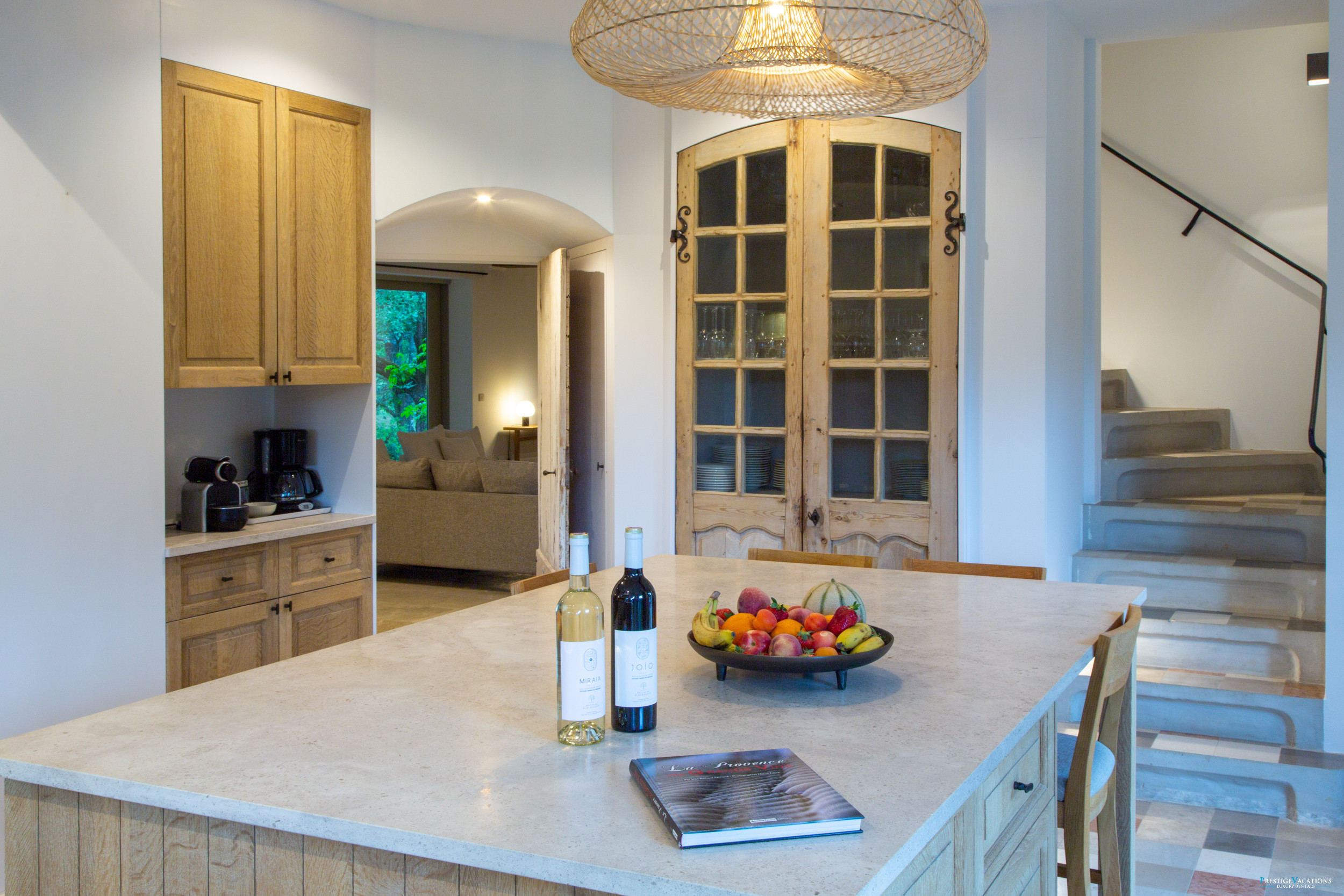 At the heart of the home, a stunning kitchen with a central island, cold room, and an array of appliances opens onto captivating views of the swimming pool on one side and a tree-lined valley with vineyards on the other. This space is designed for shared experiences, whether preparing meals, discovering the richness of Provençal cuisine, or simply enjoying the beauty of the surroundings. The dining room, framed by large bay windows overlooking the woods, enhances this connection to nature, while a small study with views of the cask cellar and a separate television room offer quiet corners for reflection.