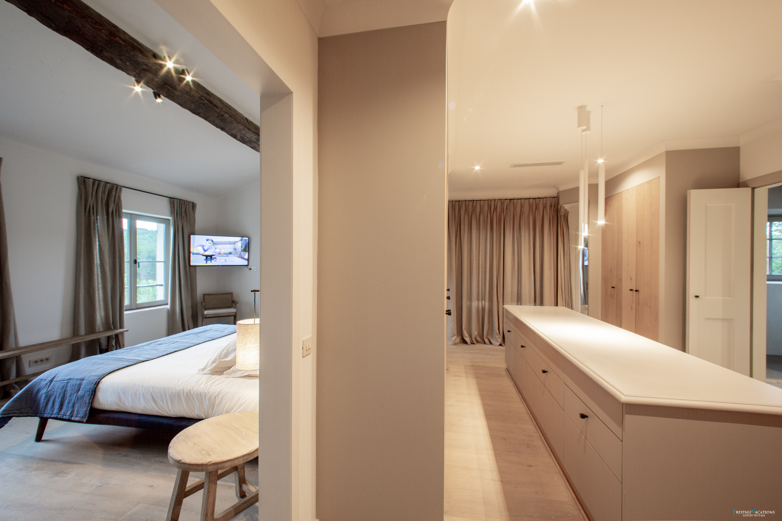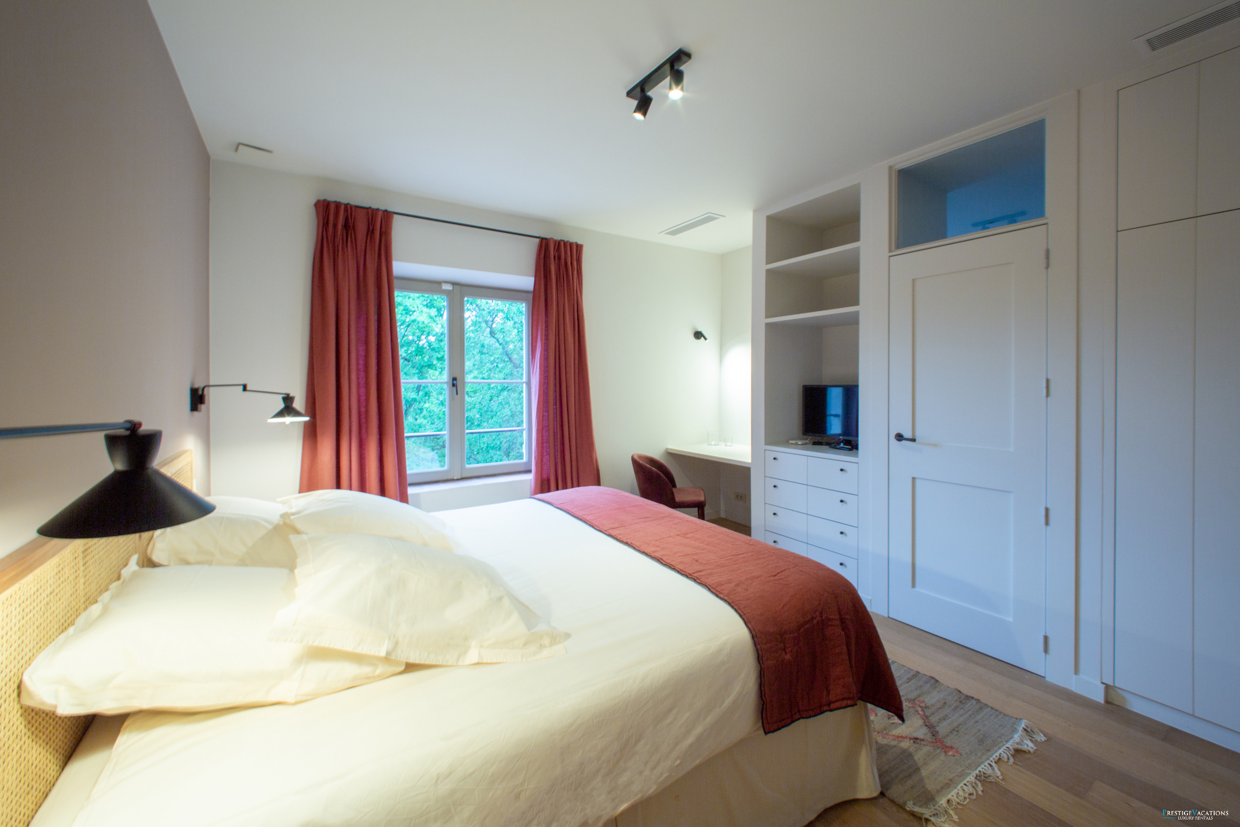The villa accommodates guests across beautifully appointed bedrooms, each offering privacy and views over the surrounding woodland or the swimming pool. The expansive master suite features a large dressing room and an ensuite bathroom with both bath and shower, and is complemented by an adjoining children’s bedroom. Four additional generously sized bedrooms each include air conditioning, a television, a shower room, and a private toilet, ensuring comfort and independence for every guest.
